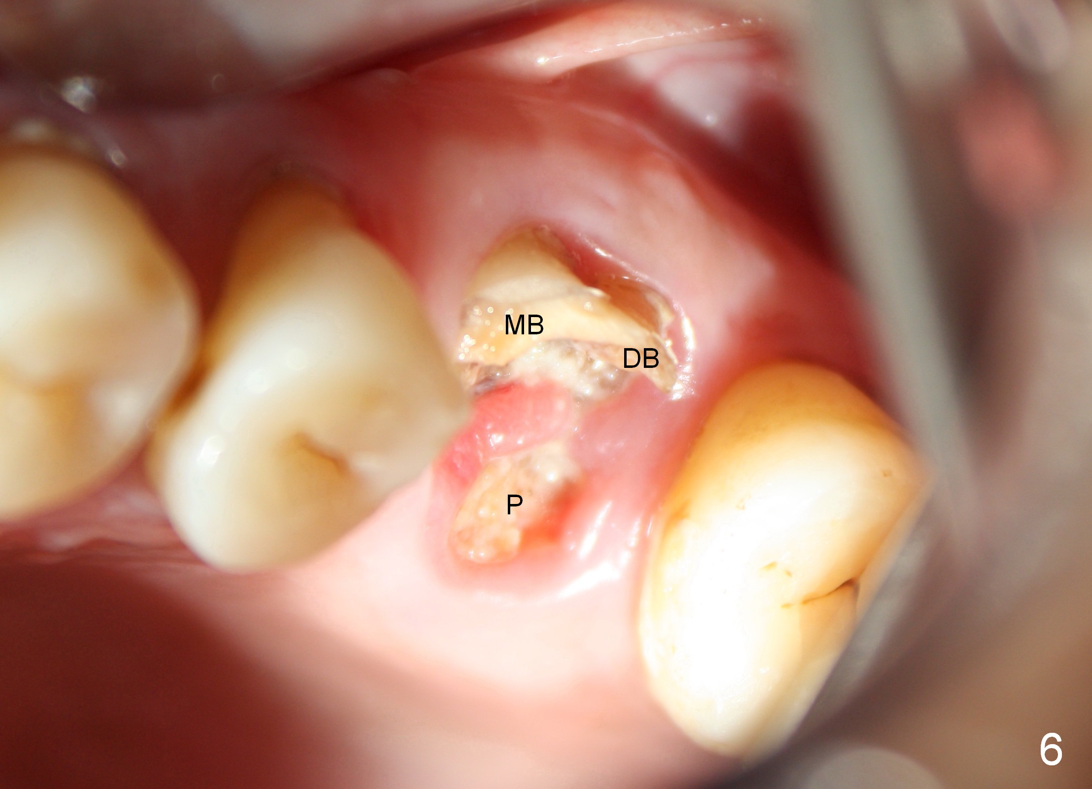 It appears that the palatal root (Fig.6 P) is separated from the buccal ones (MB, DB). Connection between the latter appears to be weak (Fig.2) and could be broken using proximators or small straight elevator.