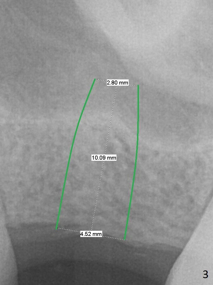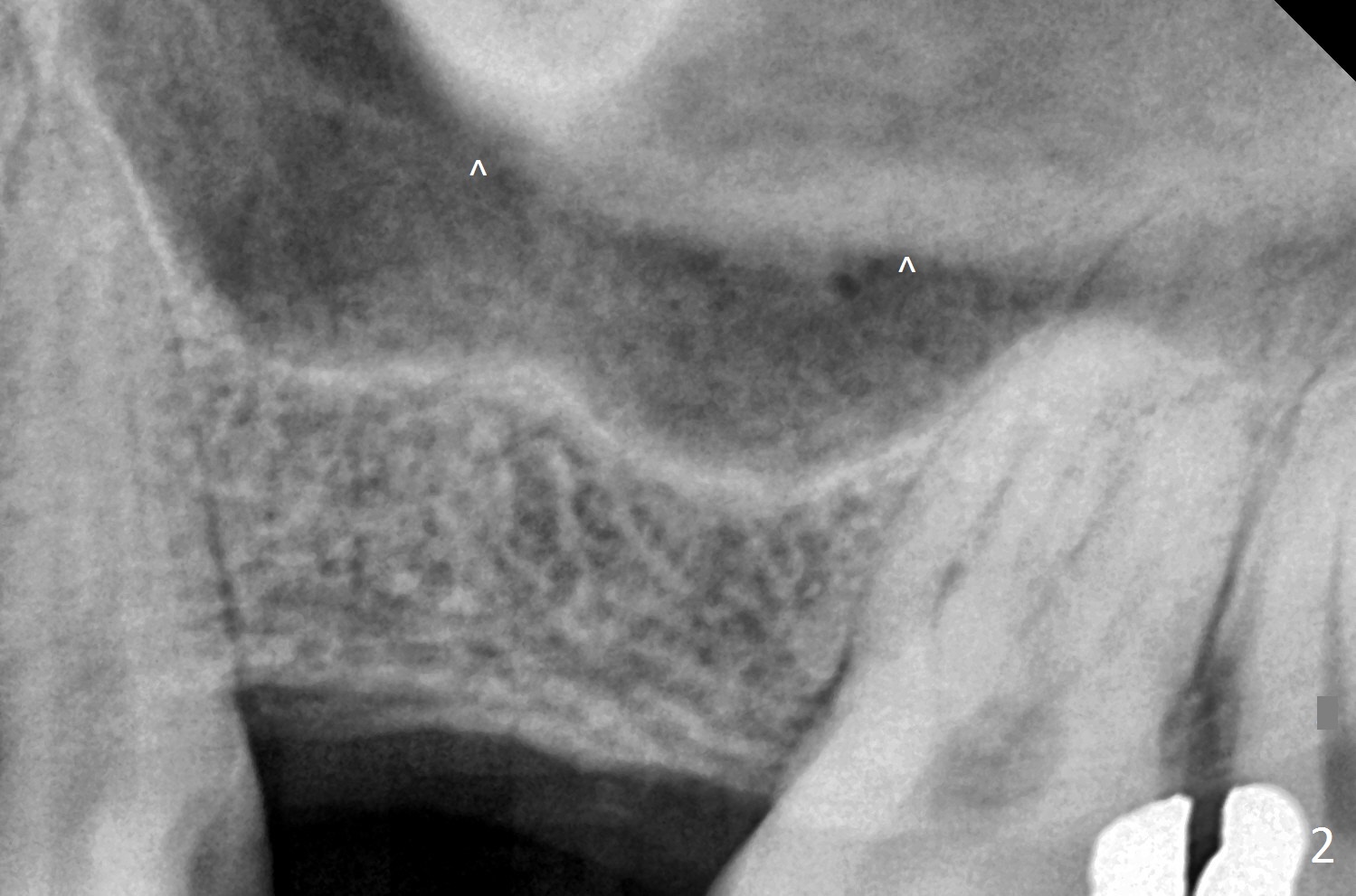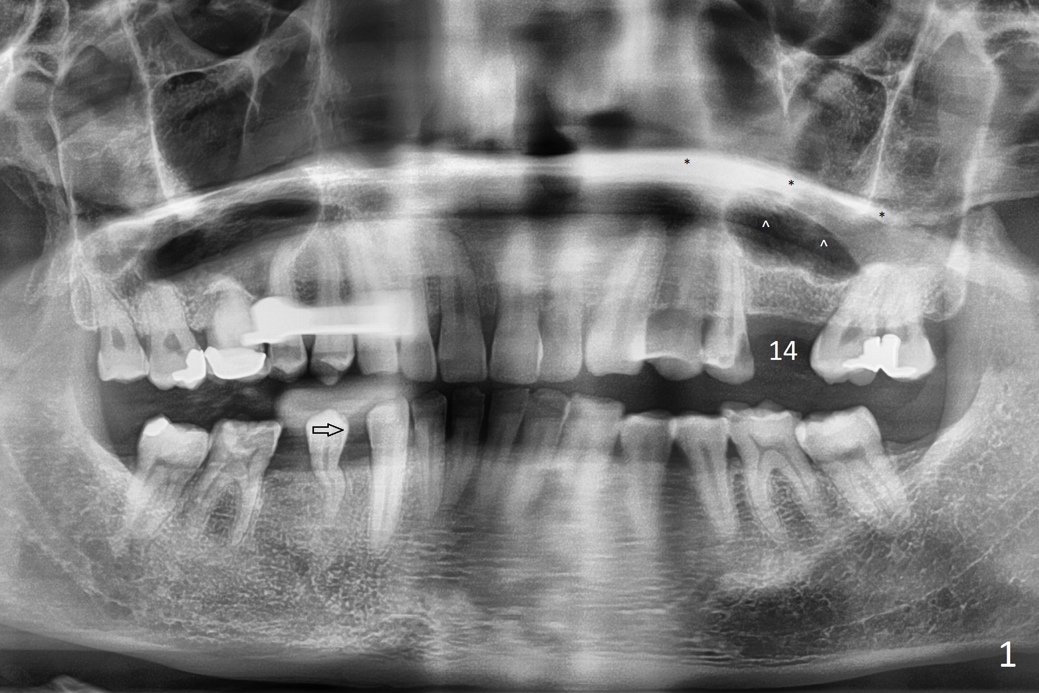A 47-year-old man agrees implant at #14 (Fig.1). He worries about the bone height. There appear to be 2 layers of the sinus floor (Fig.1,2 (arrowheads: upper one)). The horizontal plate of the palate is indicated by *. An IBS implant will be placed between the 2 layers of the sinus floor as shown in Fig.3. Osteotomy is initiated with Magic Split, followed by Magic Expanders (initial depth 9 mm gingival level) or Magic Lifter. Before placing the implant, insert PRF and Allograft with a condenser with a stopper.