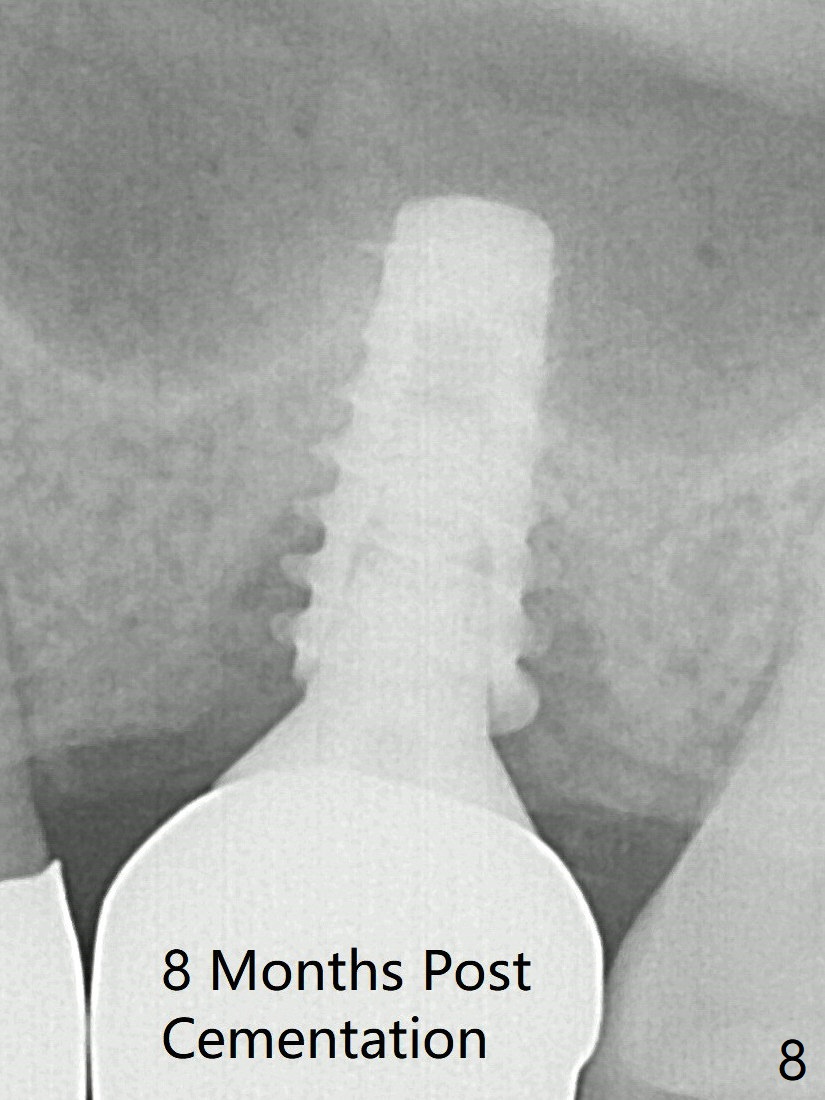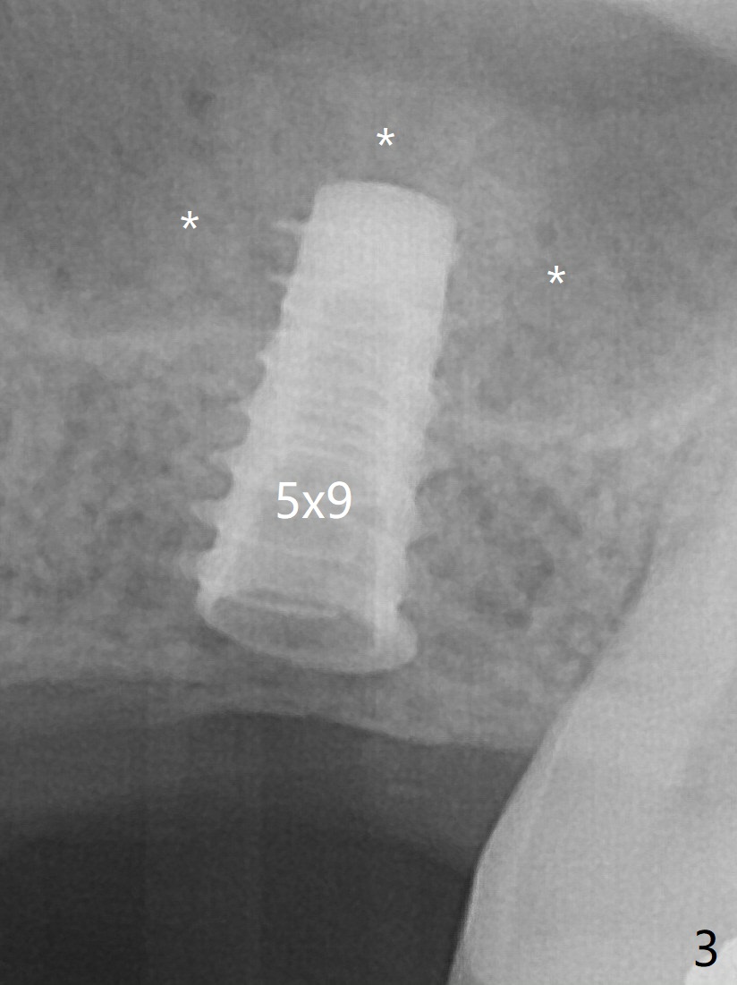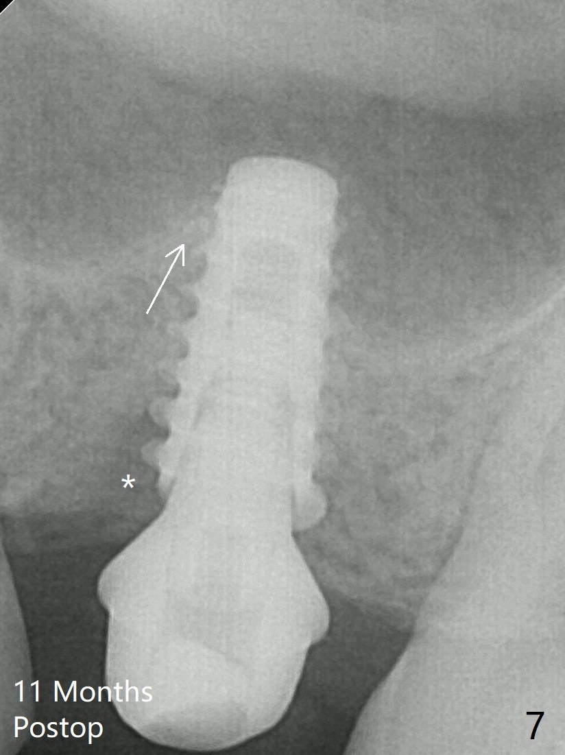 After insertion of a 4.5x11 mm dummy implant at 9 mm (35 Ncm; for further bone expansion), one piece of PRF plug and 1 piece of PRF membrane are pushed into the osteotomy, followed by allograft mixed with autogenous bone for sinus lift (*) and placement of a 5x9 mm implant (Fig.3,4 with insertion torque >50 Ncm). The implant appears to have been placed too deep. In fact a BW shows otherwise. There is mild bone resorption at the crest 11 months postop (Fig.7 *). Although the sinus lift with bone graft becomes less distinct, there is more implant/bone contact mesial (arrow). The bone resorption seems to be worse 8 months post cementation (Fig.8,9); in fact the abutment screw is loose. The gingiva is healthy.