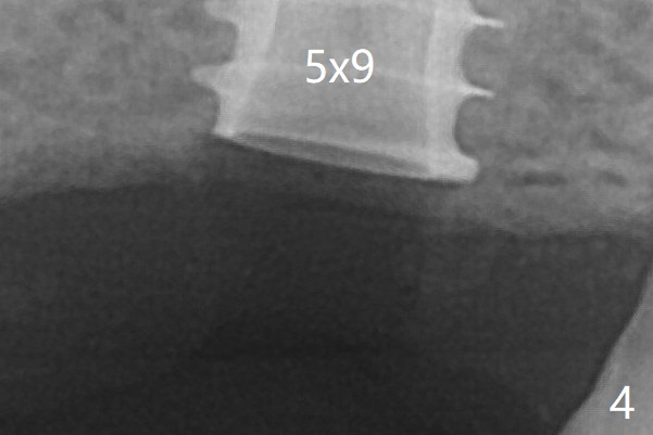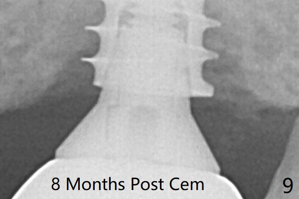 A BW shows that the implant is placed slightly subcrestal (Fig.4). The bone resorption seems to be worse 8 months post cementation (Fig.8,9, compare Fig.7); in fact the abutment screw is loose. The gingiva is healthy.