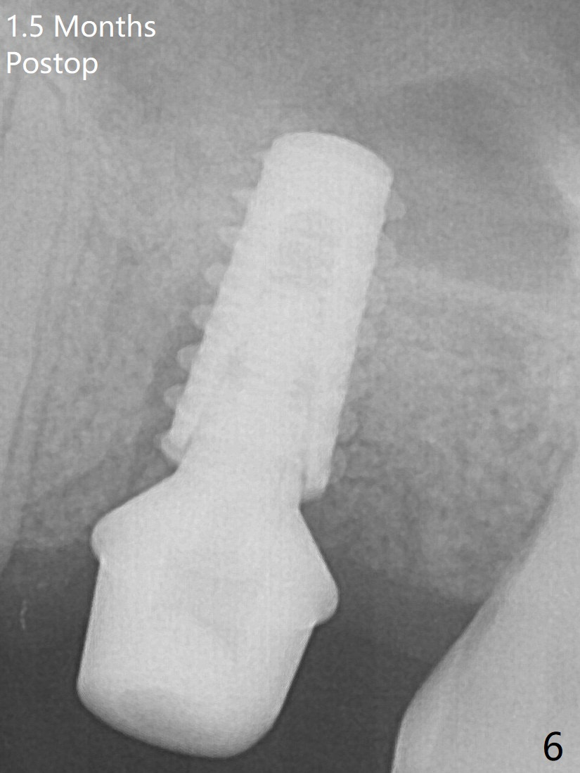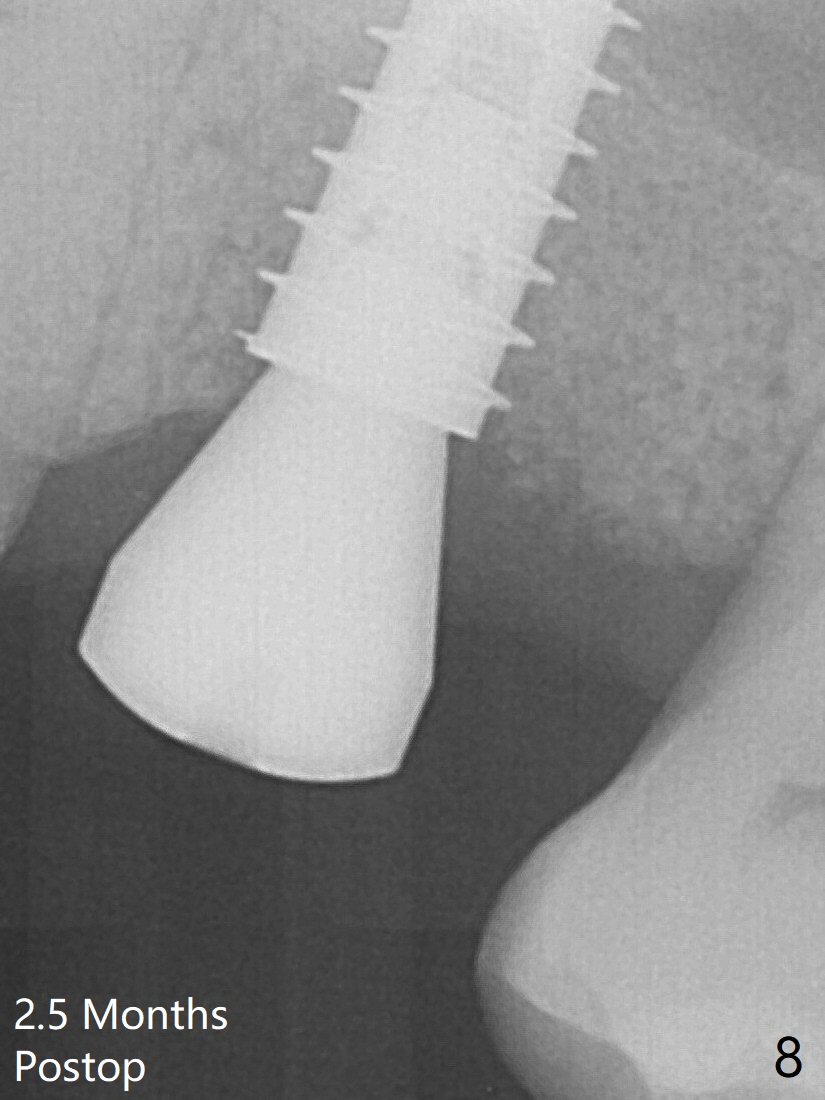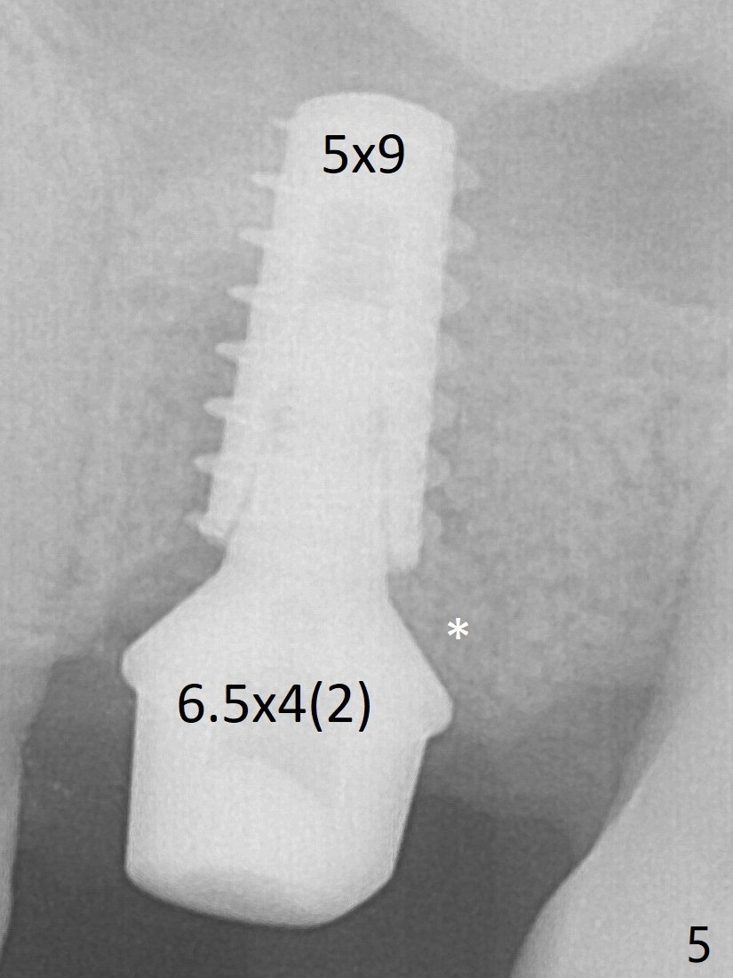 A 5x9 mm implant is placed slightly mesial; after placement of a 6.5x4(2) mm abutment and insertion of collagen plug in the palatal socket (radiolucent area distal to the implant), Vera graft is placed in the remaining socket space (Fig.5 *). Nasal hemorrhage persists 1.5 months postop (Fig.6). The distal gingiva is slightly tender and erythematous; a 6x4 mm healing abutment is placed 2.5 months postop (Fig.8).