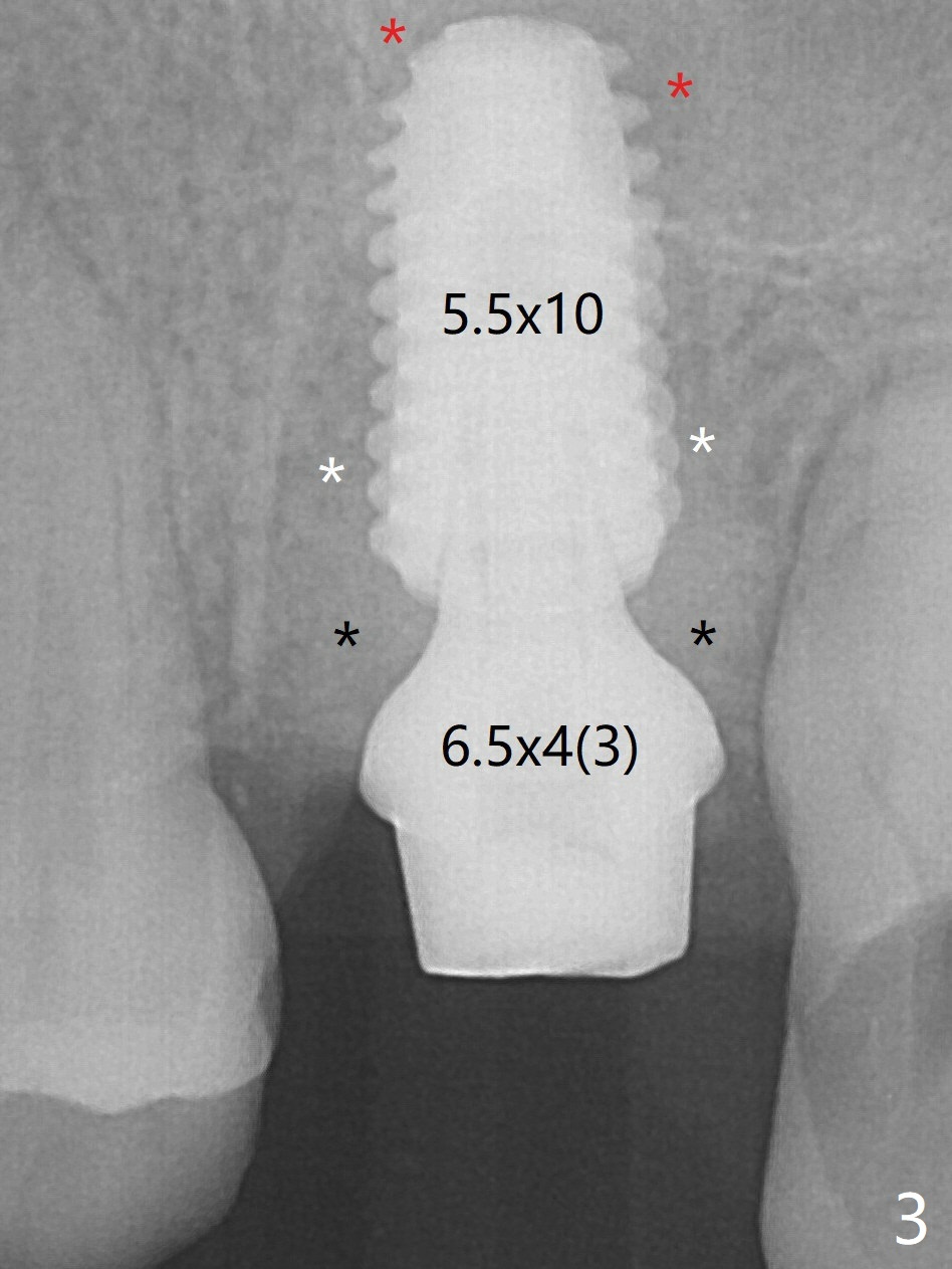 Following sinus lift with Vera Graft with autogenous bone (Fig.3 red *), a 5.5x10 mm implant is placed ~ 1 mm coronal to the septal crest and 1-3 mm apical to the surrounding crest (mesiodistobuccopalatal, >55 Ncm). After further bone graft around the implant (Fig.3 white *), a 6.5x4(3) mm abutment is inserted with the 3rd round of grafting (Fig.3,4 black *). An immediate provisional is fabricated to keep the allograft in place. The implant seems to have osteointegrated 5 months postop (Fig.5).