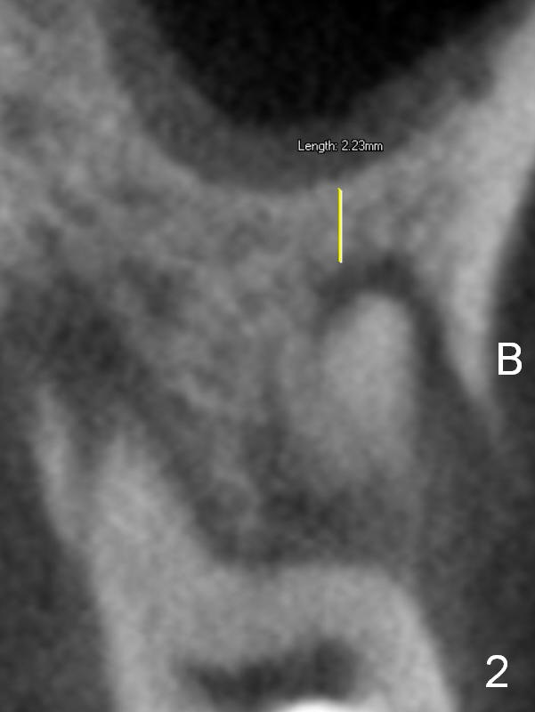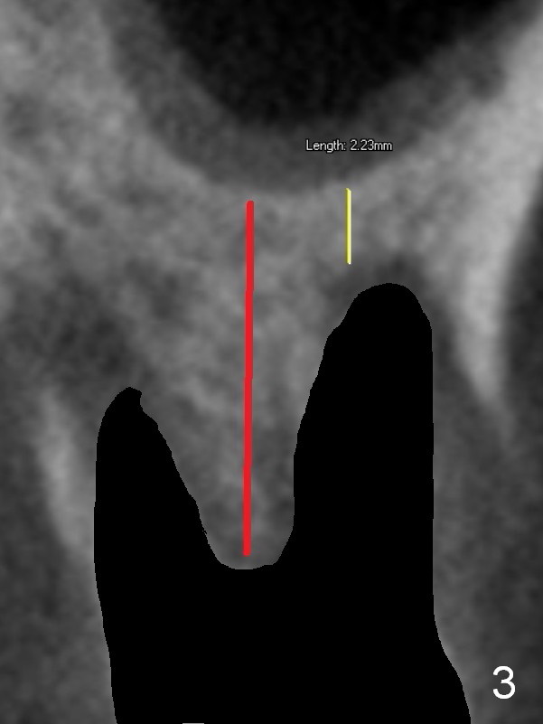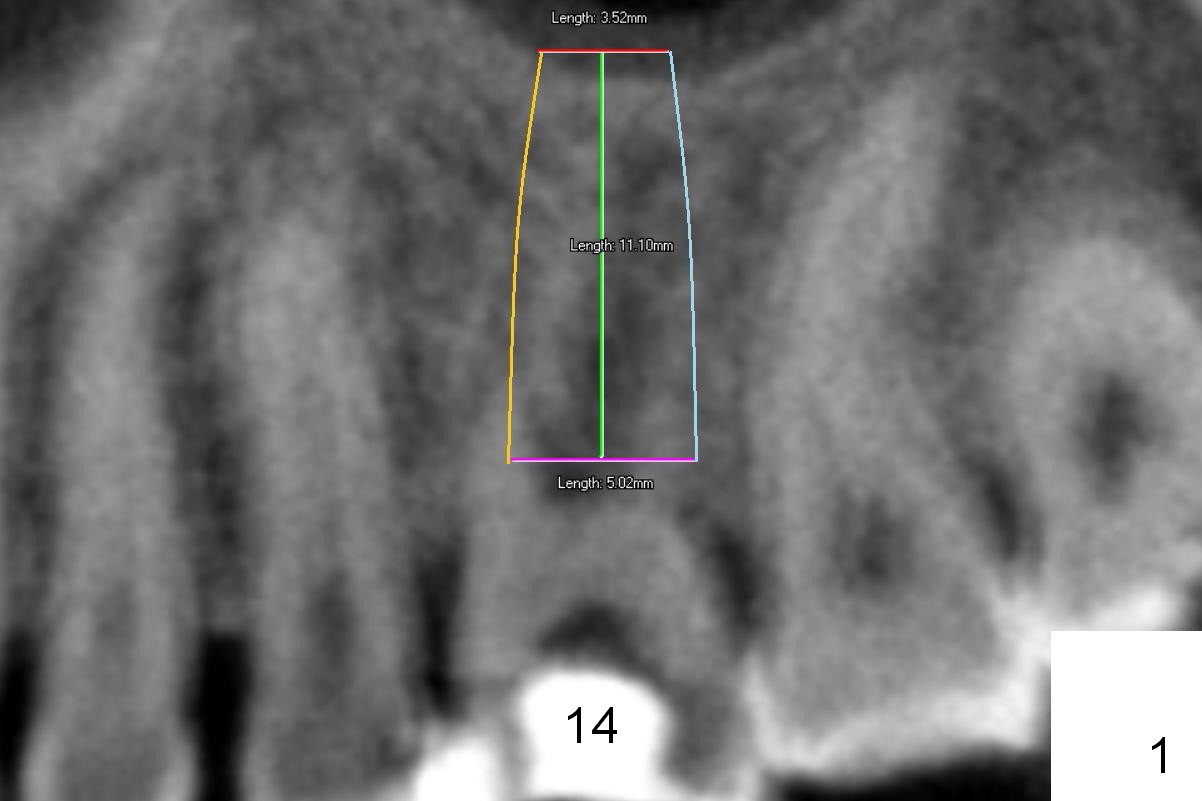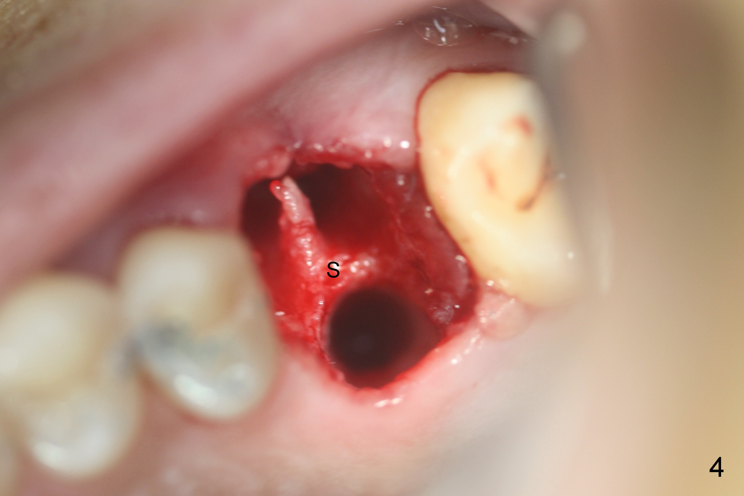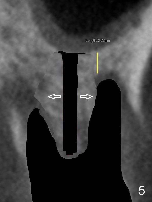 Preop CT shows that the septum appears to be able to hold a 11 mm long implant (Fig.1 sagittal section). There are periapical radiolucent lesions of the buccal (Fig.2 (coronal section) B) and palatal roots; bone height above the buccal apex is ~ 2 mm (Fig.3). When the tooth #14 is extracted, a 1.6 mm pilot drill is used to start osteotomy in the middle of the fairly thin septum (Fig.3 red line, Fig.4 S). It is hoped that Magic Expanders (ME) can enlarge the osteotomy by pushing the buccal and palatal bone plates of the septum outward (Fig.5 arrows).