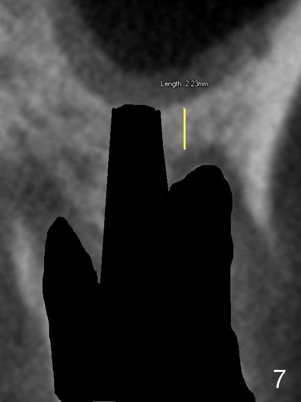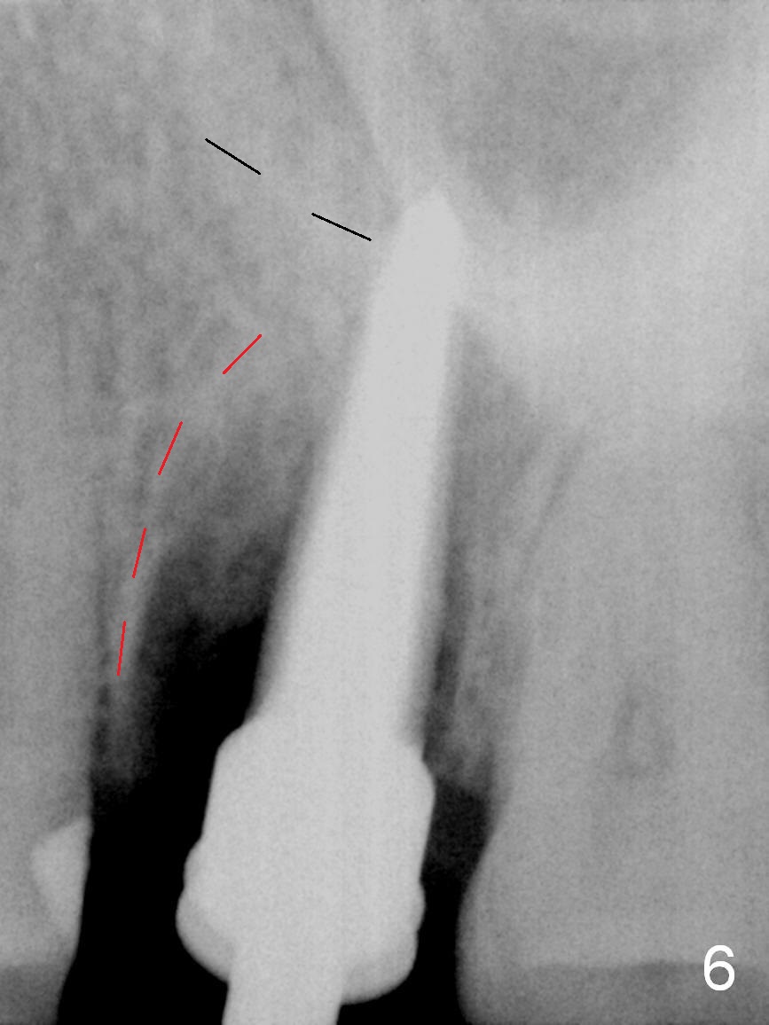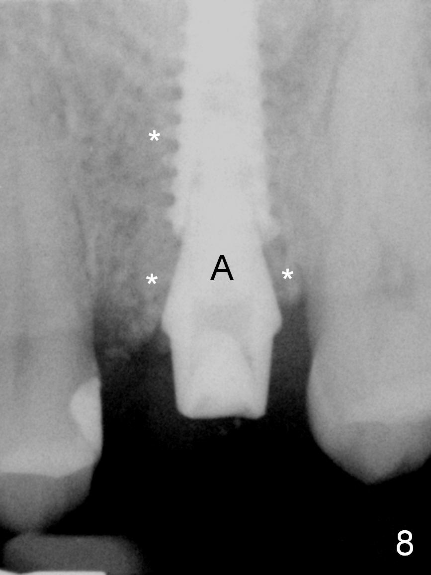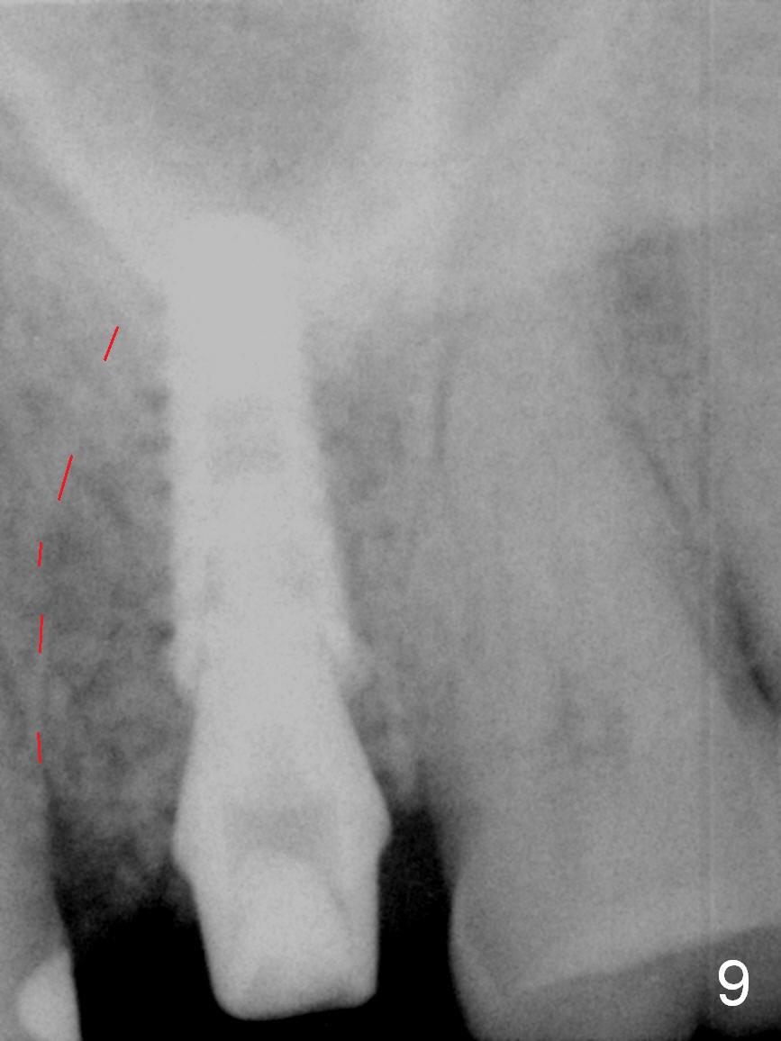 The septal bone is dense and the osteotomy is enlarged by alternating use of drills and expanders. By the time 3.8 mm ME is tapped in (Fig.6), the buccal plate of the septum is perforated. The ME is stable, in spite of the fact that it is only supported by 2-3 mm bone buccally (Fig.7). Continuously alternating use of MEs and drills leads to placement of a 5x11 mm implant with 30 Ncm insertion torque and sinus lift. After placement of bone graft (Fig.8 *) and 5x4(3) mm pair abutment (A), an immediate provisional is fabricated. Red dashed lines in Fig.6,9 represent the mesial outline of the socket, whereas black dashed in Fig.6 sinus floor. It suggests that the implant is stabilized by relatively small amount of native bone. Although IBS implants have aggressive thread patterns, a proper apical osteotomy should be prepared in the depth (perforates the sinus floor in this case) and diameter (4.3 mm drill) prior to placement.