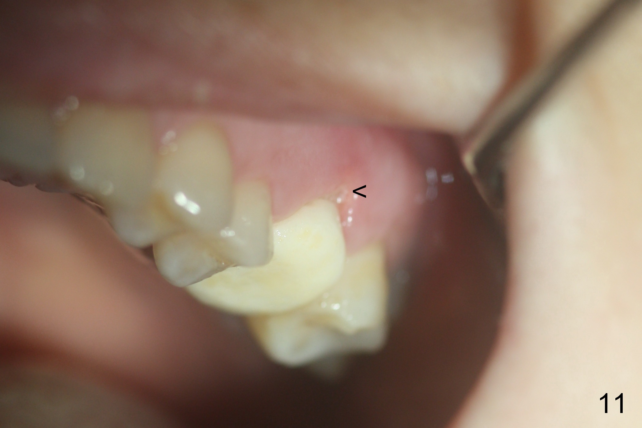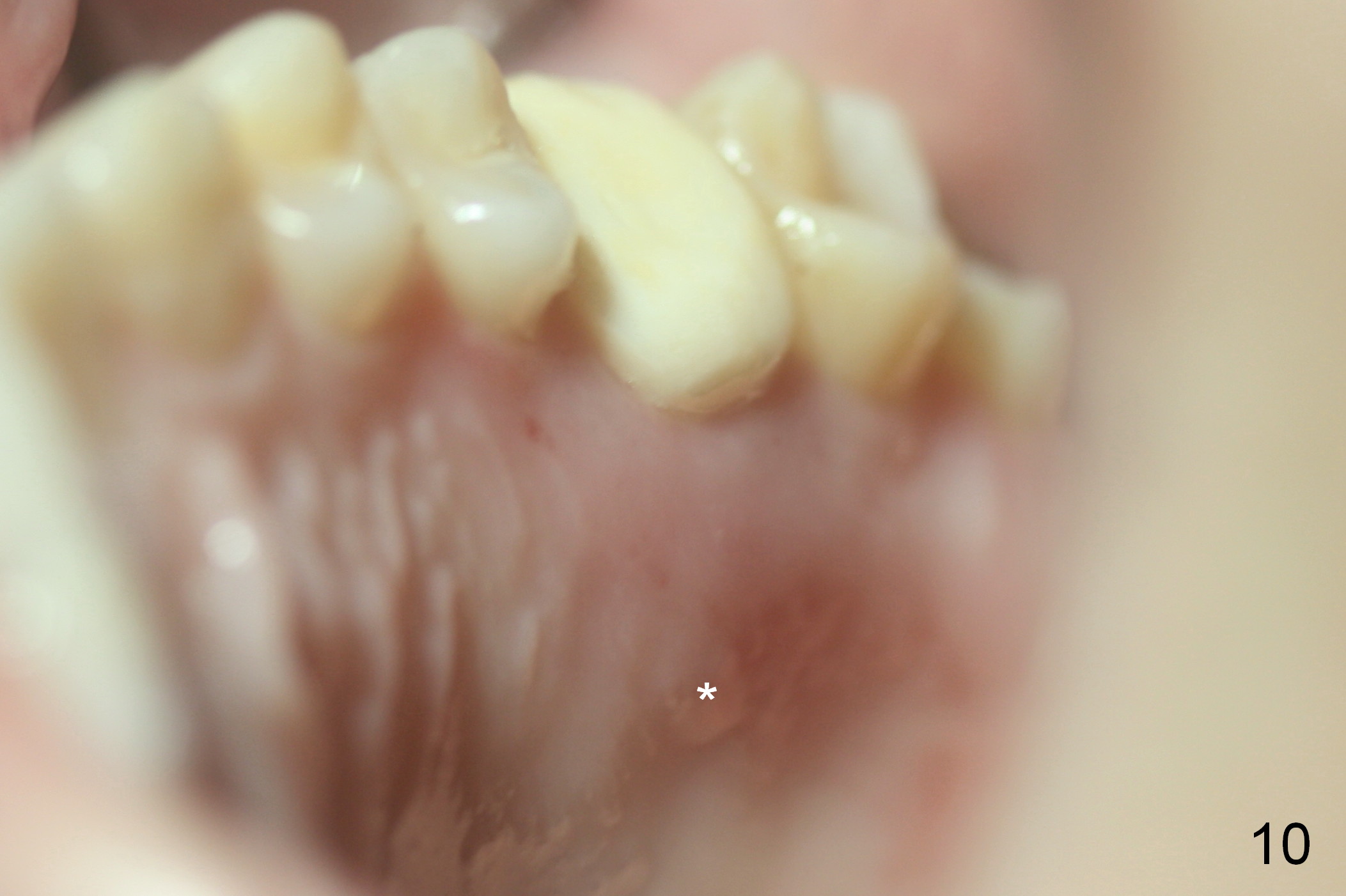 Mild palatal swelling is present around the former fistula 9 days postop (Fig.10 *). No treatment is rendered. There is small buccal gap with exposure of the bone graft (Fig.11 <). Periodontal dressing is applied to prevent further loss of bone graft (Fig.12).