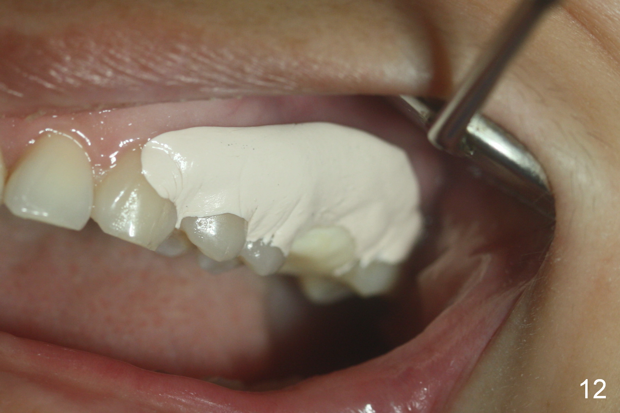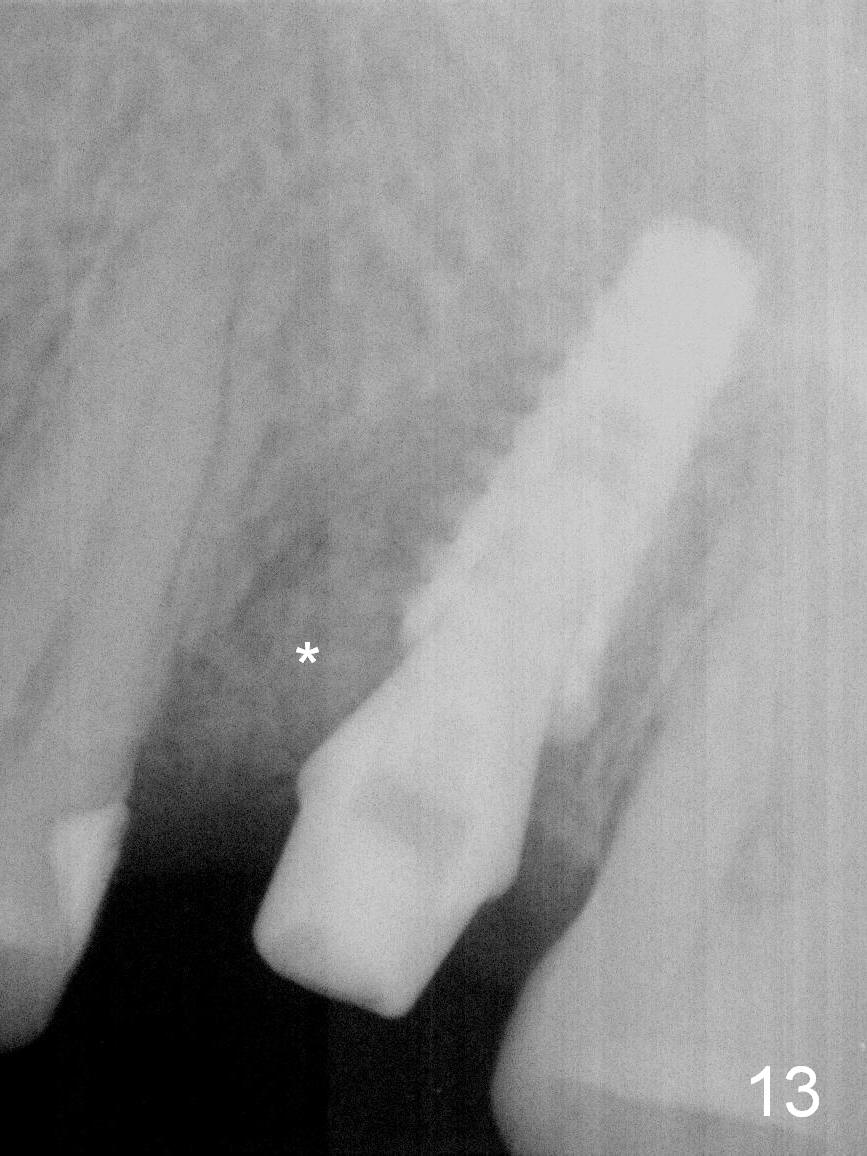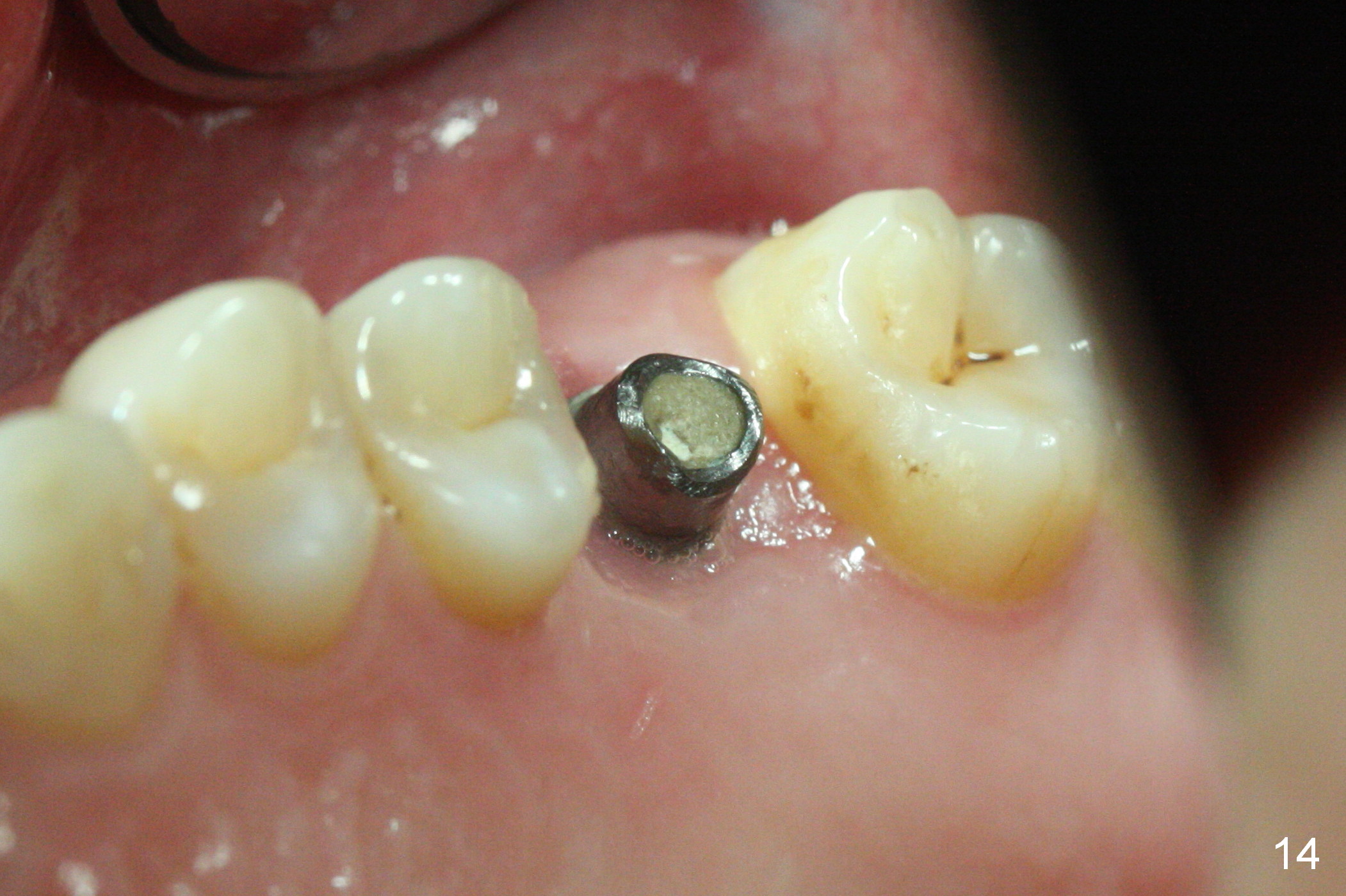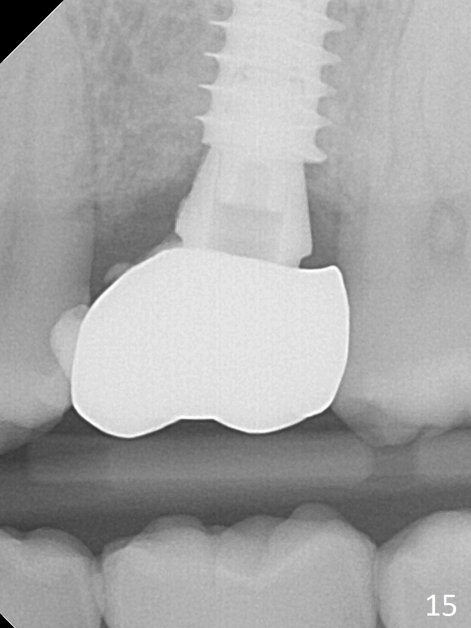It seems that the provisional traps food. The former has been removed by the patient by the time she returns 3.5 months postop. The gingiva around the implant is healthy. The organization of the bone graft has changed (Fig.13, as compared to Fig.8,9). The implant has osteointegrated. Take photos to show the buccal and palatal gingival margin before impression. In fact the newly formed gingiva covers the margin of the abutment 5 months postop (Fig.14). Laser gingivectomy is performed prior to impression. Provisional should be kept in place with good oral hygiene. The crown dislodges 8 months post cementation, probably due to bruxism, small, short abutment and open margin (Fig.15 (taken after recementation; the residual cement is removed later)).