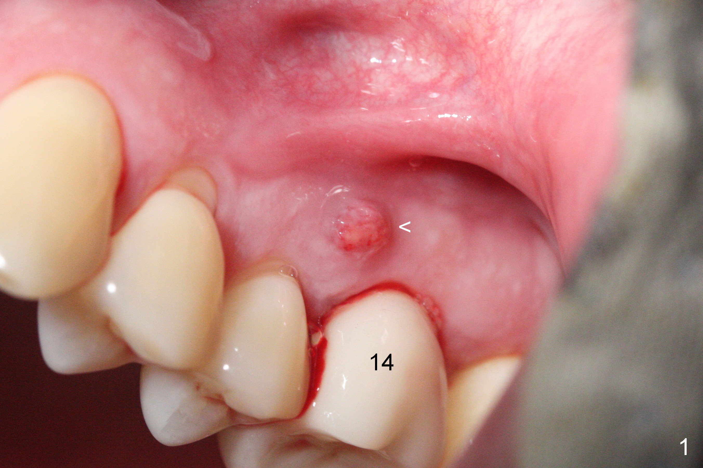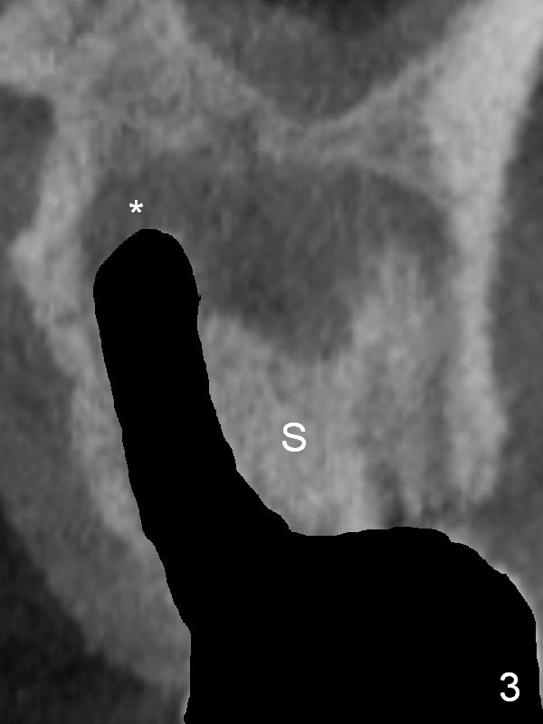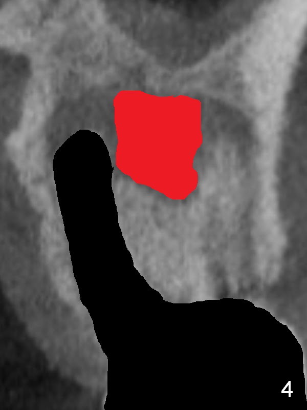 There is purulent discharge from the mesiobuccal fistula (Fig.1 <) during the tooth #14 extraction. Fig.2 is a coronal section of CBCT of the affected tooth showing a large apical lesion (*). When the tooth is removed (Fig.3), limited amount of granulation tissue is removed apical to the palatal root (P in Fig.2). The granulation tissue (Fig.4 red area) above the septum (Fig.3 S) is thoroughly extirpated when the septum is removed (Fig.5 black area).