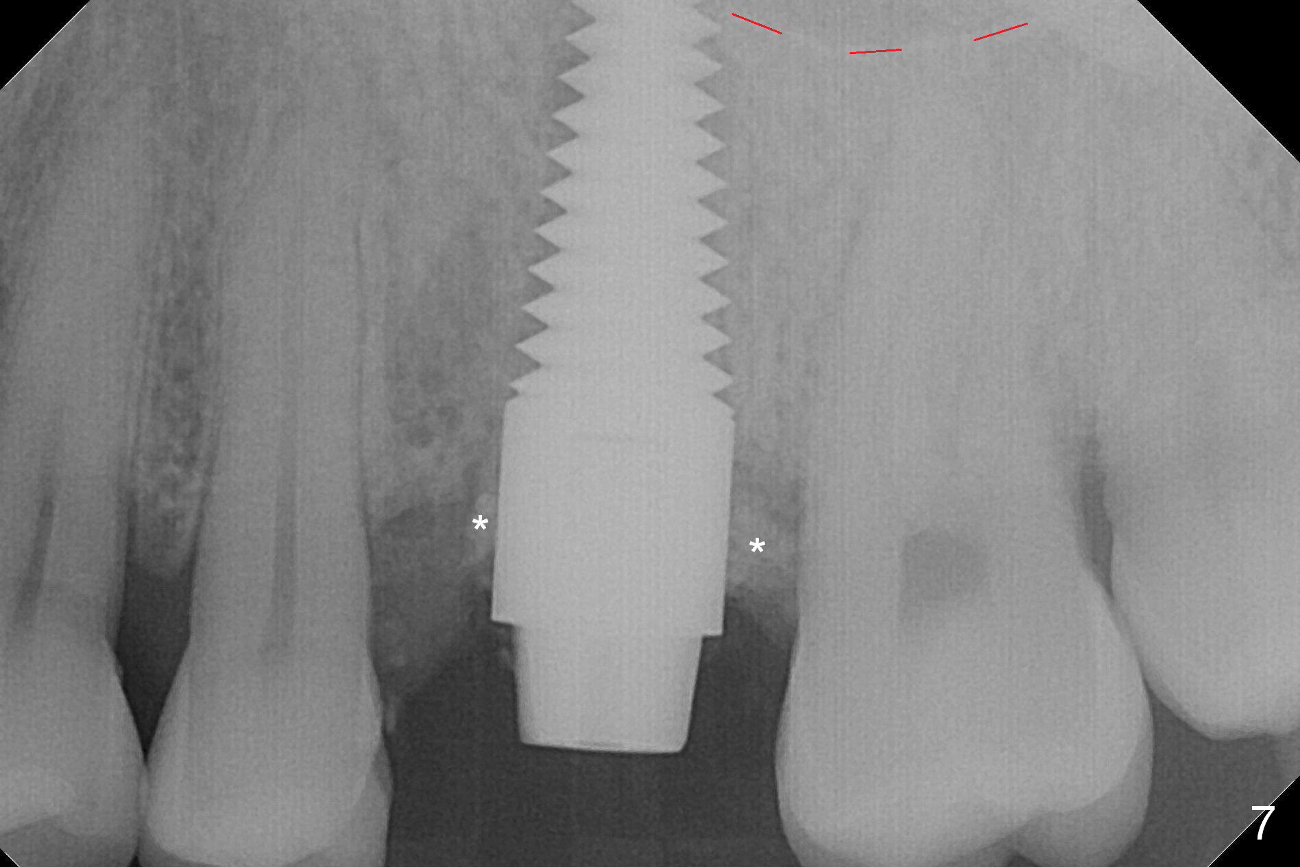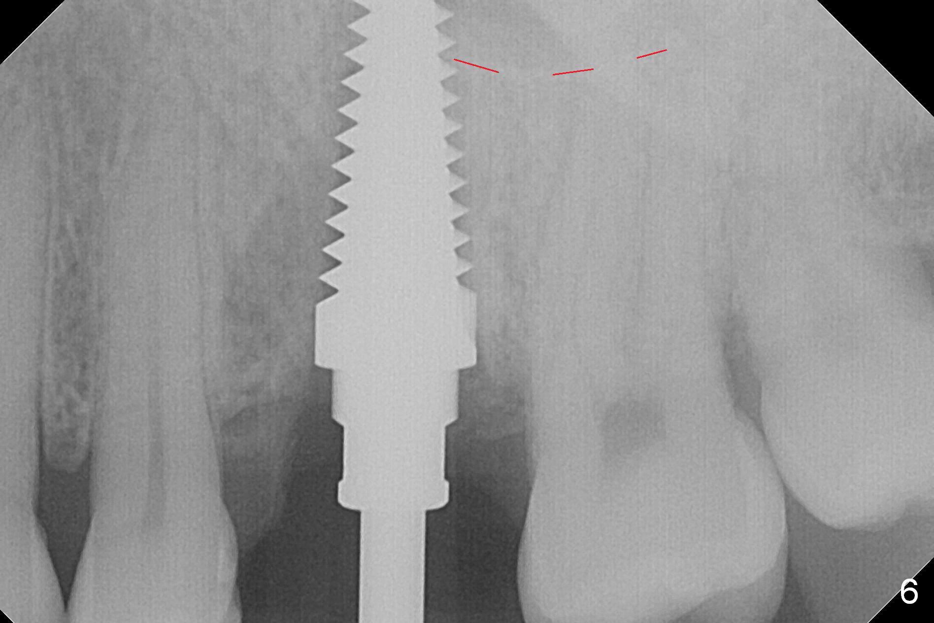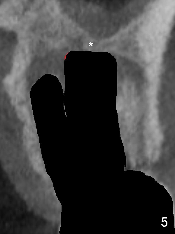 The septum perforates into the distobuccal socket when 4.3 mm drill is being used. The sinus floor bone (Fig.5 *, Fig.6-8 red dashed line) has to be used for primary stability. Finally a 6x20 mm tap achieves stability apparently by engaging to the mesial and distal walls of the socket (Fig.6). The insertion torque of a 6x20 mm tissue-level implant is > 60 Ncm (Fig.7) with allograft packed into the remaining socket (*).