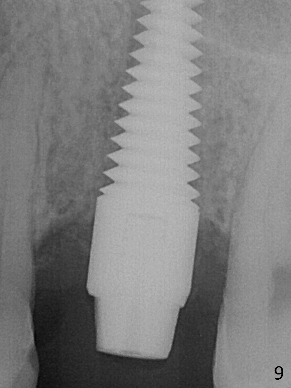 A much smaller implant should be used (e.g.4.5 mm) in order to save the septum. But the apical granulation tissue above the septum cannot be removed completely. There is no bone loss around the implant 4 months postop (Fig.9), although the gingiva is unhealthy because of lack of oral hygiene locally. The immediate provisional is not reseated with oral hygiene instruction. Impression will be taken in 2 weeks. Take photos to show disappearance of the fistula.