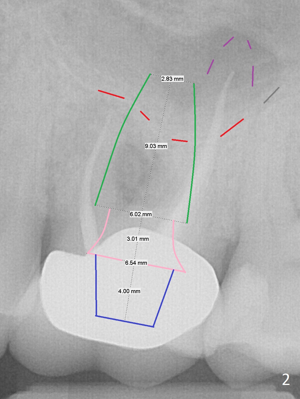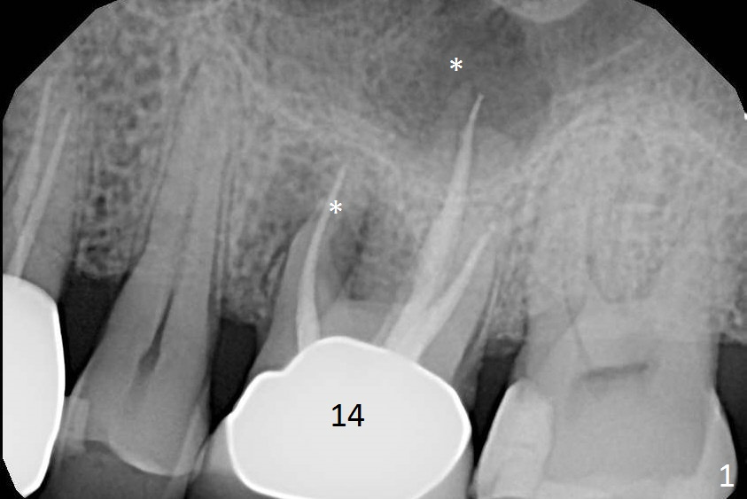 A 70-year-old man will return for #14 extraction and implant placement after consultation with an endodontist (Fig.1). Note the large periapical radiolucencies associated with the mesiobuccal and palatal roots (*). After extraction and Metronidazole, start osteotomy in the septum, place PRF membranes/plug and allograft/Osteogen and then a dummy implant or tap. Place a large definitive implant (Fig.2 green) higher than the sinus floor (red), but lower than the palatal apex (purple).
