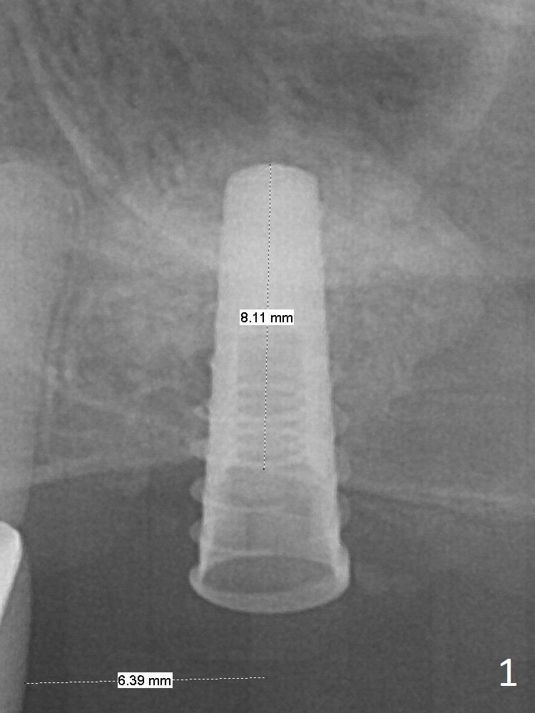 Magic Sinus Lifter is used to elevate the sinus floor for ~ 5 mm, followed by insertion of allograft/Osteogen and 4.0x11 mm dummy implant partially (Fig.1). With approximately 10% more of graft being placed, a 4.5x9 mm IBS implant is placed with insertion torque of 15 Ncm (Fig.2). The implant has a tenting effect. Fig.3 shows a coronal section of the sinus preoperatively.