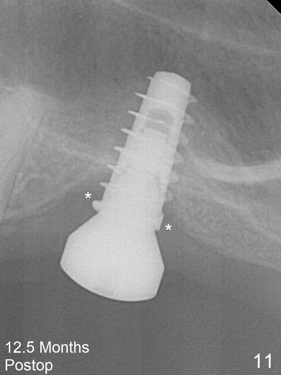 Three weeks later (approximately 8.5 months postop), the implant is found to be able to rotate when a 6.5x5.7(1) mm pair abutment is tightened with local anesthesia (there is pain associated with healing screw removal). After removal of the latter, the implant is placed deeper by hand retightening (Fig.10 arrow). Is it a better idea to use a new larger implant instead? The patient (53 years old) is scheduled to return for follow up in 3 months. In fact she returns 4 months later. The implant remains unstable and tender with loss of the crestal bone (Fig.11 *). It will be replaced with an implant (larger in diameter, but shorter) with SLA surface after debridement and bone graft. Change the trajectory so that the coronal end will be more mesial. Use a healing screw and try to close the wound. In fact the patient reveals history of osteoporosis.