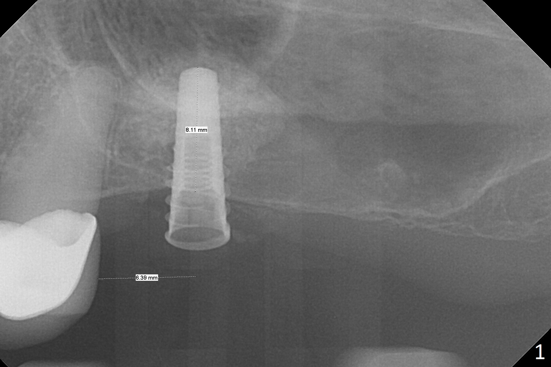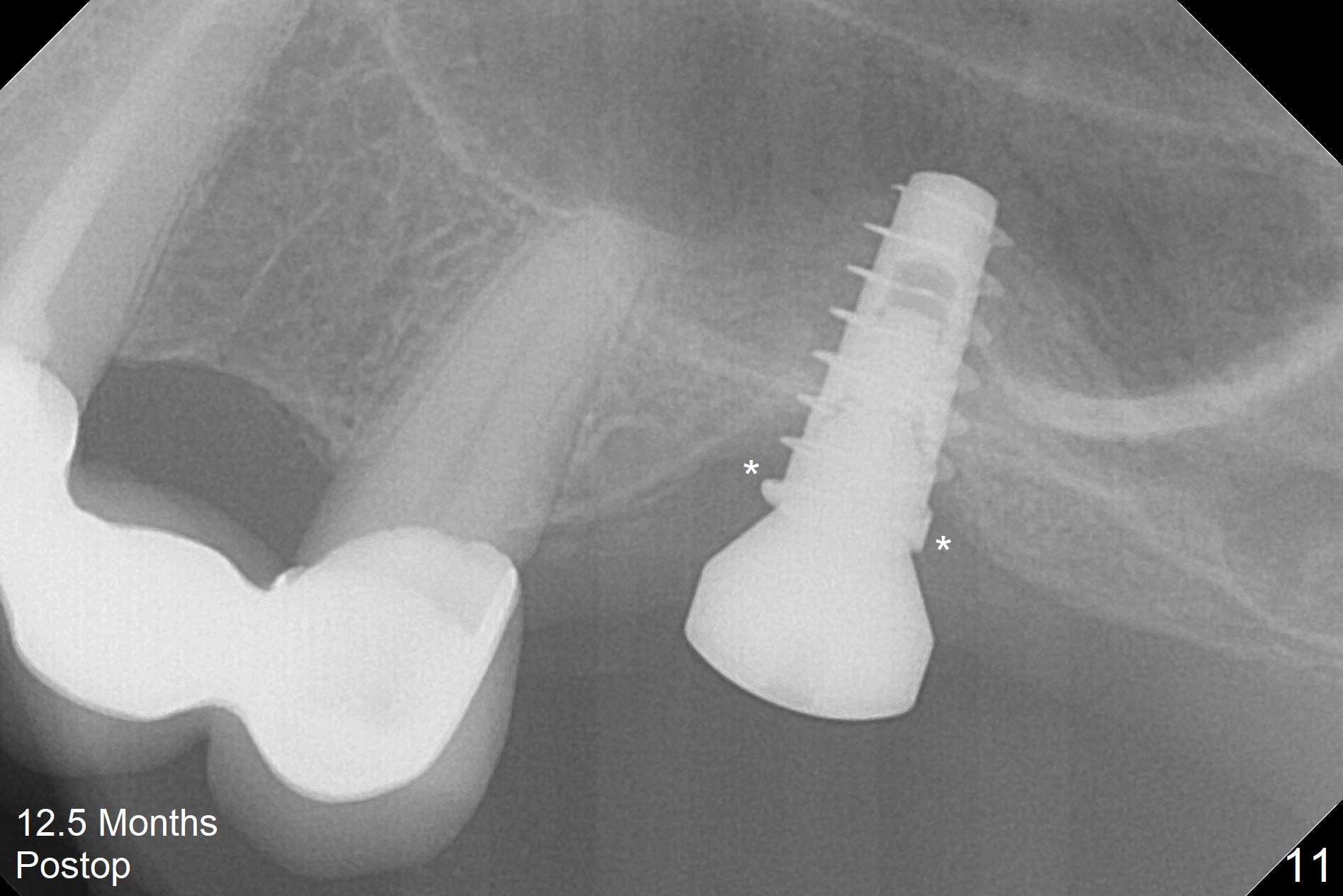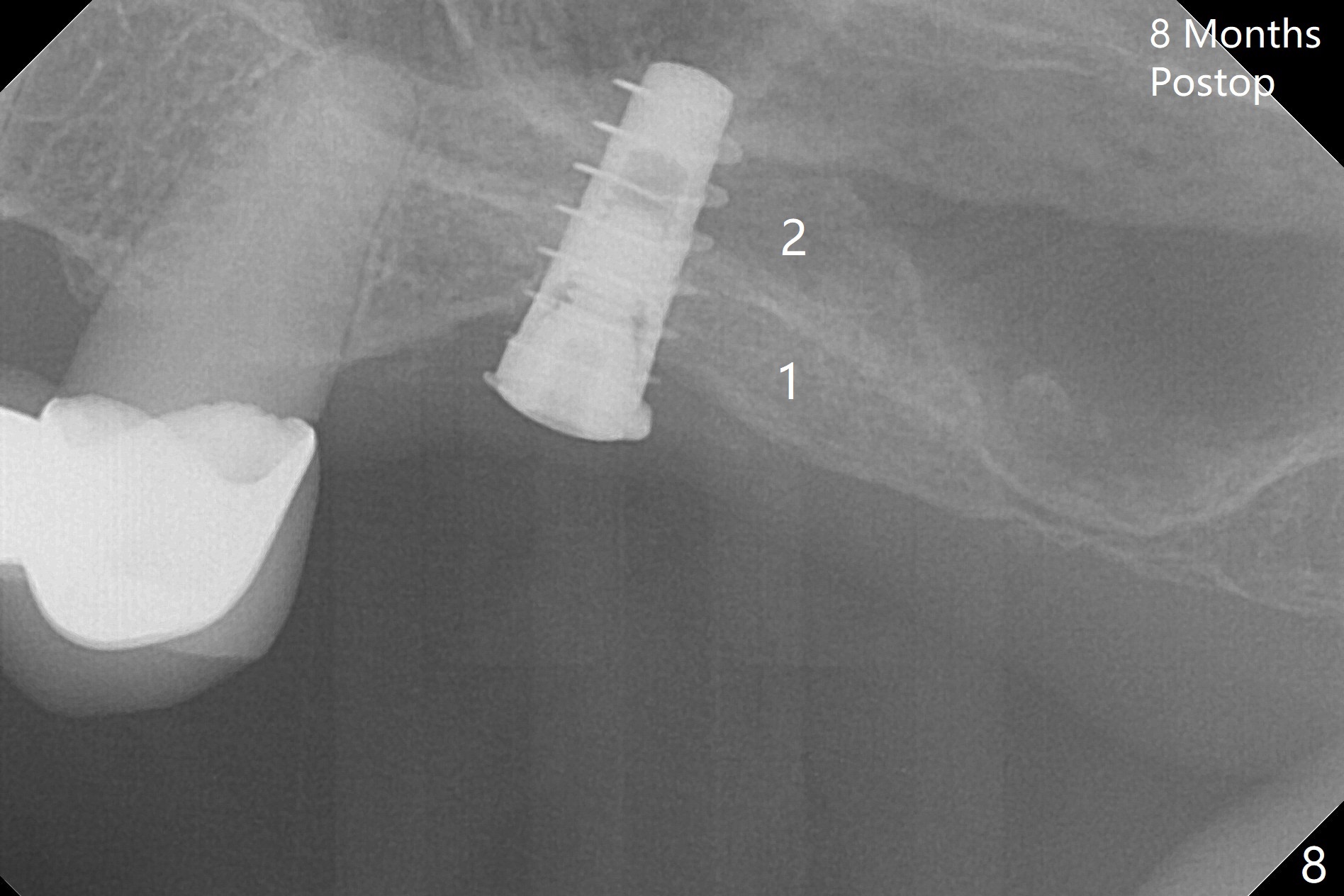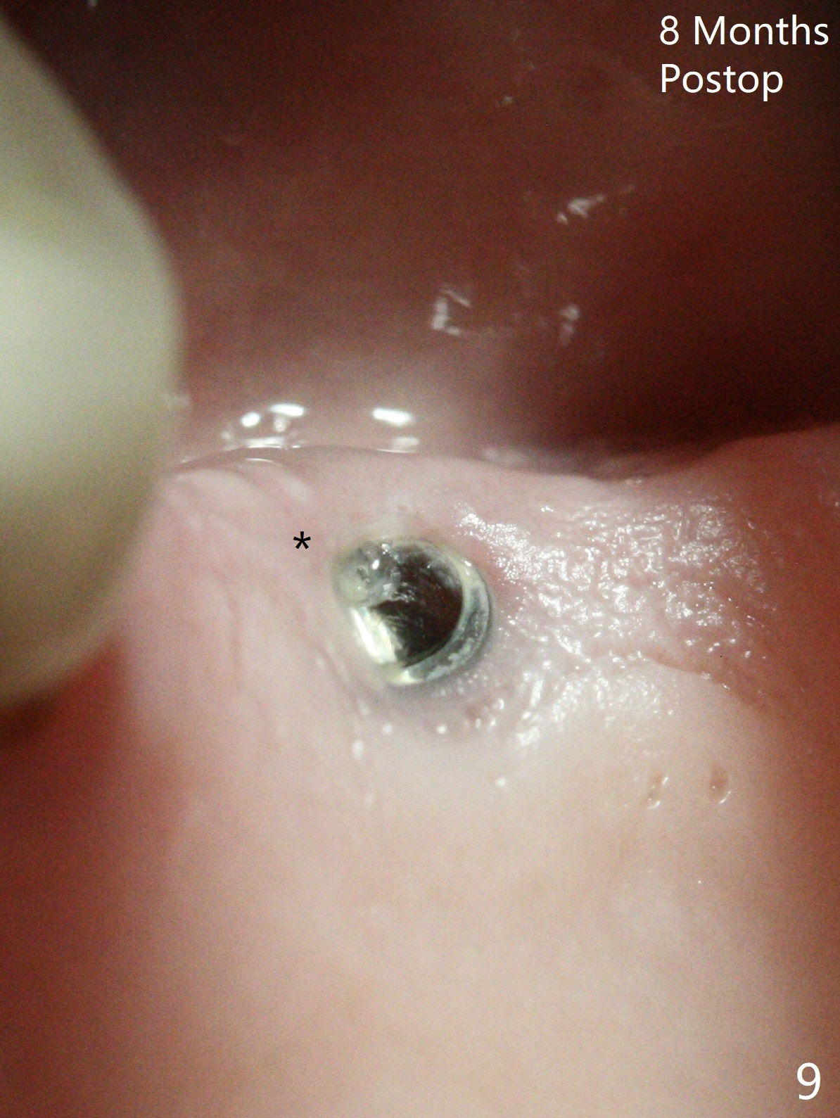 There are two layers of the bone, one (1) being denser than the other (2) 8 months postop (Fig.8). After local anesthesia, the healing screw is removed; the implant is found to be stable. A 6x4(2) mm pair abutment cannot be inserted due to blockage of the mesiobuccal gingiva (Fig.9 *). Instead a 6x2 mm healing abutment is placed. Since the implant is placed too superficial, use a 1 mm cuff abutment.