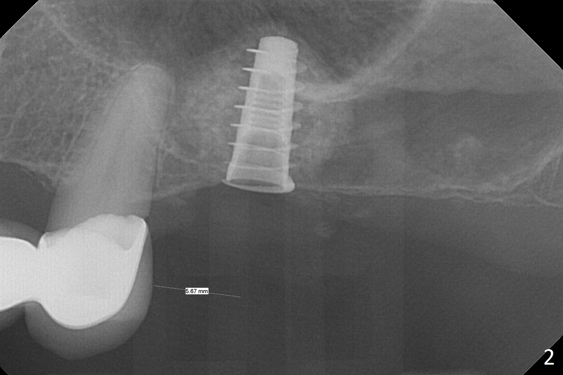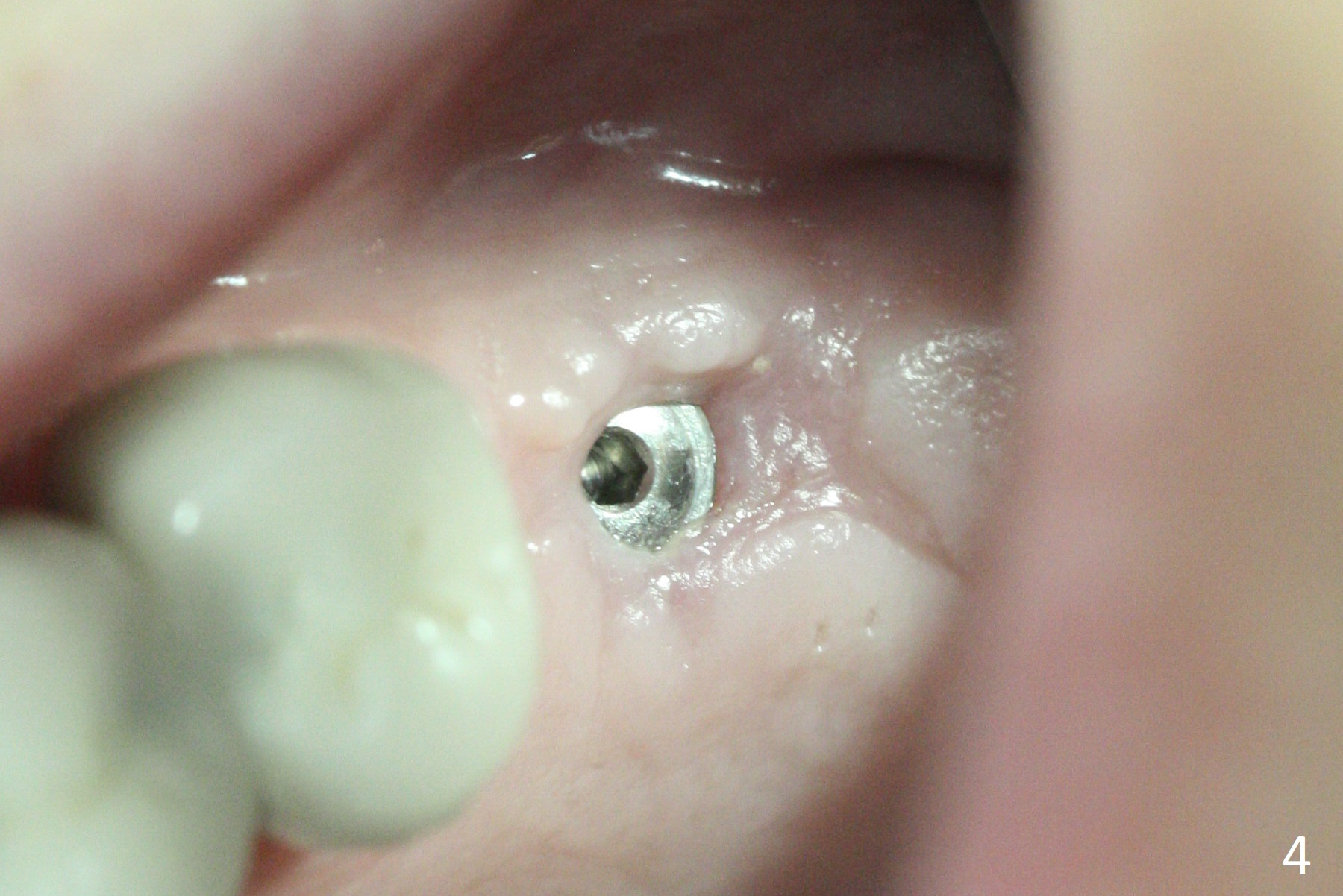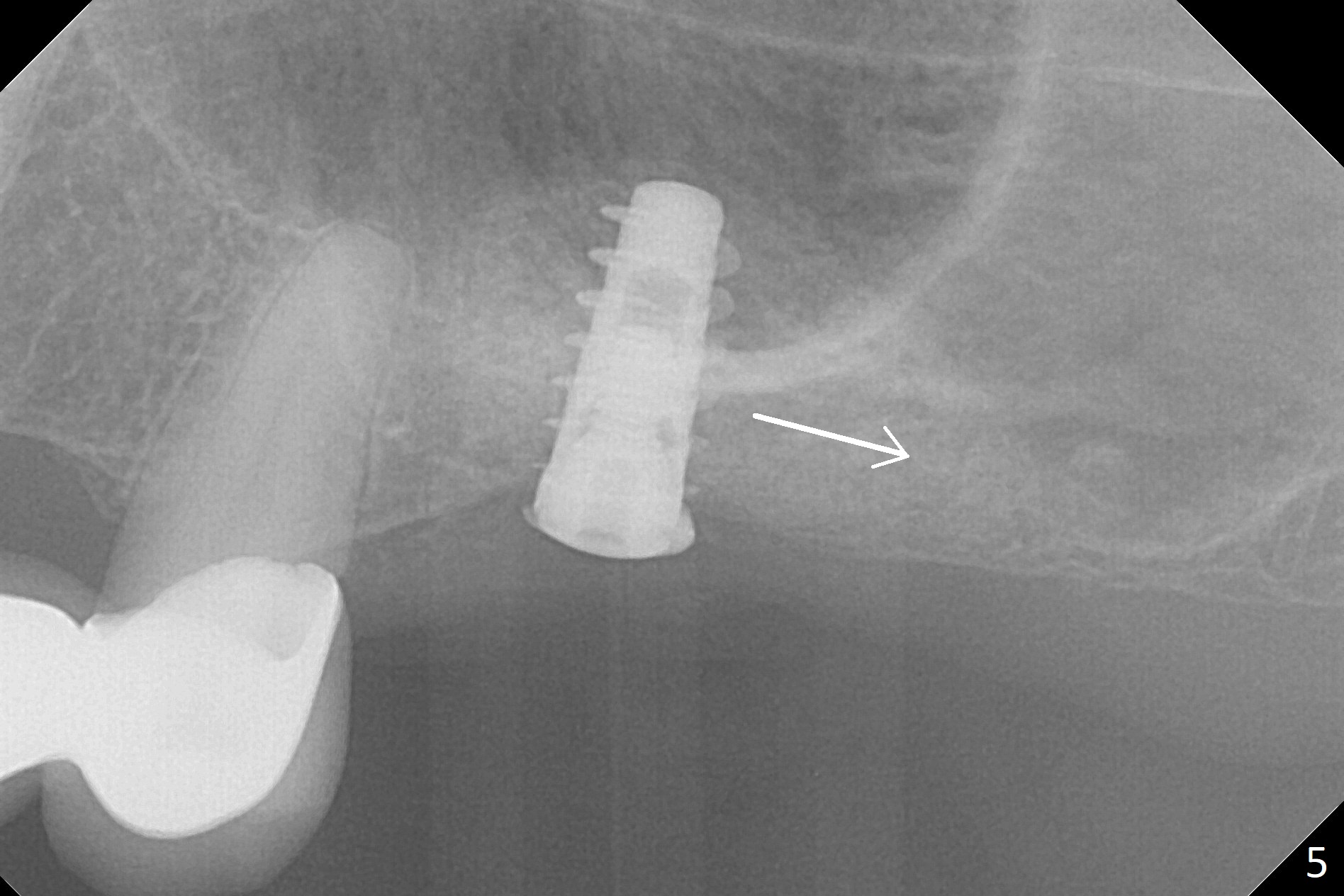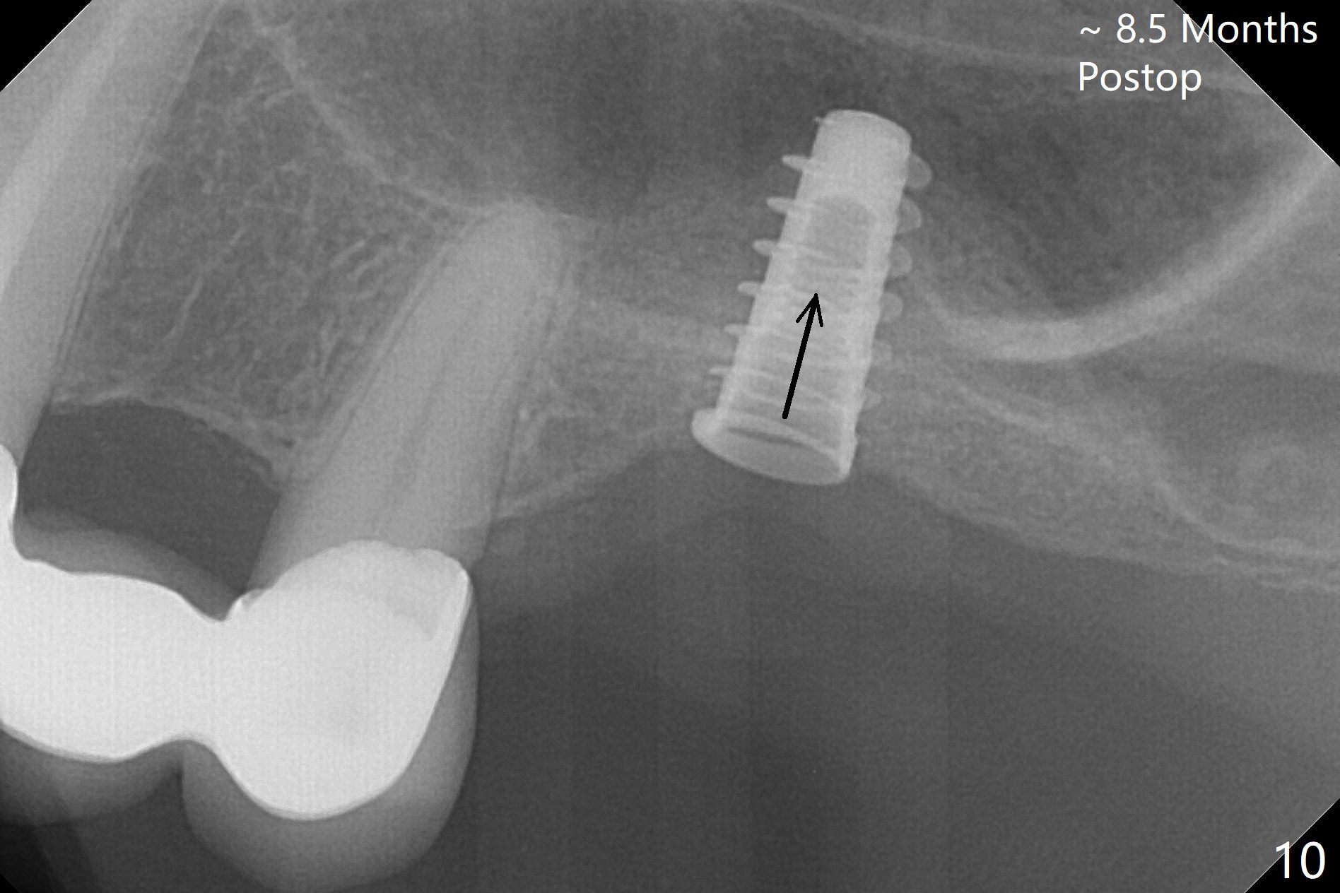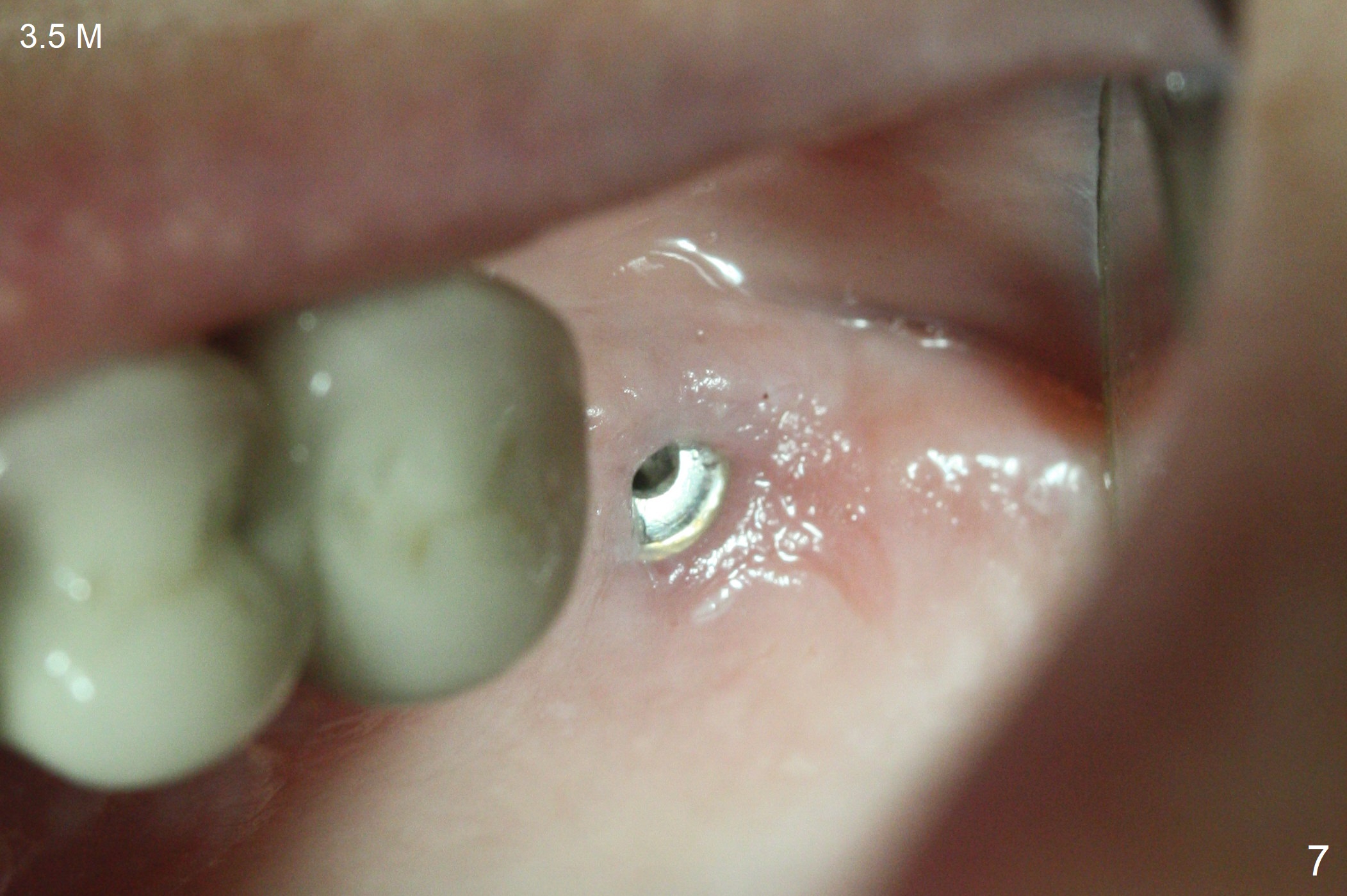 The bone graft appears to move distal 1 month 20 days postop (Fig.5 arrow), while the implant seems to be extruded with implant exposure. The patient feels pain when the healing screw is being removed or tightened. The distal migration of the bone graft may lay foundation for future implant placement at #15. Bone density around the implant remains the same (Fig.6), while the wound reduces nearly 3.5 months postop (Fig.7). The healing screw cannot be turned without causing pain. Can the implant at #14 be retorqued to be seated deeper 3-4 months later?