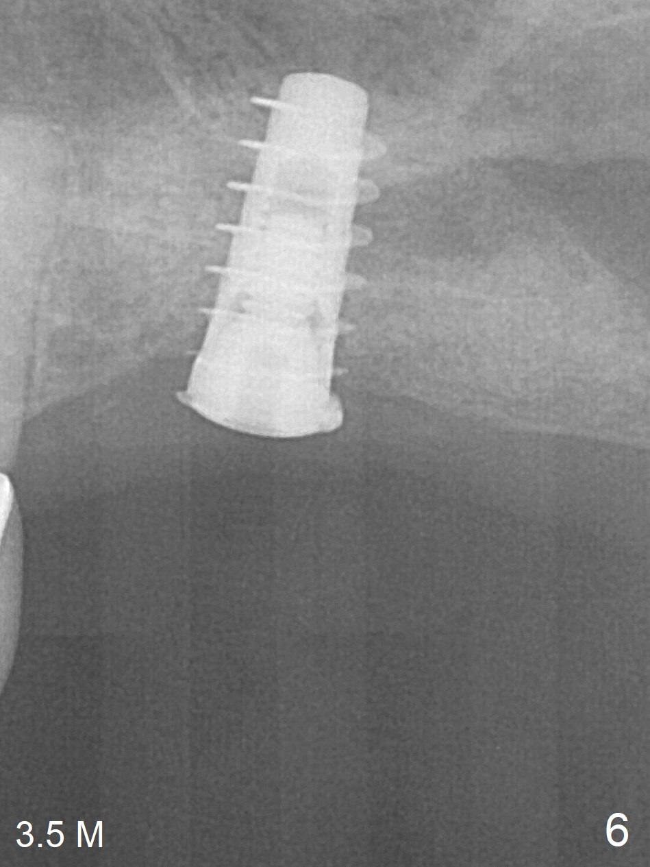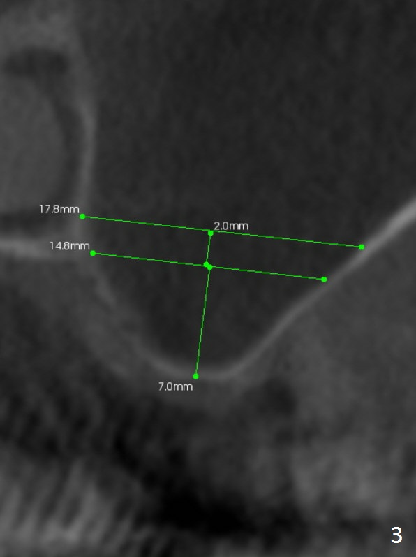 Blood drawing for PRF fails. After NO inhalation and local anesthesia, an incision is made at the narrow ridge of #14. Magic Sinus Lifter is used to elevate the sinus floor for ~ 5 mm, followed by insertion of allograft/Osteogen and 4.0x11 mm dummy implant partially (Fig.1). With approximately 10% more of graft being placed, a 4.5x9 mm IBS implant is placed with insertion torque of 15 Ncm (Fig.2). The shape of the sinus suggests that the primary stability is derived from the contact between the implant and the sinus floor (Fgi.3, preop CBCT coronal section). Approximately .5 mm implant threads are exposed buccodistopalatally, which are covered by allograft and collagen membrane before suturing. There is one episode of nasal discharge postop. The wound dehisces without sign of infection (Fig.4 (1 month 1 week postop)).