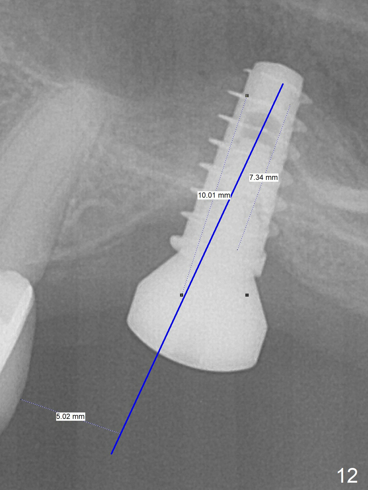 Three weeks later (approximately 8.5 months postop), the implant is found to be able to rotate when a 6.5x5.7(1) mm pair abutment is tightened with local anesthesia (there is pain associated with healing screw removal). After removal of the latter, the implant is placed deeper by hand retightening (Fig.10 arrow). Is it a better idea to use a new larger implant instead? The patient (53 years old) is scheduled to return for follow up in 3 months. In fact she returns 4 months later. The implant remains unstable and tender with loss of the crestal bone (Fig.11 *). It will be replaced with an implant (larger in diameter (5-6 mm), but shorter (7.3 mm after 5x10 mm dummy) with SLA surface after debridement and bone graft. Change the trajectory so that the coronal end will be more mesial (Fig.12 blue line). Use a healing screw and try to close the wound. In fact the patient reveals history of osteoporosis.