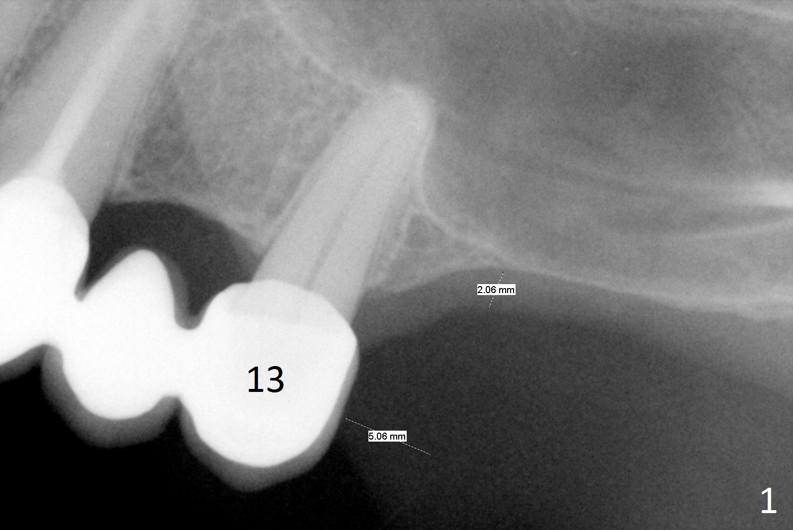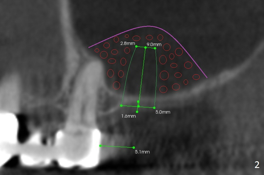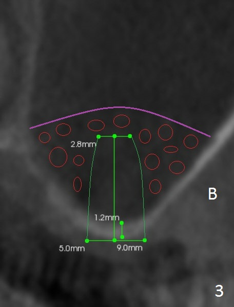 A 52-year-old woman is a dental phobic. Finally she agrees to have 1 implant placed in the upper left posterior region, where the sinus floor is paper thin (Fig.1). Use Magic Split for access for 2-3 mm deep, followed by Magic Lifter for 9 mm. If the latter does not engage, use Magic Drill in the Sinus Kit. Place PRF membranes (Fig.2,3 purple curved line) and allograft/Osteogen (circles) prior to 4 mm dummy implant. The 1st intraop PA will show whether the graft is sufficient or not. Since the mesial bone is thicker than the distal one (Fig.1,2), try to prevent the osteotomy from drifting distally (1).