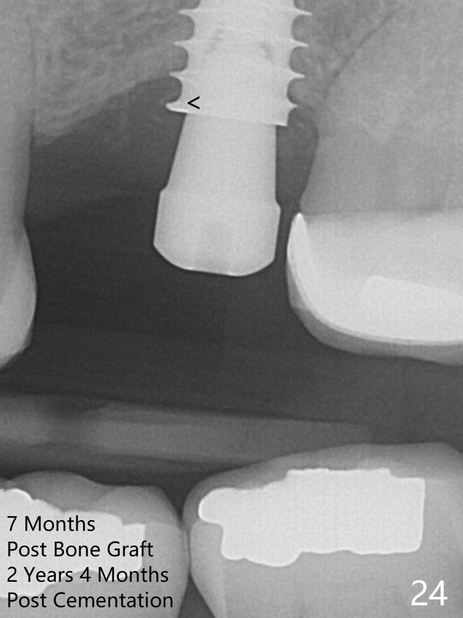Bone volume and density seem to increase 4.5 and 10.5 months post cementation (Fig.20,21, as compared to Fig.15), although the buccal plate remains as concave as shown in Fig.18. A small healing abutment is placed because the implant is placed distal (Fig.24 (4.5x3 mm)). An angled abutment should be tried and #15 crown will be redone. Impression will be taken when the gingiva heals around the provisional crowns. Faint bone forms around the 1st implant thread (<; regraft may be unnecessary).