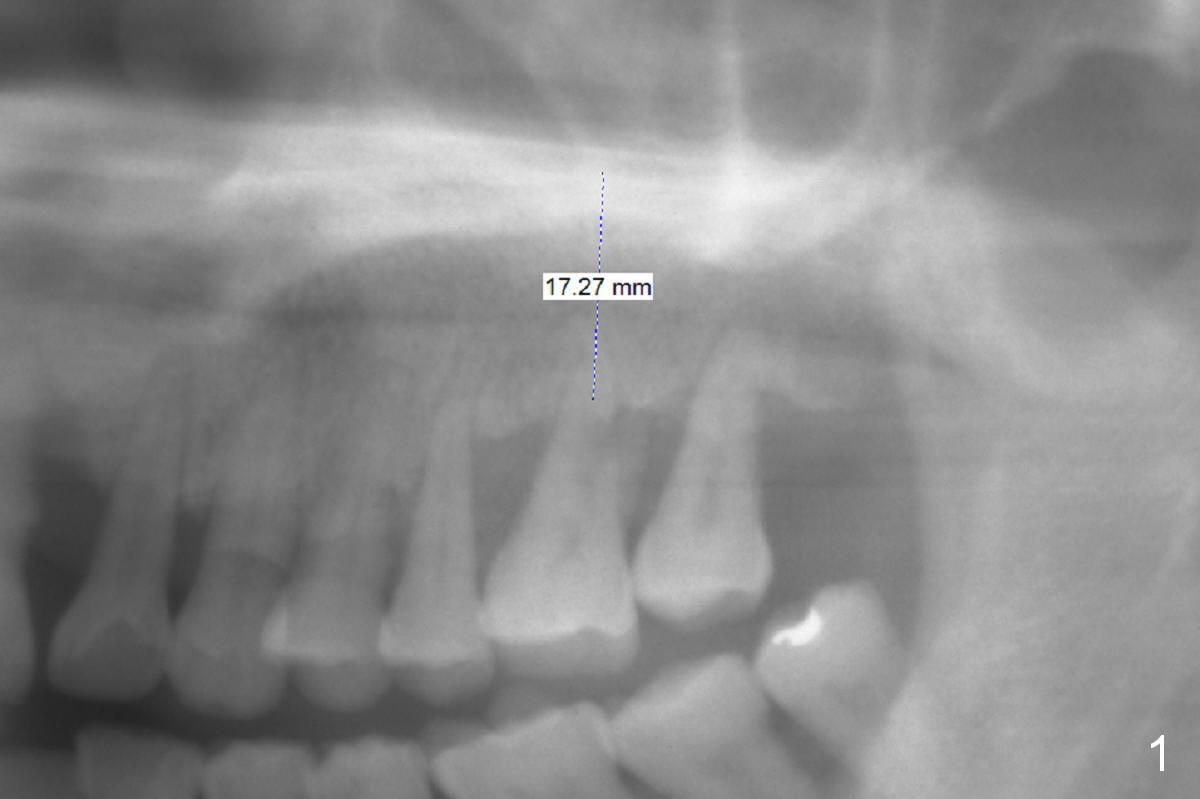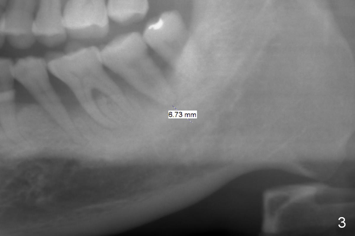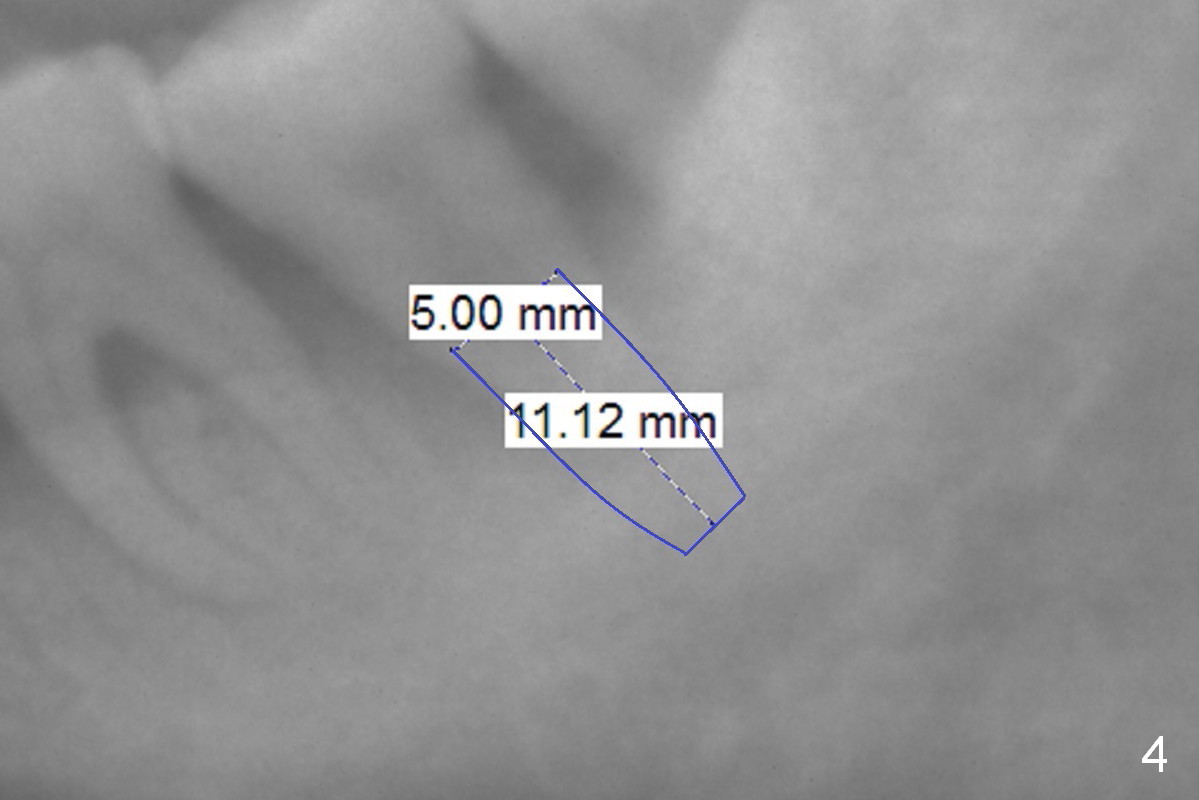 The teeth #14 and 18 of a 46-year-old man become symptomatic 1 month after #4 implant placement. While the socket at #14 is shallow, the apical bone is abundant (Fig.1). The longest IBS implant should be safe (13 mm, Fig.2). In contrast, the socket at #18 is relatively deep, the apical bone is short (Fig.3). A shorter implant (11 mm or less, Fig.4) should be chosen. Osteotomy in the new bone should be 4 mm. Try in a 5x9 mm dummy implant at #18. No antibiotic is used for socket treatment. The bone density in the mandible should be high (drills), whereas that in the maxilla may be low (expanders) or medium (drills). Preop exam will decide which tooth needs treatment first. Take photos PRN.