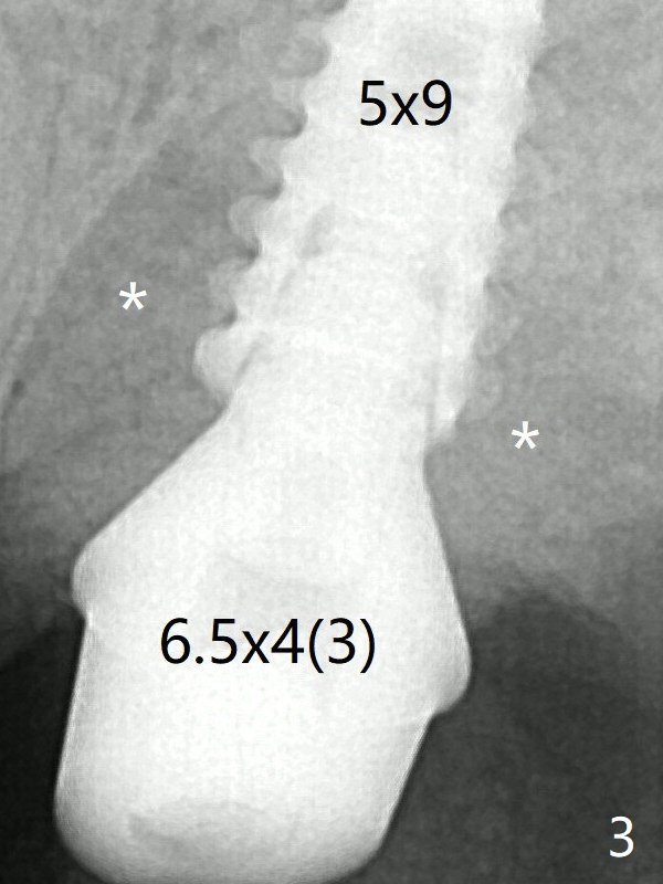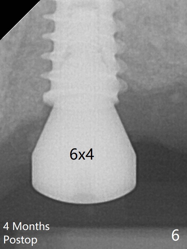Since a 5x9 mm dummy implant is placed with stability, a definitive implant with the same dimension is chosen with >50 Ncm (Fig.3). Prior to and after abutment placement, Vera graft is placed (*). The provisional perforates with loose abutment 3.5 months postop. A 6x4 mm healing abutment is placed. Osteointegration occurs 4 months postop (Fig.6).