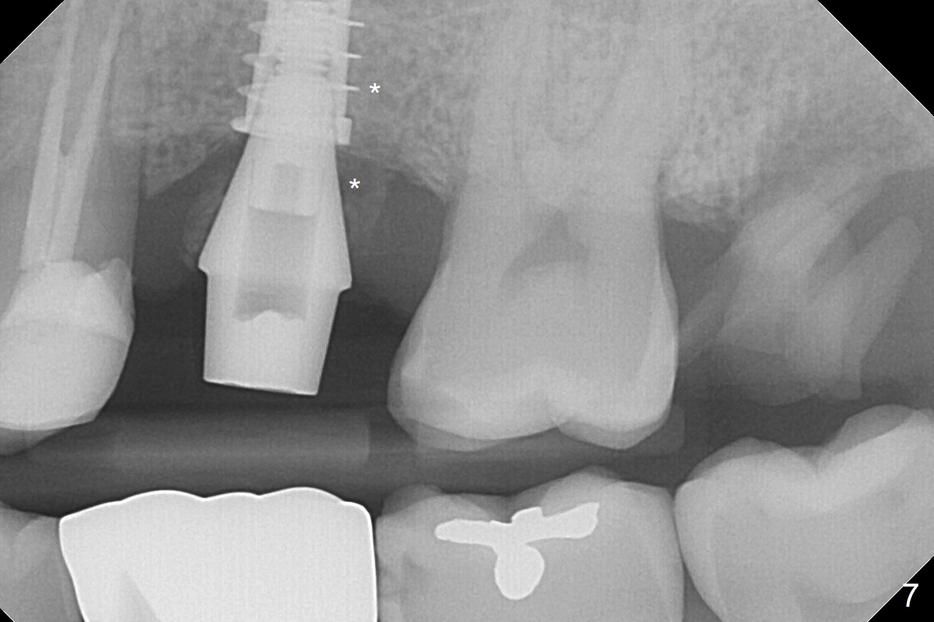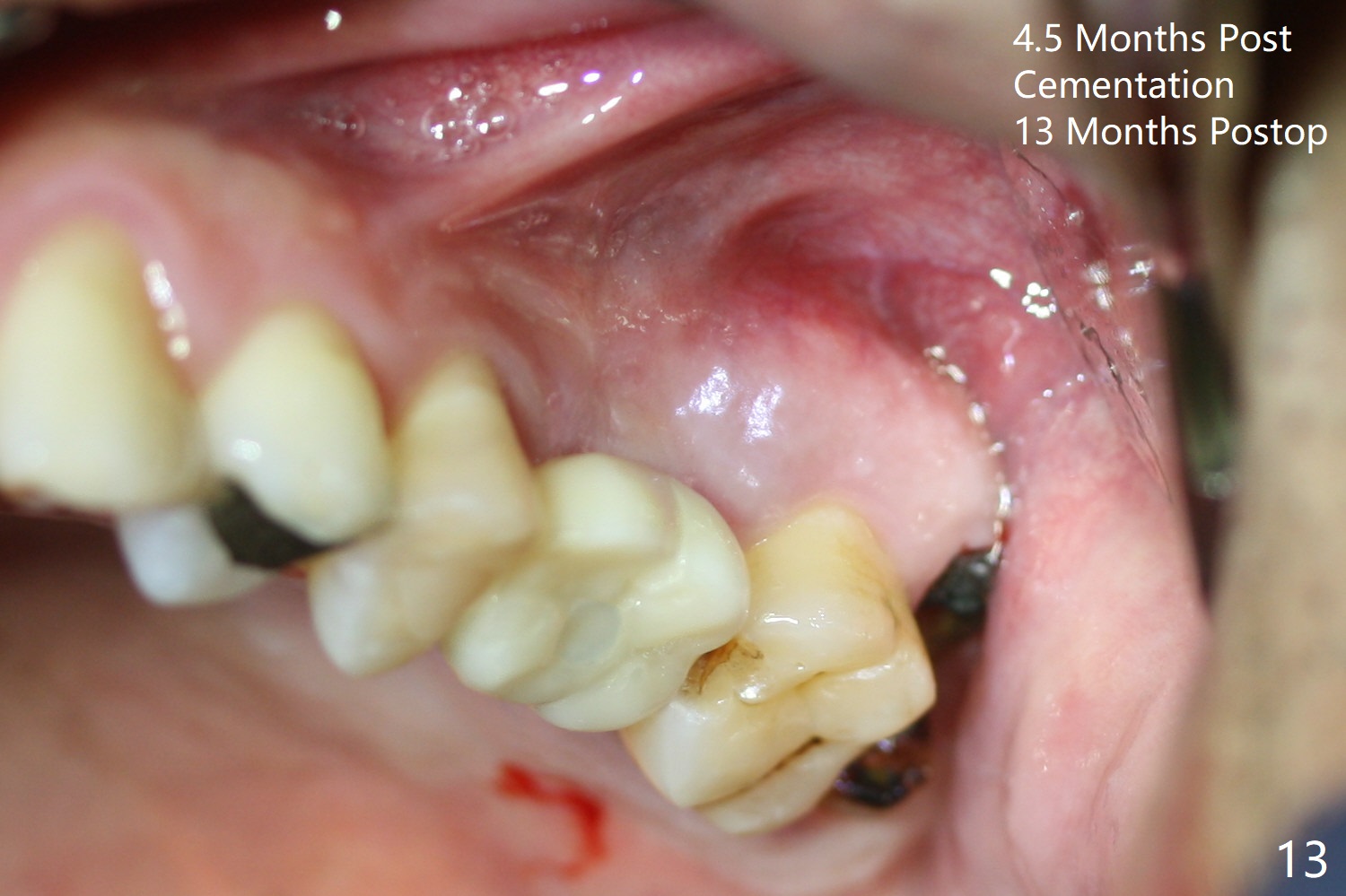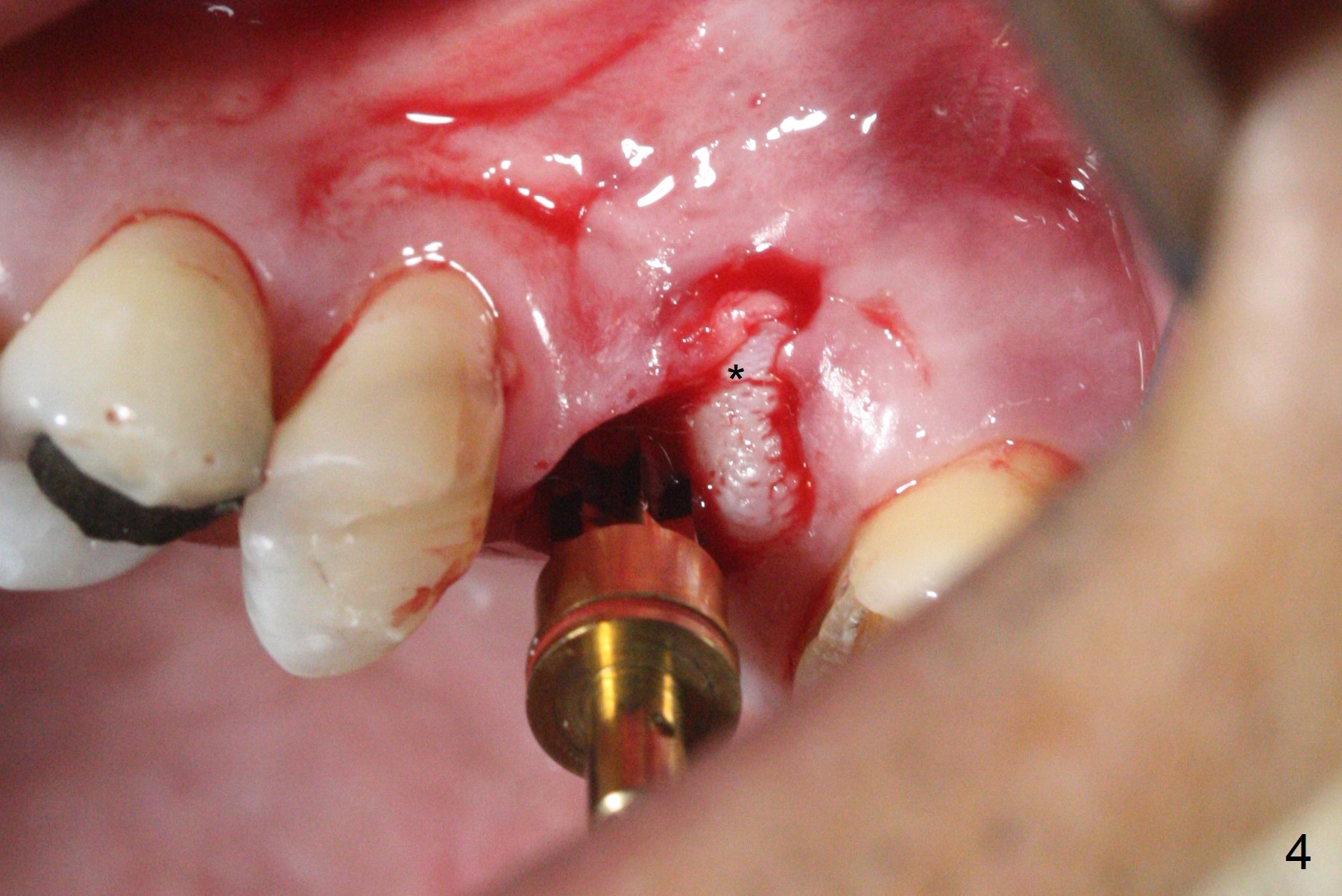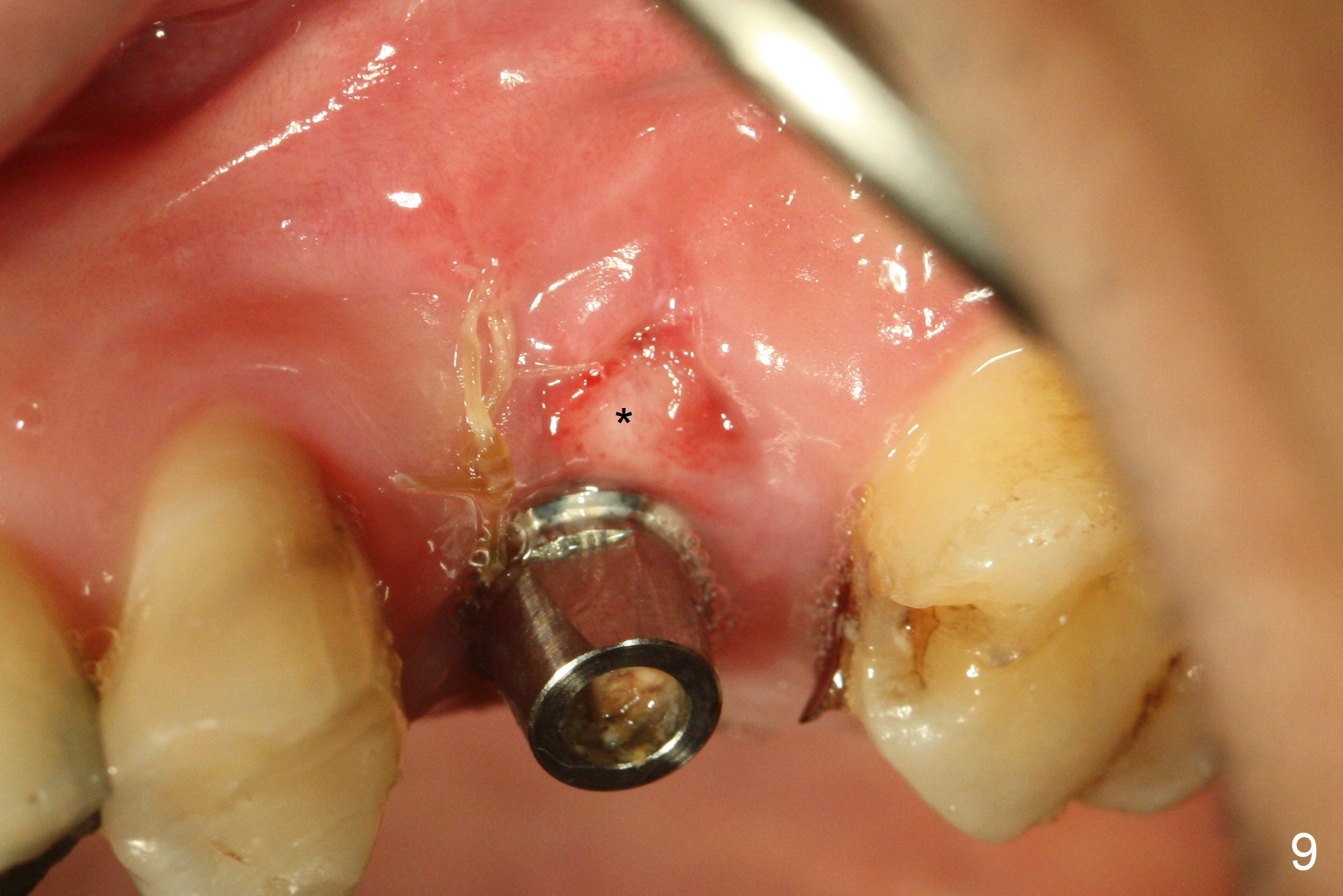 After extraction of the distobuccal residual root of the tooth #14 (Fig.1 arrow), the gingiva around the socket does not look like the keratinized one (Fig.2 *). An osteotomy through the distobuccal socket would seem too buccal for immediate implant. The palatal gingiva feels too tough to be stretched. An incision is made (Fig.3 dashed line); with elevation, the thick flap is transferred buccally (curved arrow). An osteotomy is initiated in the palatal bone with 1.5 mm drill, followed by Magic Expanders until 4.3 mm for 11 mm (Fig.4,5). Following Magic Drill 3.8x13 mm, the sinus membrane is found to be perforated. The latter is repaired with Osteogen plug. A 4.5x9 mm IBS implant is placed with 50 Ncm (Fig.6). Osteogen plug and allograft (Fig.7 *) are inserted into the remaining distobuccal socket (reduced after bone expansion). When a 5.5x4(4) mm abutment is placed, the transferred flap appears to be adapted to the distobuccal defect (Fig.8 *). Later one suture is placed for fixation. After provisional insertion, periodontal dressing is applied. Nine days postop, the periodontal dressing dislodges. When the loose provisional is removed for recementation, the flap seem to have healed (Fig.9 *). The gingiva heals around the abutment 5 months postop (Fig.9); the distal socket appears to heal while the bone graft remains at the crest (Fig.11,12). When #30 develops buccal abscess, the patient masticates on the left, leading to loss of composite at #13 (Fig.14); in fact the abutment at #14 is incompletely seated.