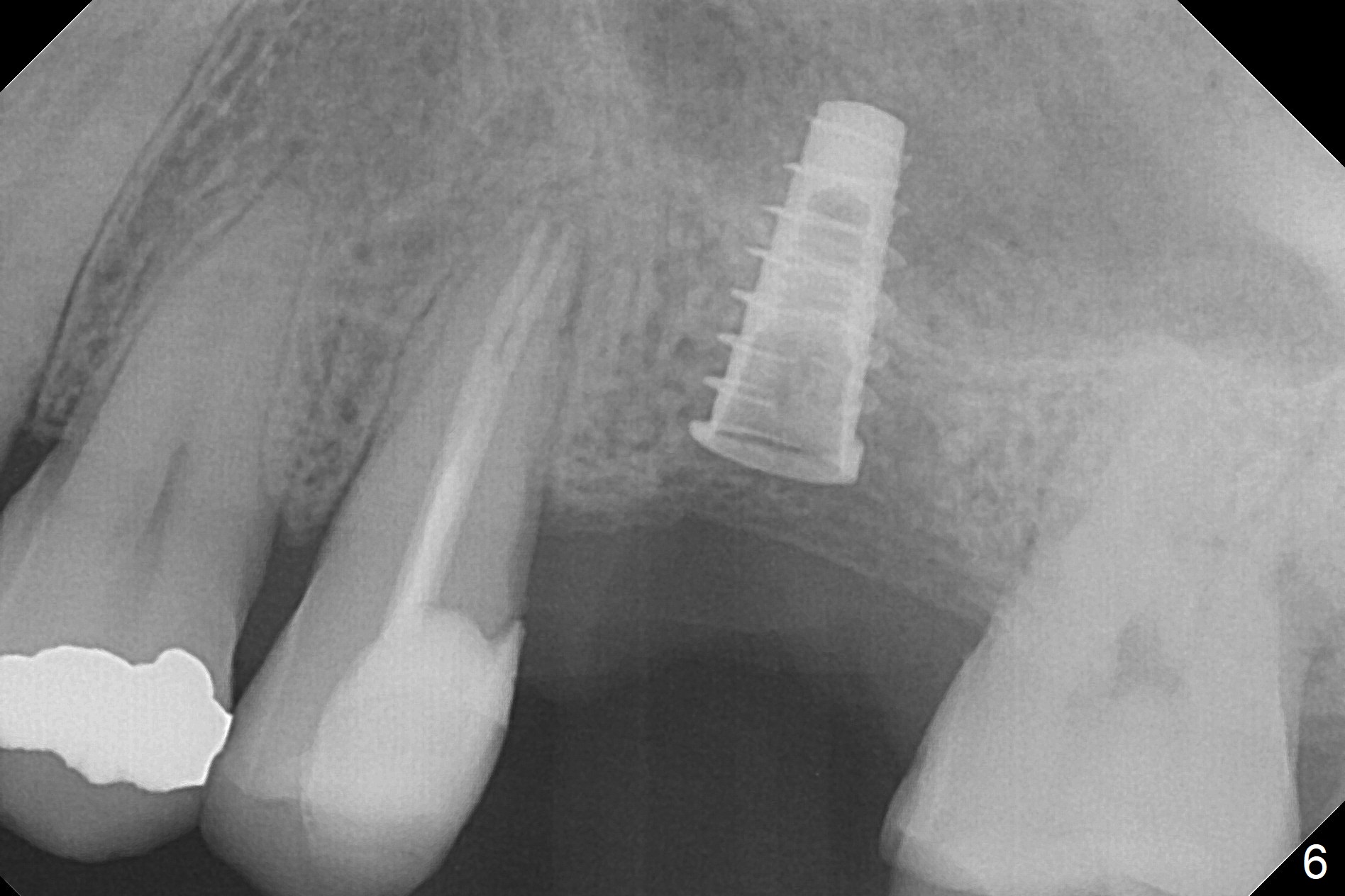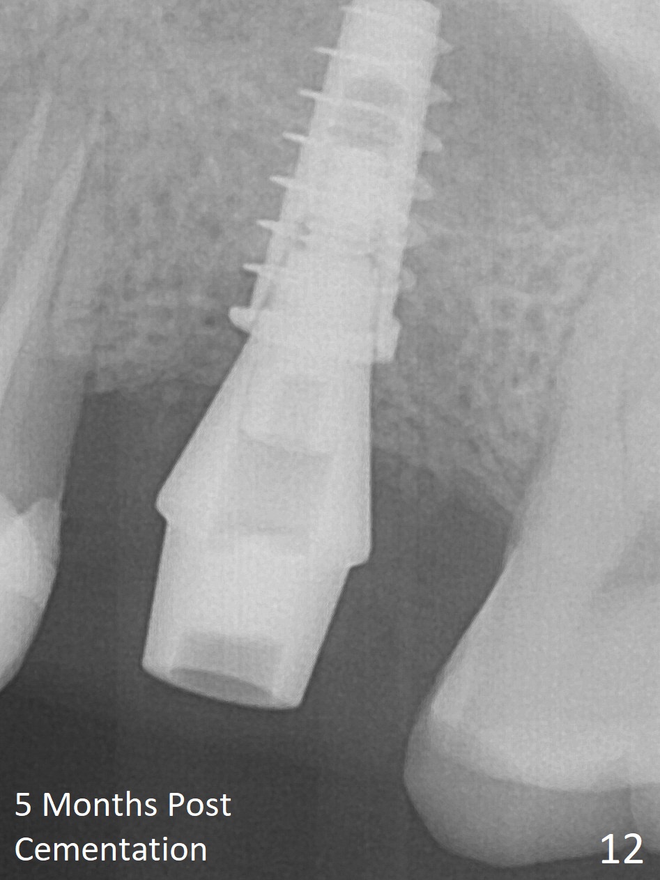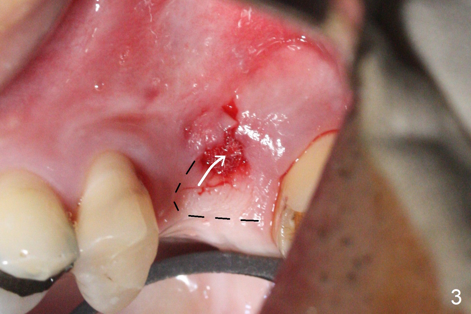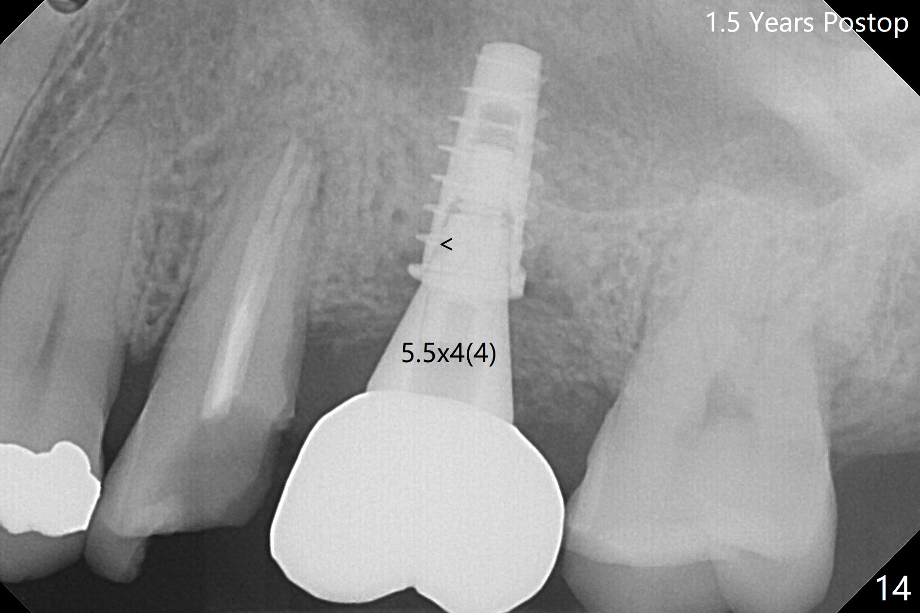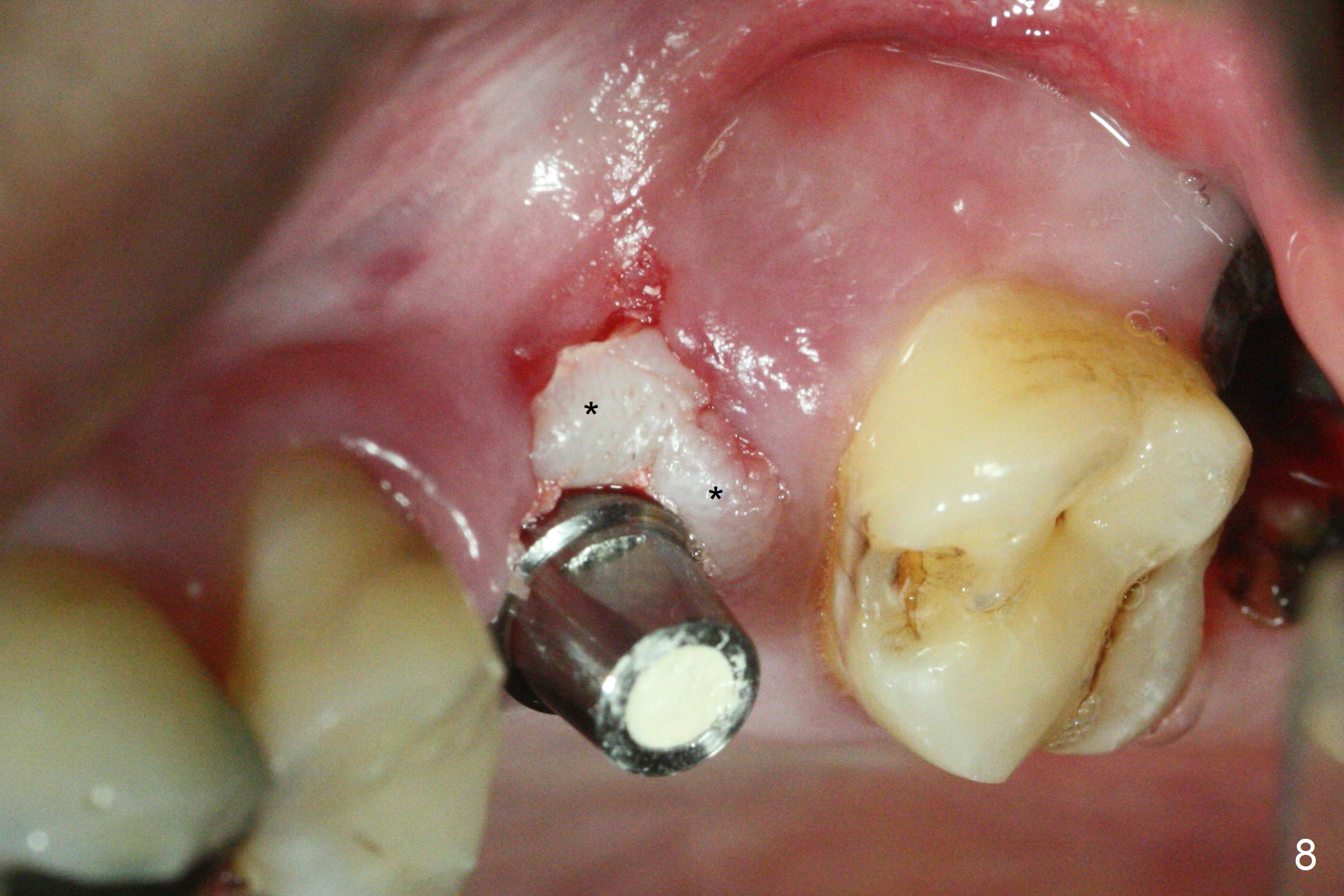 After extraction of the distobuccal residual root of the tooth #14 (Fig.1 arrow), the gingiva around the socket does not look like the keratinized one (Fig.2 *). An osteotomy through the distobuccal socket would seem too buccal for immediate implant. The palatal gingiva feels too tough to be stretched. An incision is made (Fig.3 dashed line); with elevation, the thick flap is transferred buccally (curved arrow). An osteotomy is initiated in the palatal bone with 1.5 mm drill, followed by Magic Expanders until 4.3 mm for 11 mm (Fig.4,5). Following Magic Drill 3.8x13 mm, the sinus membrane is found to be perforated. The latter is repaired with Osteogen plug. A 4.5x9 mm IBS implant is placed with 50 Ncm (Fig.6). Osteogen plug and allograft (Fig.7 *) are inserted into the remaining distobuccal socket (reduced after bone expansion). When a 5.5x4(4) mm abutment is placed, the transferred flap appears to be adapted to the distobuccal defect (Fig.8 *). Later one suture is placed for fixation. After provisional insertion, periodontal dressing is applied. Nine days postop, the periodontal dressing dislodges. When the loose provisional is removed for recementation, the flap seem to have healed (Fig.9 *). The gingiva heals around the abutment 5 months postop (Fig.9); the distal socket appears to heal while the bone graft remains at the crest (Fig.11,12). When #30 develops buccal abscess, the patient masticates on the left, leading to loss of composite at #13 (Fig.14); in fact the abutment at #14 is incompletely seated.