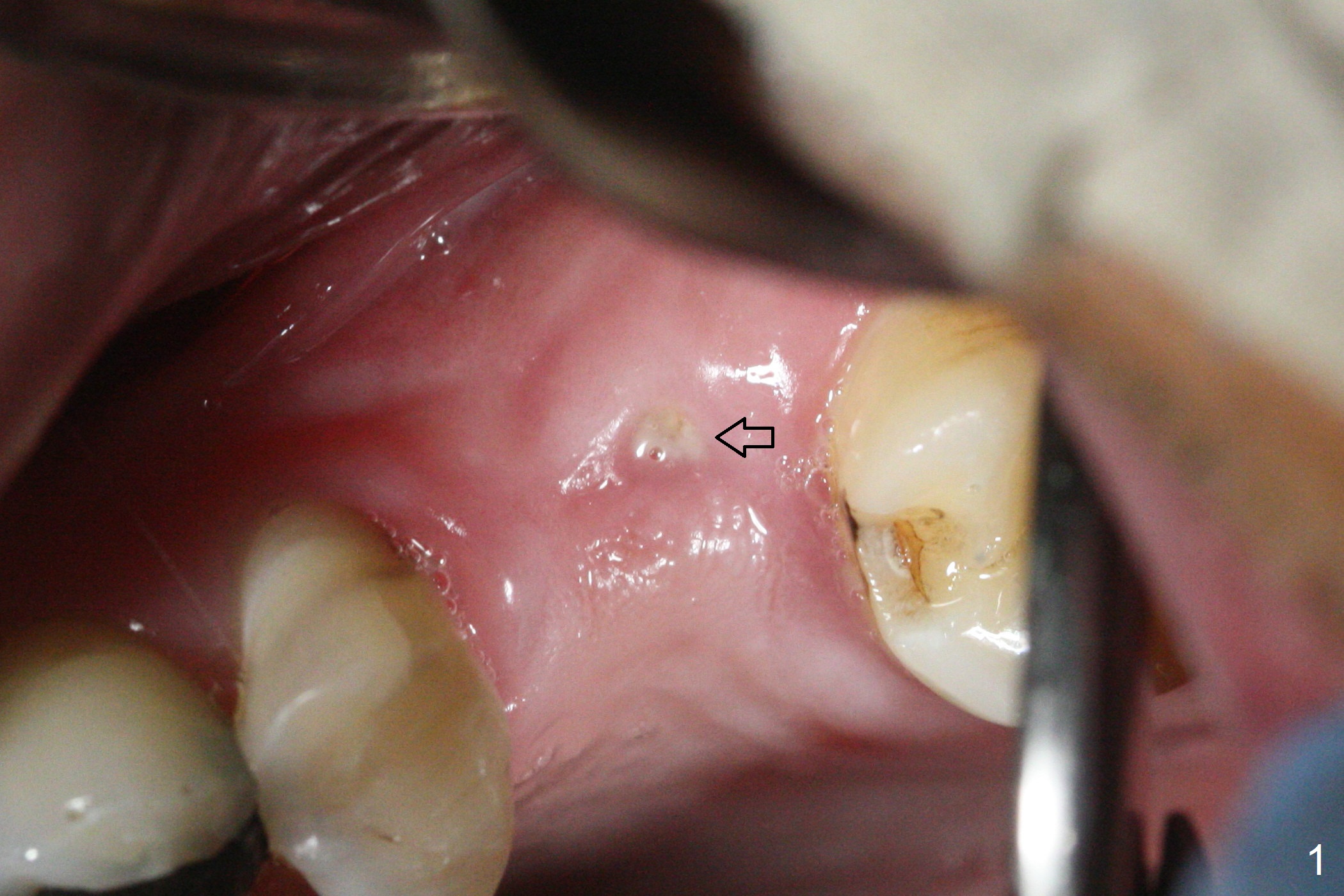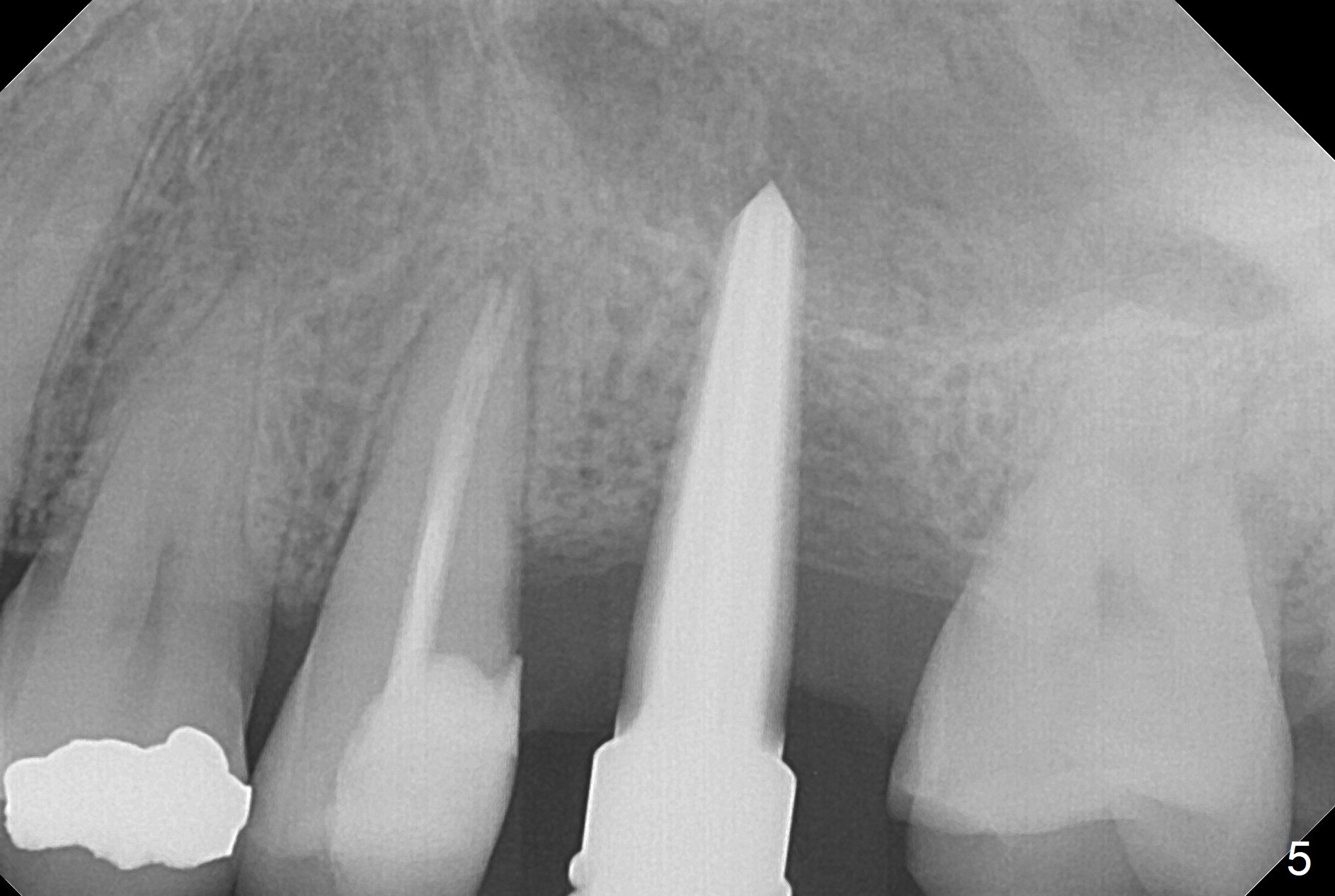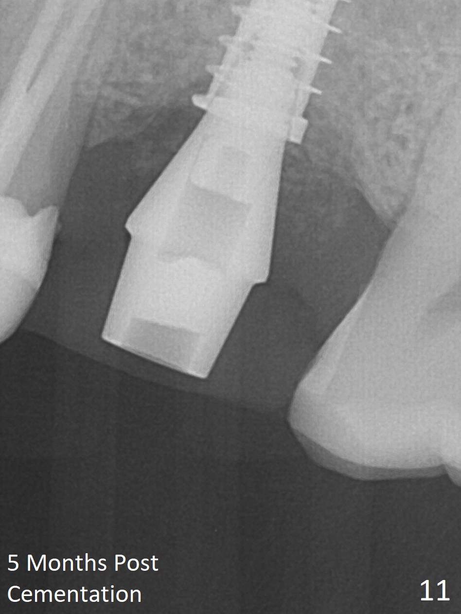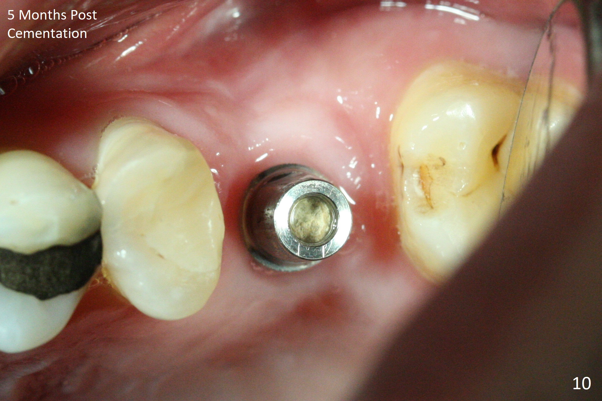 After extraction of the distobuccal residual root of the tooth #14 (Fig.1 arrow), the gingiva around the socket does not look like the keratinized one (Fig.2 *). An osteotomy through the distobuccal socket would seem too buccal for immediate implant. The palatal gingiva feels too tough to be stretched. An incision is made (Fig.3 dashed line); with elevation, the thick flap is transferred buccally (curved arrow). An osteotomy is initiated in the palatal bone with 1.5 mm drill, followed by Magic Expanders until 4.3 mm for 11 mm (Fig.4,5). Following Magic Drill 3.8x13 mm, the sinus membrane is found to be perforated. The latter is repaired with Osteogen plug. A 4.5x9 mm IBS implant is placed with 50 Ncm (Fig.6). Osteogen plug and allograft (Fig.7 *) are inserted into the remaining distobuccal socket (reduced after bone expansion). When a 5.5x4(4) mm abutment is placed, the transferred flap appears to be adapted to the distobuccal defect (Fig.8 *). Later one suture is placed for fixation. After provisional insertion, periodontal dressing is applied. Nine days postop, the periodontal dressing dislodges. When the loose provisional is removed for recementation, the flap seem to have healed (Fig.9 *). The gingiva heals around the abutment 5 months postop (Fig.9); the distal socket appears to heal while the bone graft remains at the crest (Fig.11,12). When #30 develops buccal abscess, the patient masticates on the left, leading to loss of composite at #13 (Fig.14); in fact the abutment at #14 is incompletely seated.