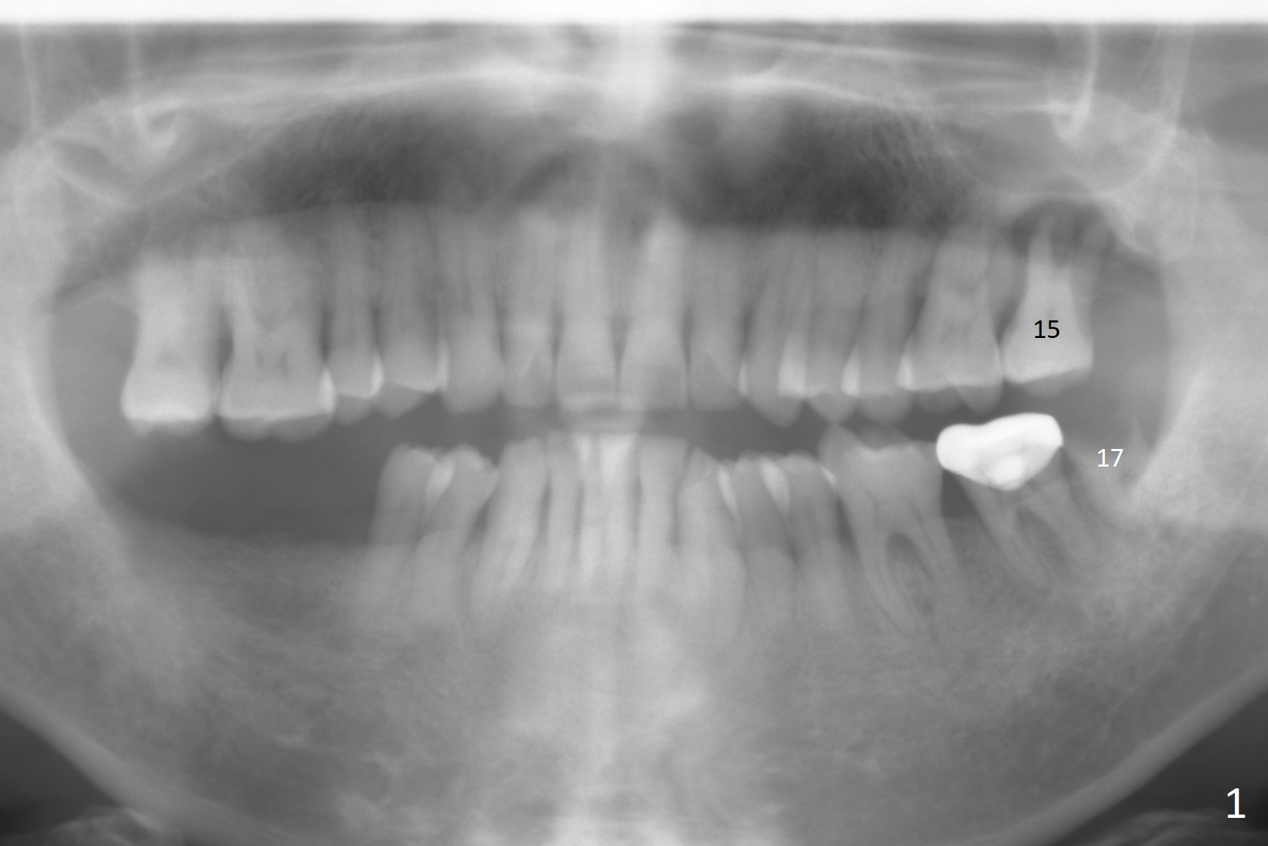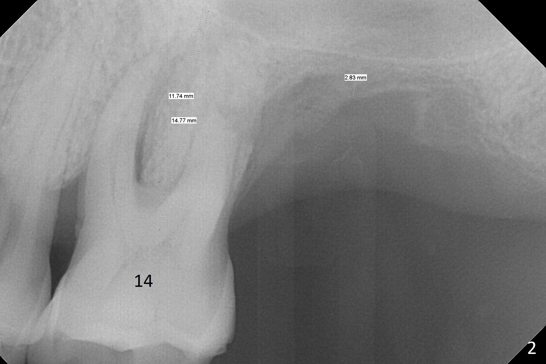 A 64-year-old man has poor dentition (Fig.1 (taken a year ago)). After extraction of #15 and 17 in China, the tooth #14 develops retrograde pulpitis with severe buccopalatal gingival recession (Fig.2). It appears that the septum is longer than the buccopalatal plates. A small and relatively long implant (3.8 or 4x11.5 mm) is placed within the boundary of the septum. The most peripheral socket is packed with PRF membranes (2-3 tubes) and collagen plug, while the portion close to the implant threads with Vera Graft. Please remember osteotomy depths with hard and soft tissue landmarks (Fig.2).