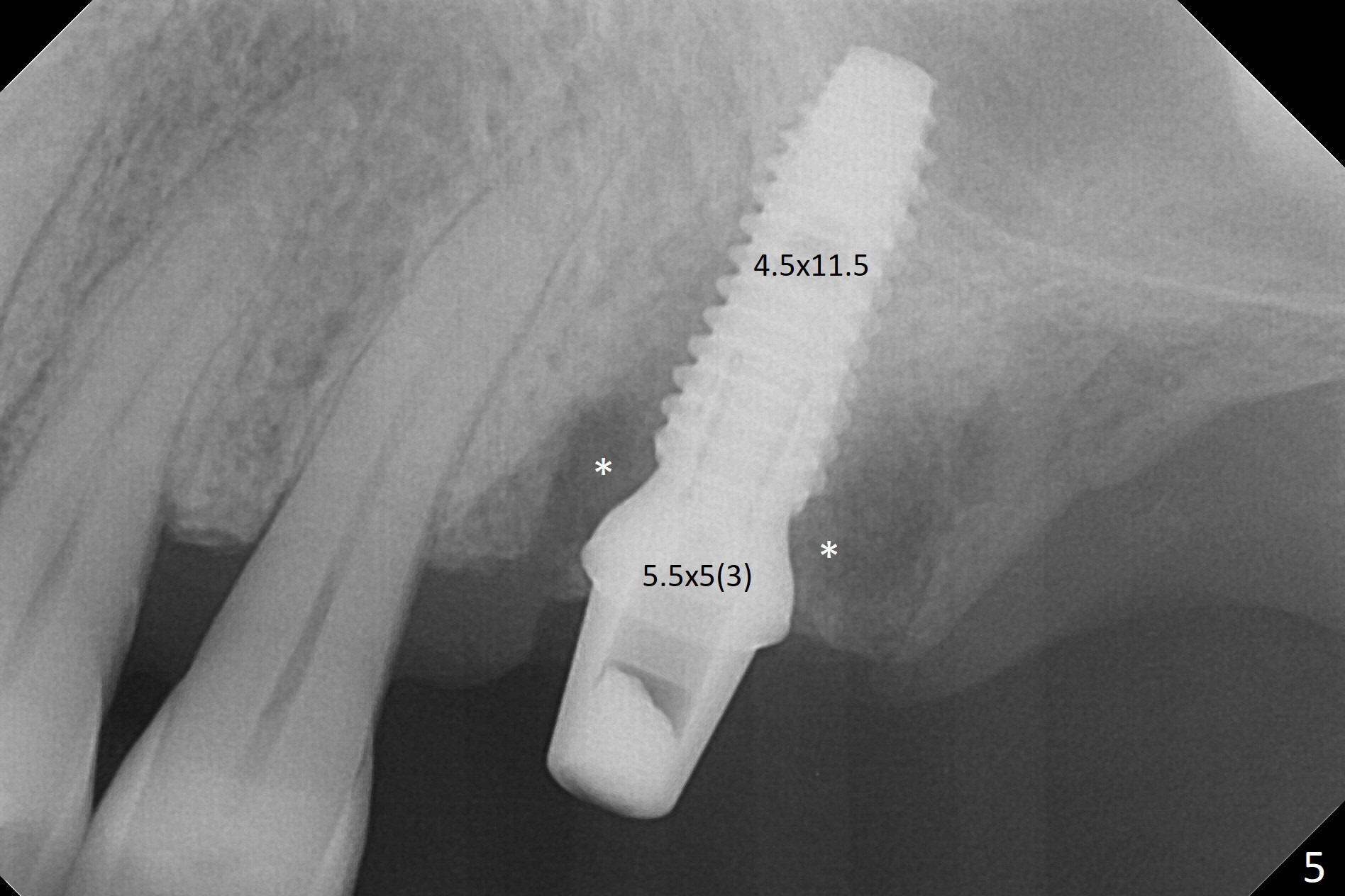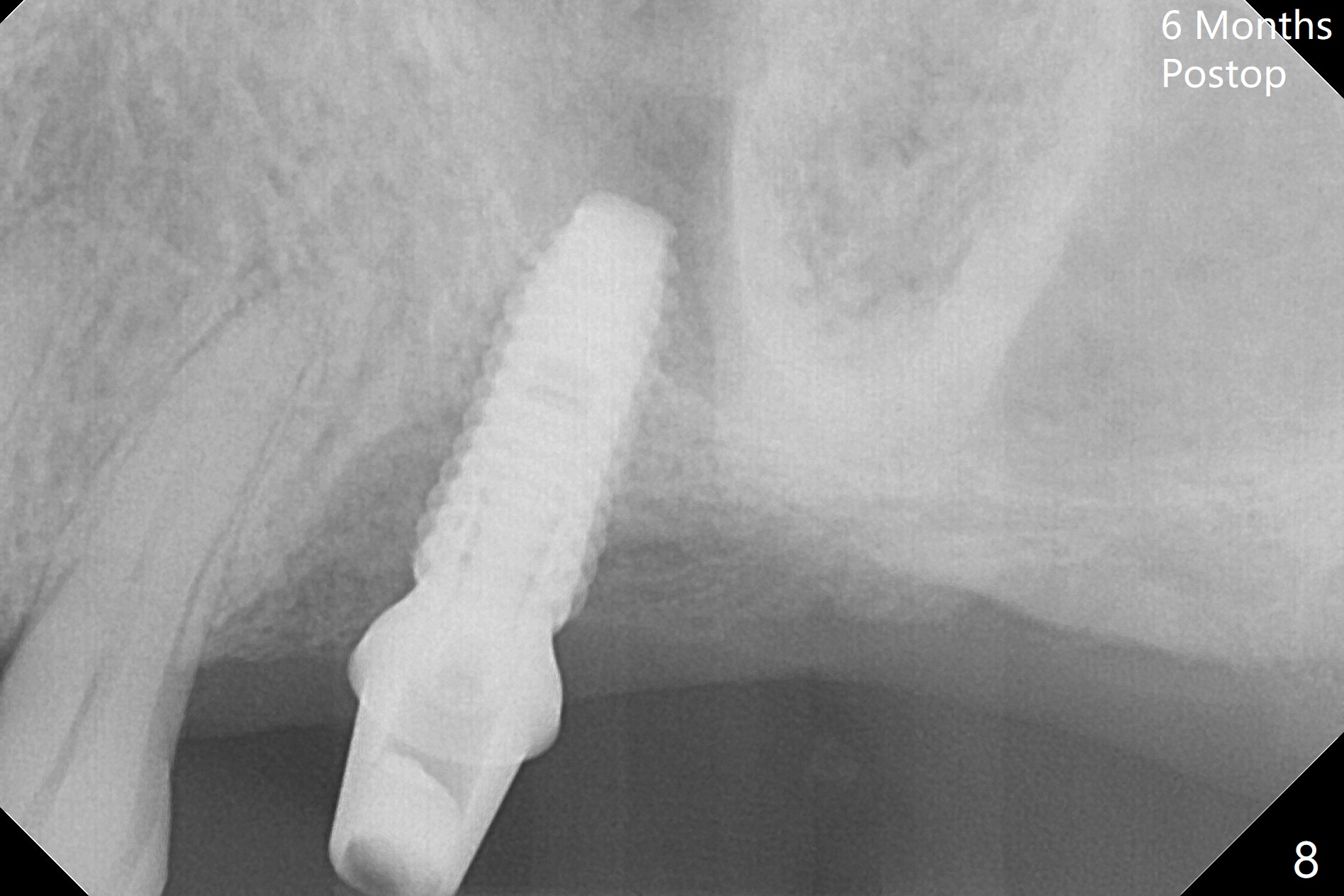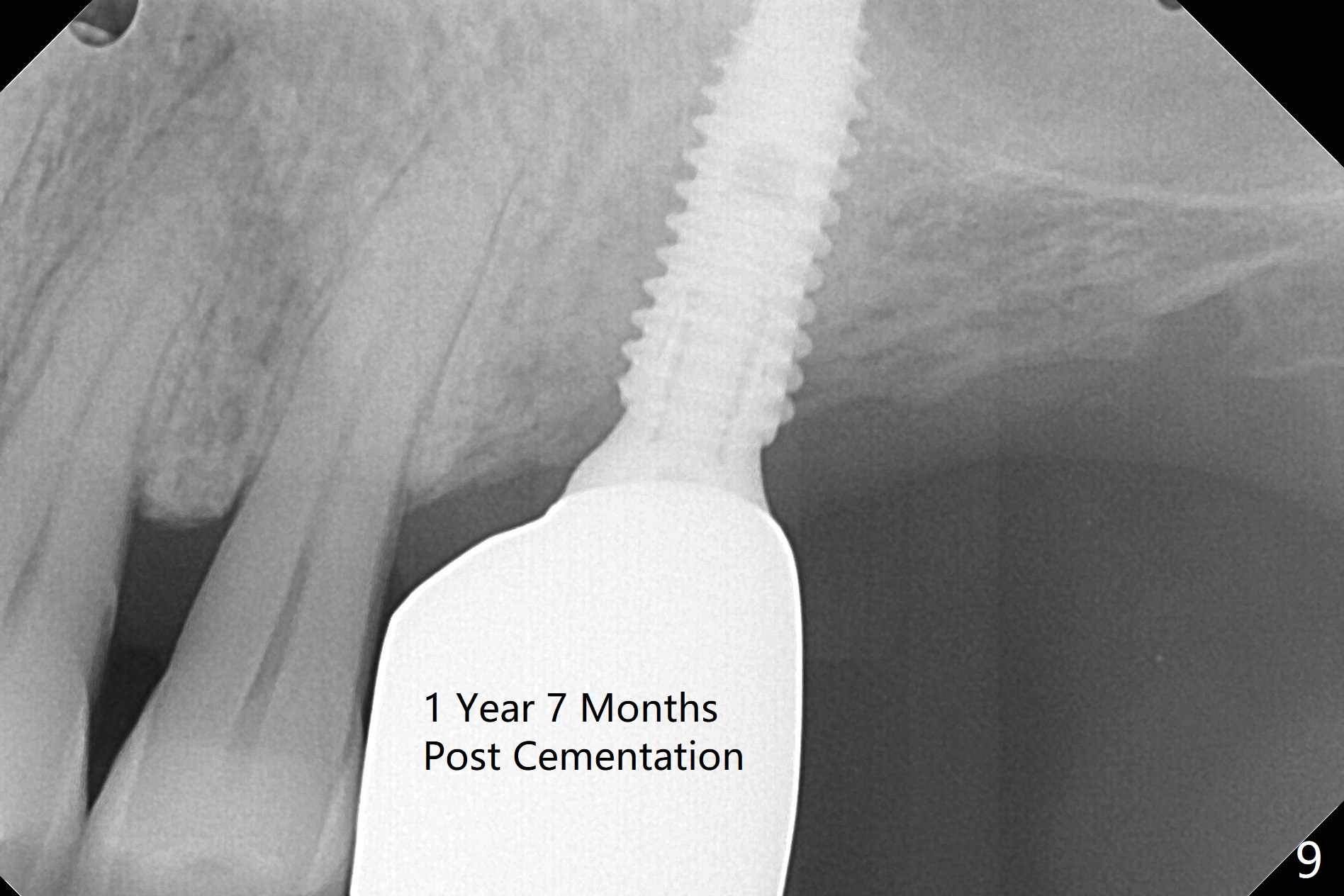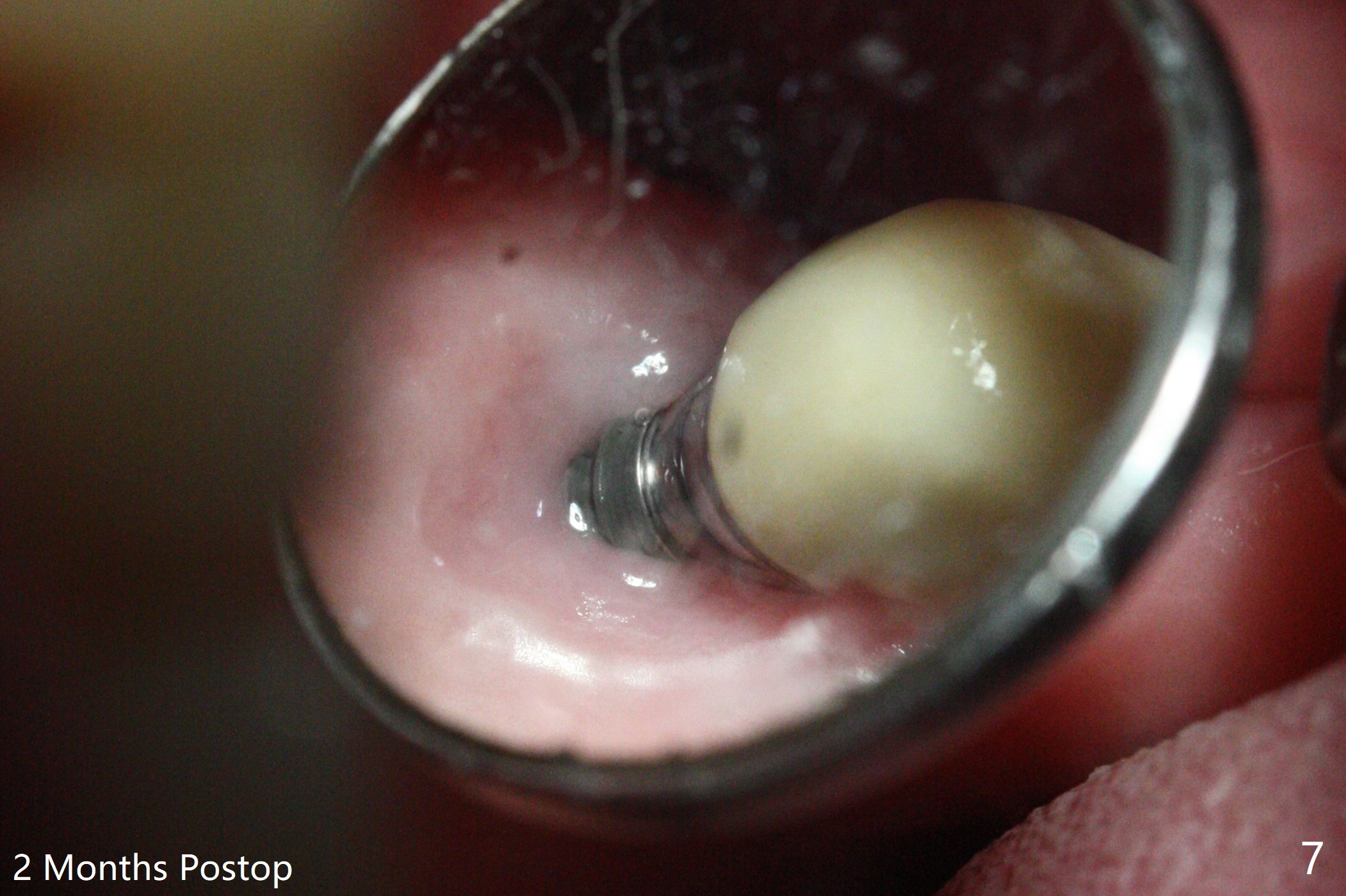 Buccal gingival recession at #14 (Fig.1) is less severe than the palatal one (Fig.2). Without raising the buccal gingiva (Fig.3 B), osteotomy in the septum is established apparently in the middle socket (Fig.3 *, 4). As the osteotomy increases with 3.8 mm drill, the palatal wall of the osteotomy starts to be perforating. When a 4.5x11.5 mm implant is placed, palatal threads are exposed, to which autogenous bone and Vera Graft are placed (Fig.5 *). After placement of a 5.5x5(3) mm abutment, an immediate provisional (Fig.6 P) is fabricated to cover the sockets. If the septal dimension were studied carefully by raising the buccal gingiva slightly, the osteotomy could be initially more buccal so that the palatal thread exposure could be less. When the provisional is removed 1.5 months postop, the implant is exposed palatally. The margin of the provisional is modified so that the implant can be cleaned by the patient using Water Pik. In fact, the healthy gingiva seems to be attached to the implant threads 2 weeks later (Fig.7). The distal implant threads remains exposed 6 months postop; it appears that the distal socket wall has resorbed (Fig.8). The sockets heal 1 year 7 months post cementation (Fig.9).