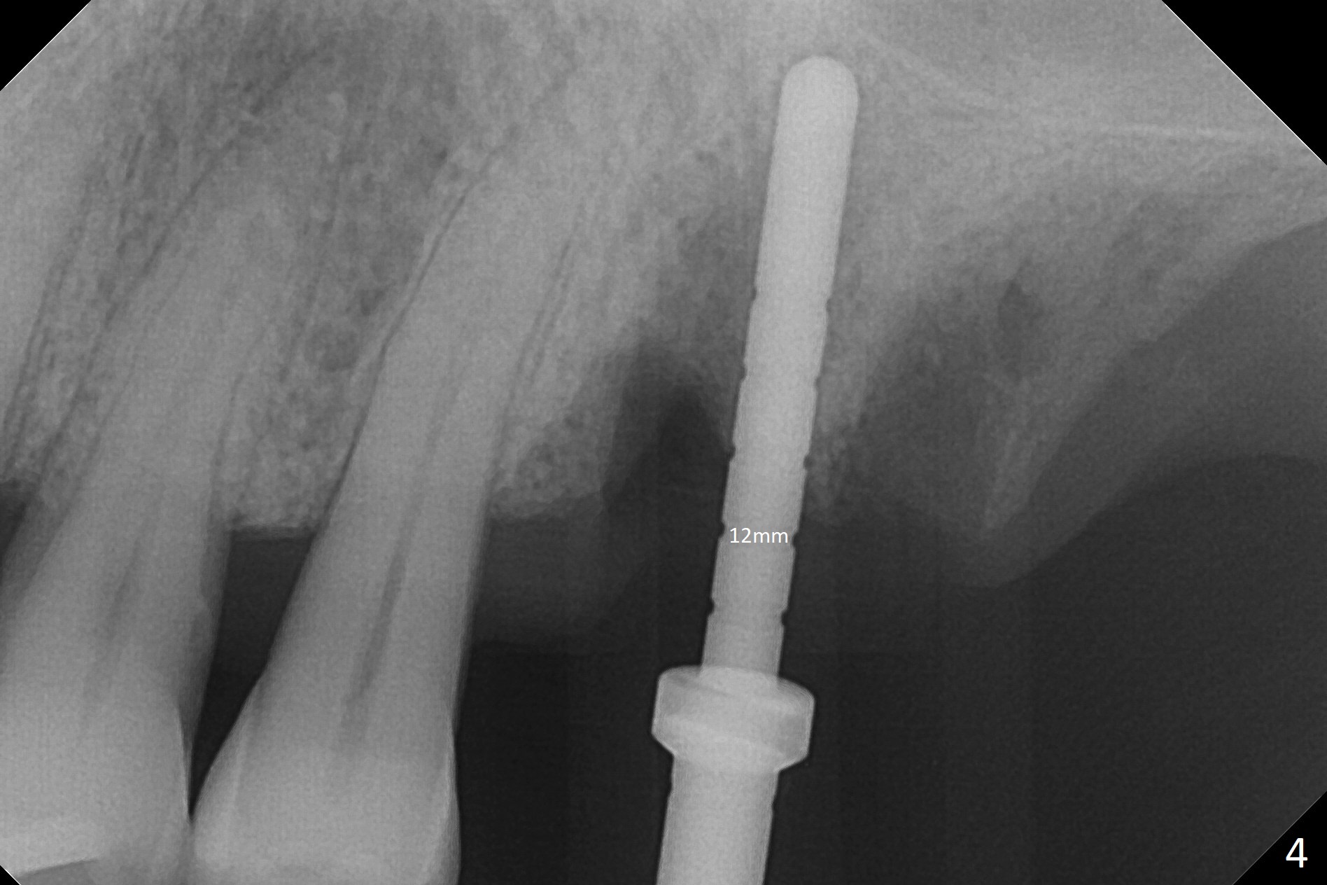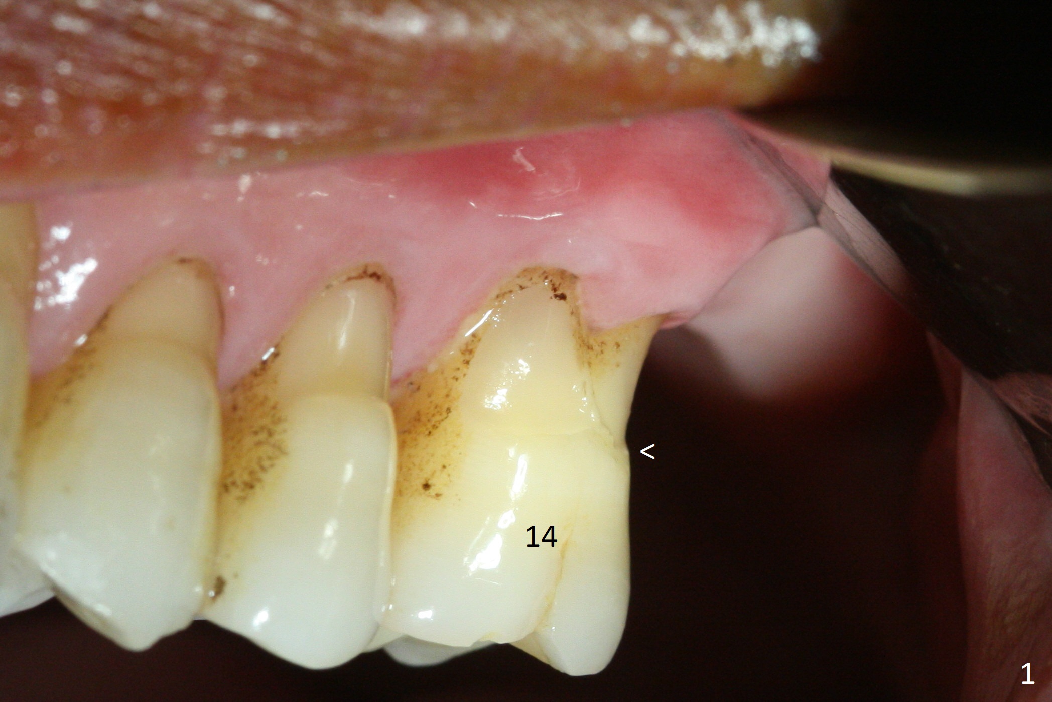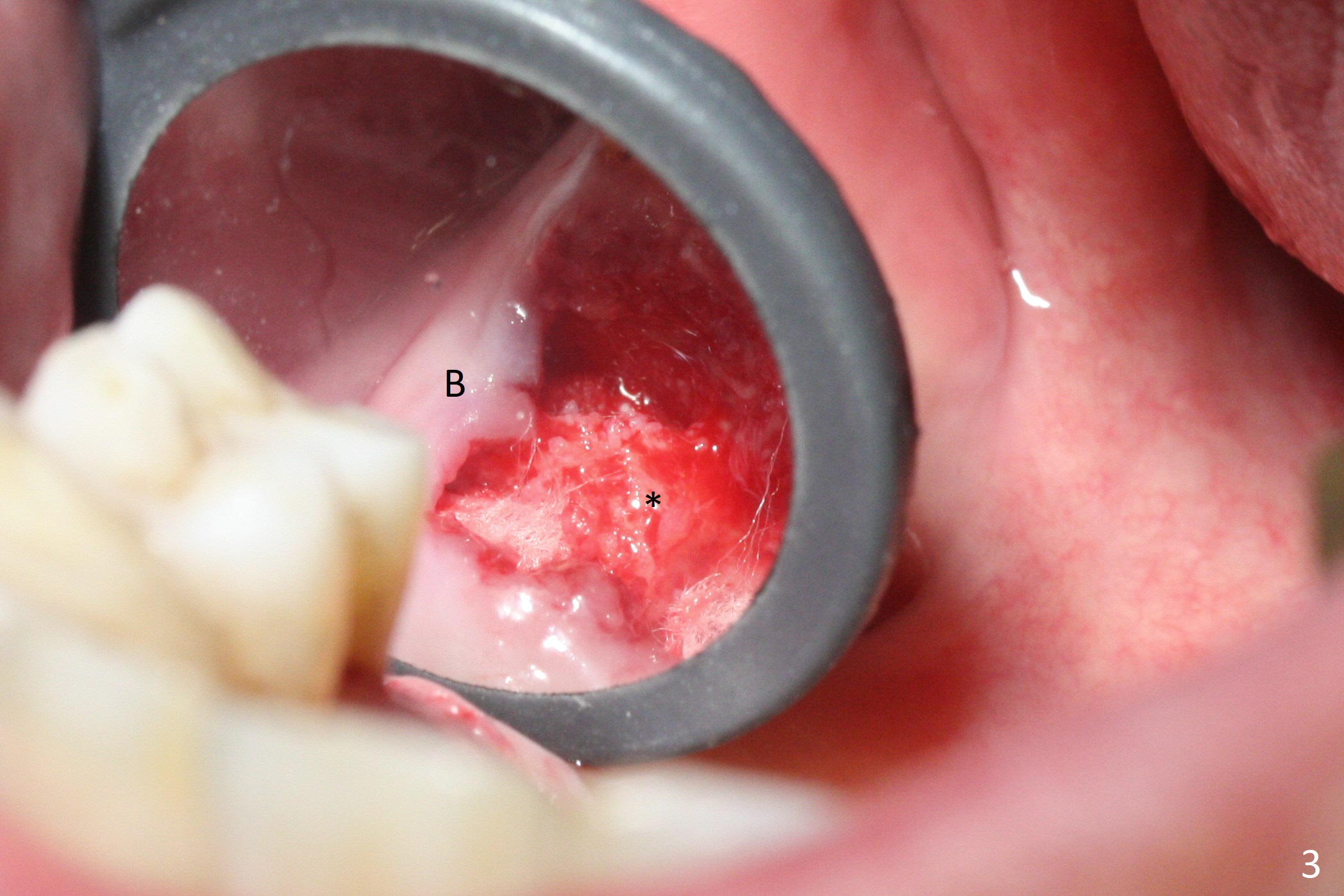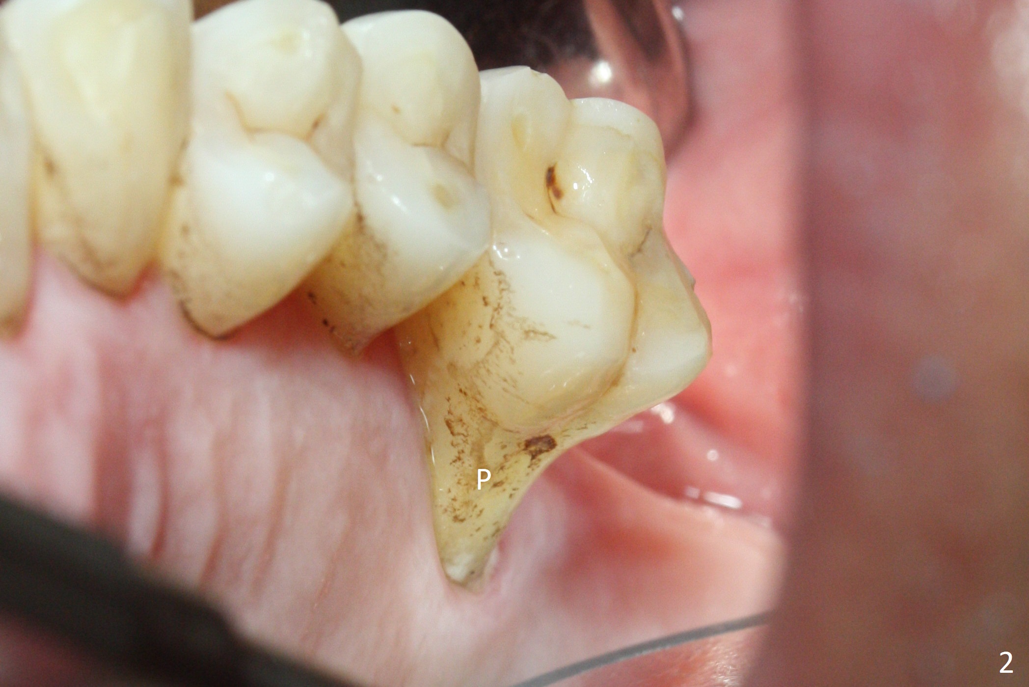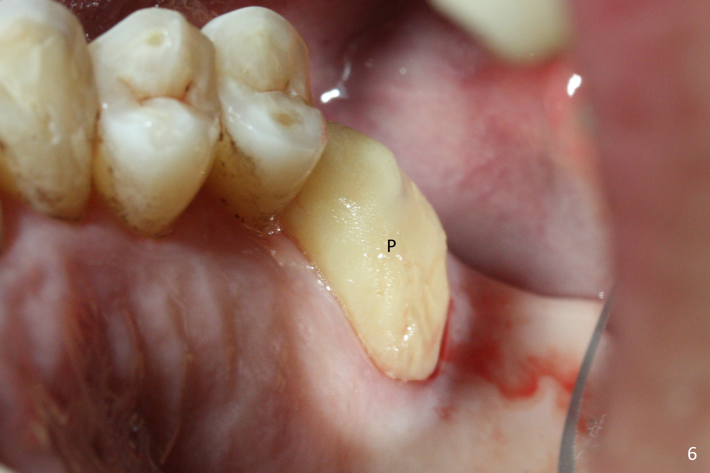 Buccal gingival recession at #14 (Fig.1) is less severe than the palatal one (Fig.2). Without raising the buccal gingiva (Fig.3 B), osteotomy in the septum is established apparently in the middle socket (Fig.3 *, 4). As the osteotomy increases with 3.8 mm drill, the palatal wall of the osteotomy starts to be perforating. When a 4.5x11.5 mm implant is placed, palatal threads are exposed, to which autogenous bone and Vera Graft are placed (Fig.5 *). After placement of a 5.5x5(3) mm abutment, an immediate provisional (Fig.6 P) is fabricated to cover the sockets. If the septal dimension were studied carefully by raising the buccal gingiva slightly, the osteotomy could be initially more buccal so that the palatal thread exposure could be less. When the provisional is removed 1.5 months postop, the implant is exposed palatally. The margin of the provisional is modified so that the implant can be cleaned by the patient using Water Pik. In fact, the healthy gingiva seems to be attached to the implant threads 2 weeks later (Fig.7). The distal implant threads remains exposed 6 months postop; it appears that the distal socket wall has resorbed (Fig.8). The sockets heal 1 year 7 months post cementation (Fig.9).