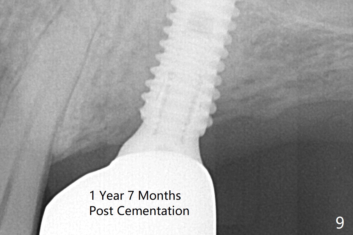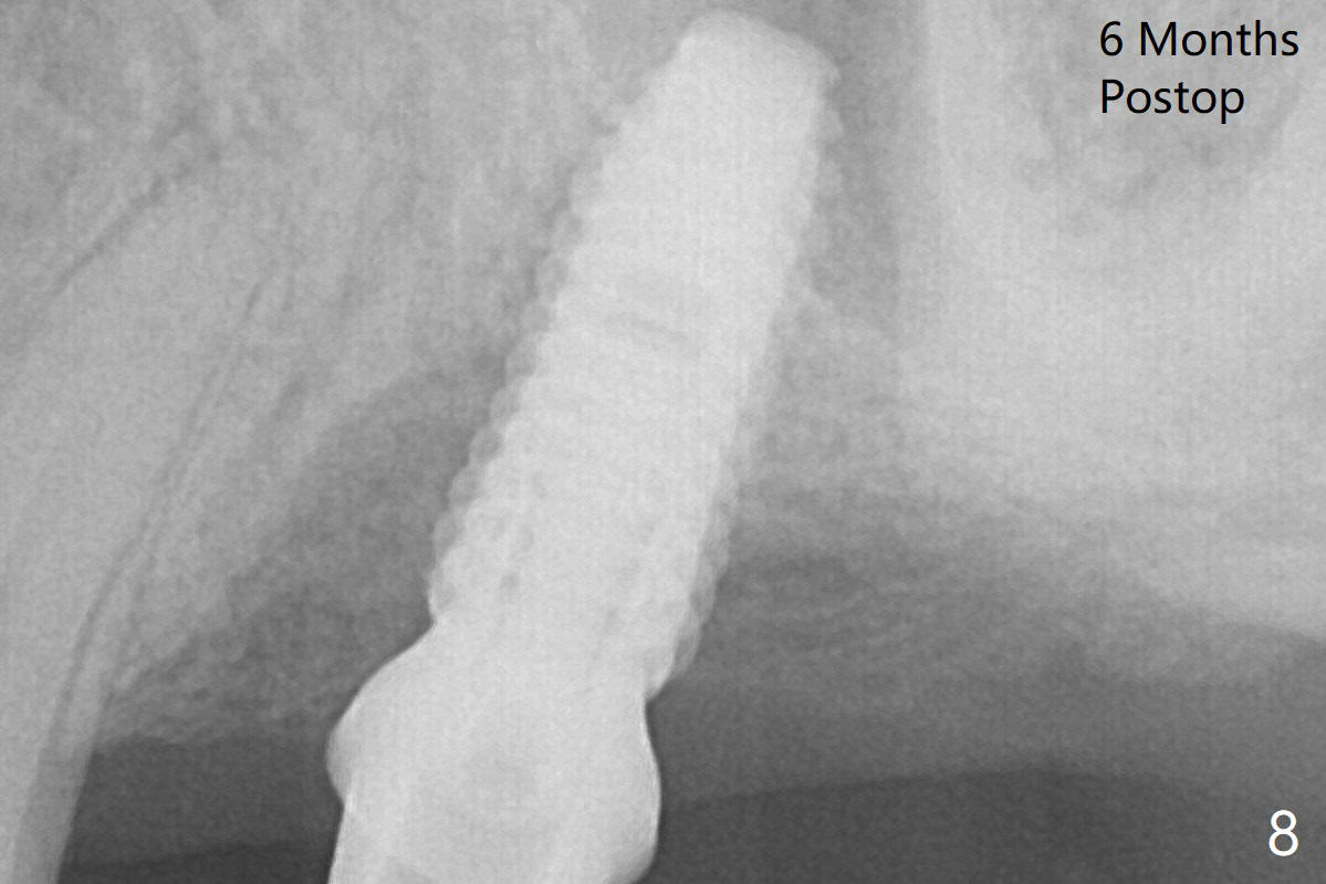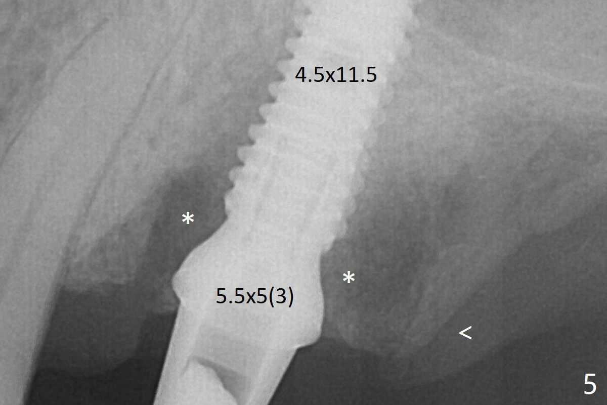 When a 4.5x11.5 mm implant is placed (>35 Ncm), palatal threads are exposed, to which autogenous bone and Vera Graft (Fig.5 *) are placed with a 5.5x5(3) mm abutment. The distal implant threads remains exposed 6 months postop; it appears that the distal socket wall (Fig.7 <) has resorbed (Fig.8). That is a probable reason that the distal threads are exposed. The sockets heal 1 year 7 months post cementation (Fig.9).