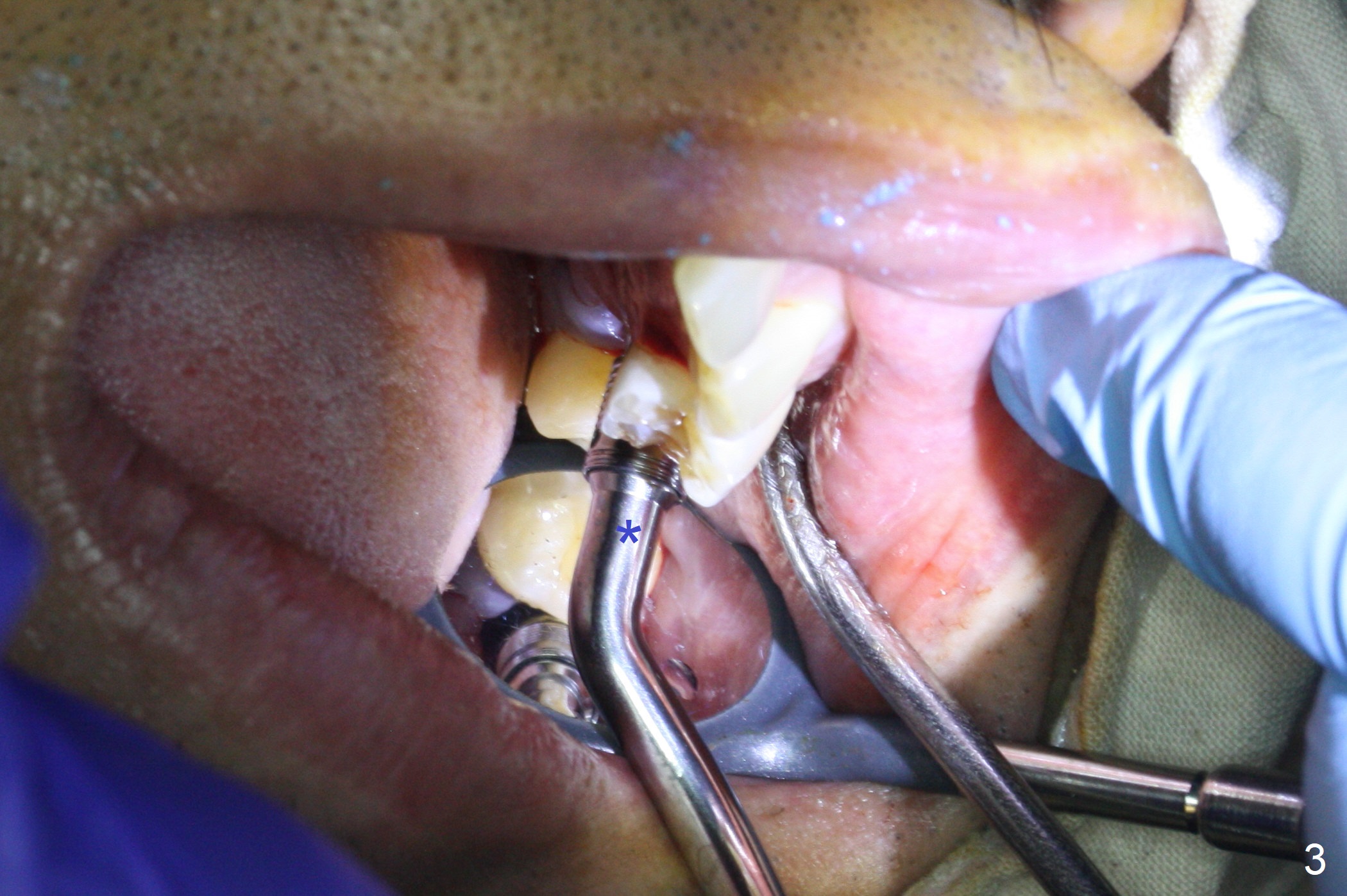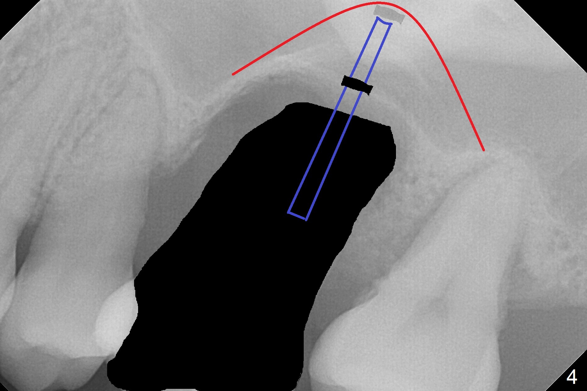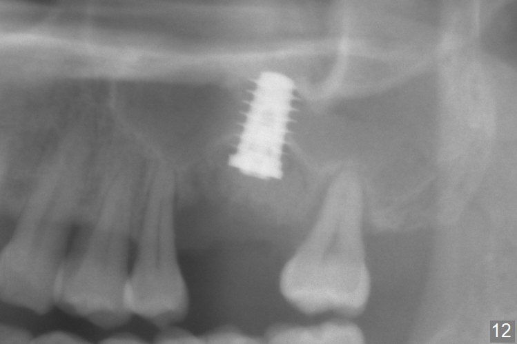 When the displaced tooth #14 (Fig.1) with palatal gingival recession (Fig.2) is extracted, the buccal plate is low, while the palatal one is lost. Osteotomy is initiated in the bottom of the large socket with Marking Drill. The bone turns bluish, suggesting thin bone (in fact less than 1 mm as well as low density). Magic Sinus Lifter (Fig.3 *, Fig.4 blue area) is used for sinus lift (Fig.4 (red curved line: lifted sinus membrane; grey area: a portion of the lifted sinus floor), followed by insertion of a piece of PRF plug and Vanilla bone graft for sinus lift. The osteotomy is enlarged lightly with 4.8 mm Magic Drill (compare black strips between Fig.4,5). A 5x9 mm dummy implant (Fig.5 green) is dislodged into the sinus. The lifted sinus membrane holds the implant in place. The black thin strip in Fig.5 and black circle in Fig.6a (occlusal view) represents the osteotomy. After increase in the osteotomy with Lindamann bur (Fig.6b red circle), the implant (Fig.6c green) is retrieved with endodontic forceps (Fig.6c two blue dots (beaks of the forceps); Fig.7,8). With the enlarged osteotomy (Fig.6d), a 6x9 mm dummy implant is placed deep (Fig.9). The definitive implant is 6.5x11 mm with insertion torque ~ 15 Ncm (Fig.10). With placement of a healing screw and further placement of allograft (Fig.11 *), the socket is closed with PRF membrane and collagen plug (Fig.12).