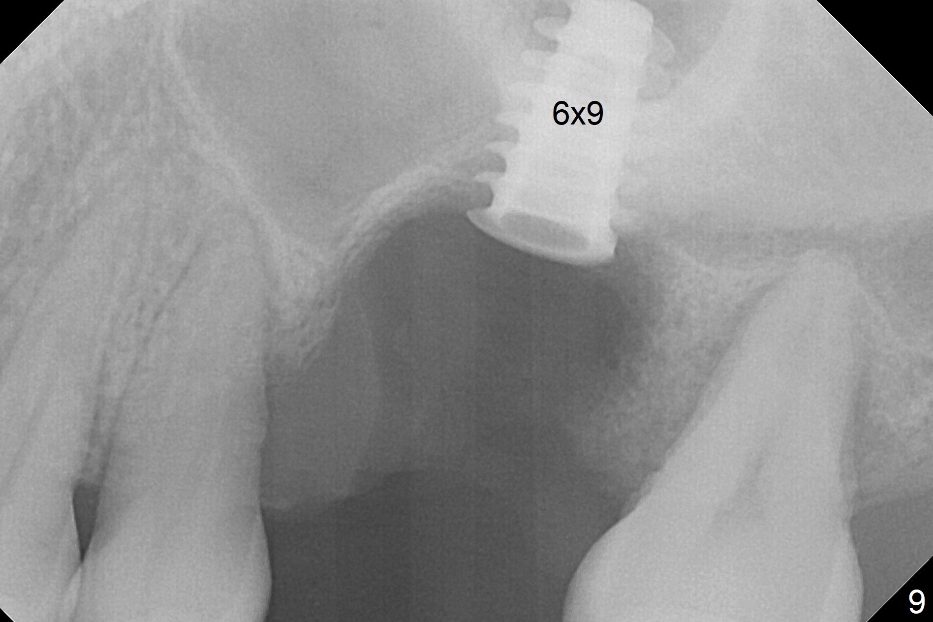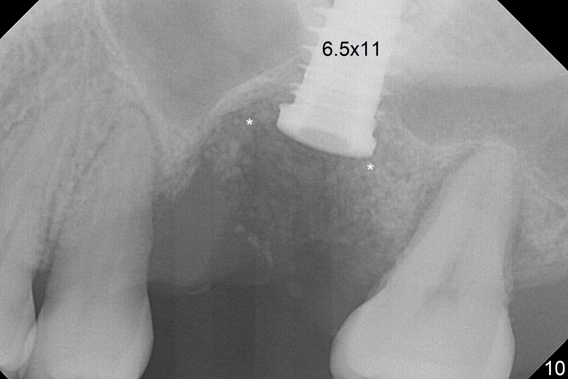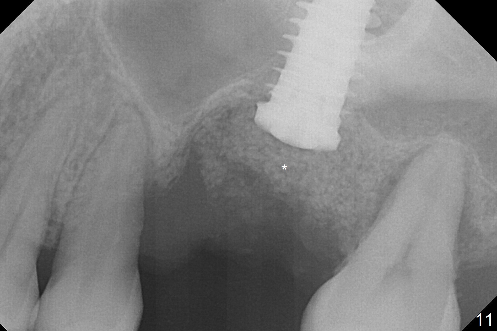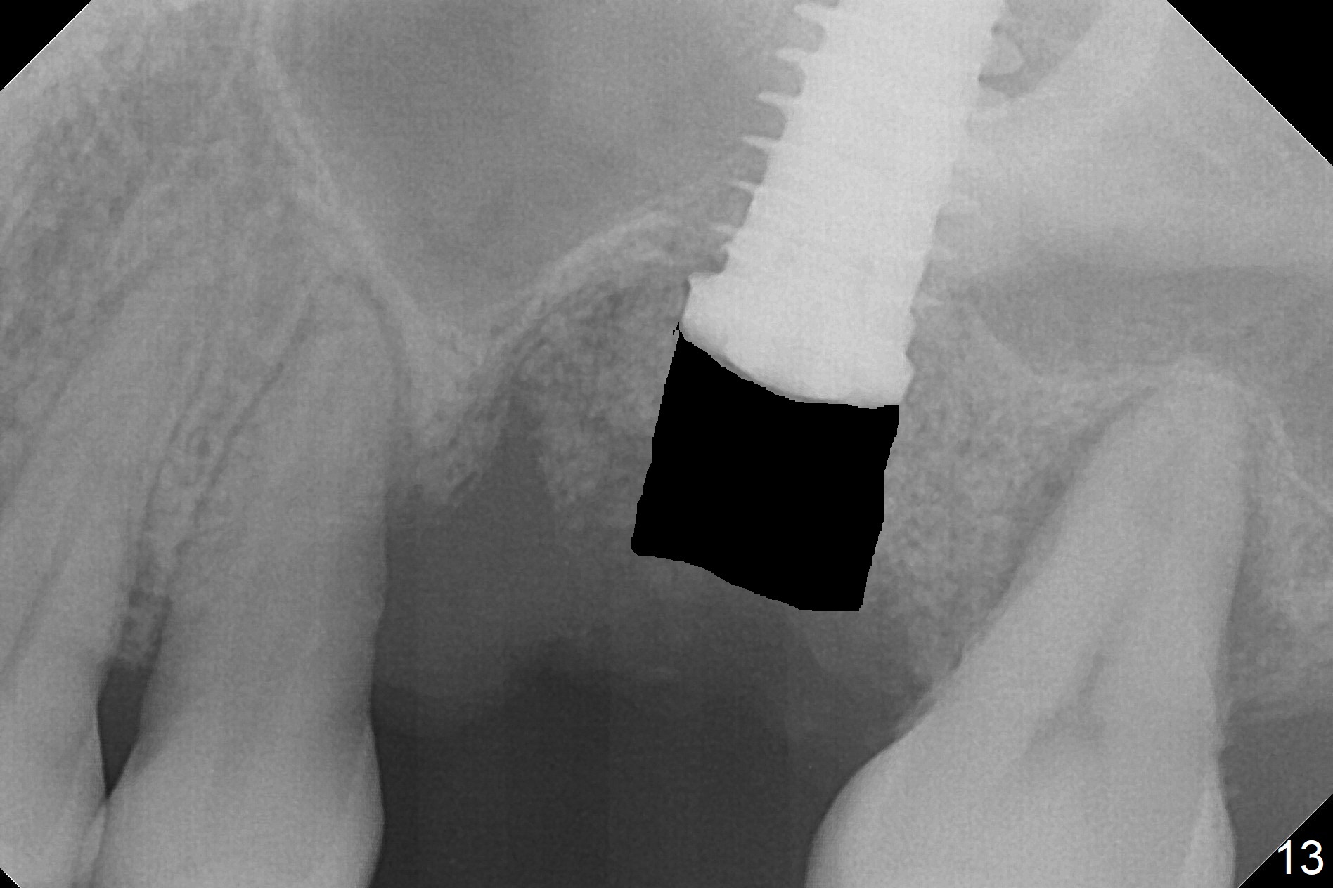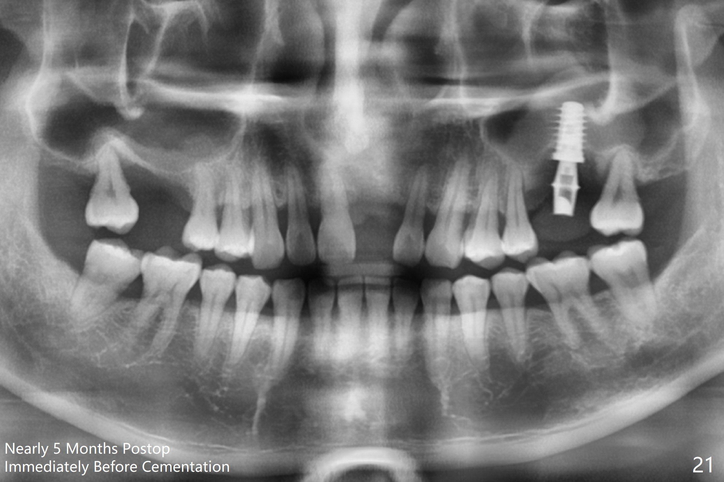 In fact, there is no coronal bone for the implant to be backed up. Therefore, impression is taken after uncover and insertion of a 5.5x5.7(4) mm abutment.