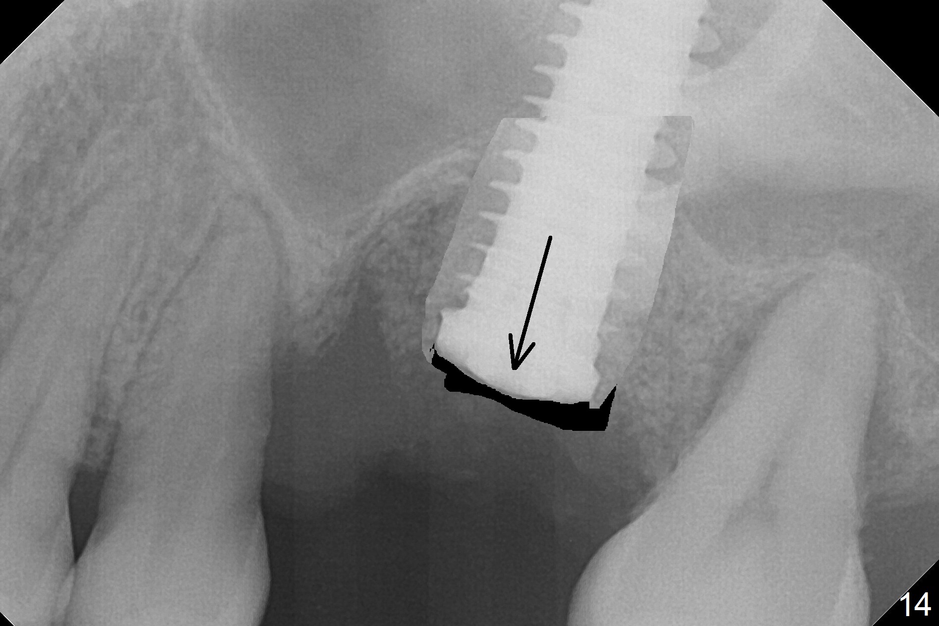 Questions for Dr. Wang: Can we remove the coronal portion of the bone (Fig.13) and back up the implant (Fig.14 arrow) 4-5 months postop for easy restoration? If it is not a good option, can we produce pair abutments with 5 and 7 mm cuffs?