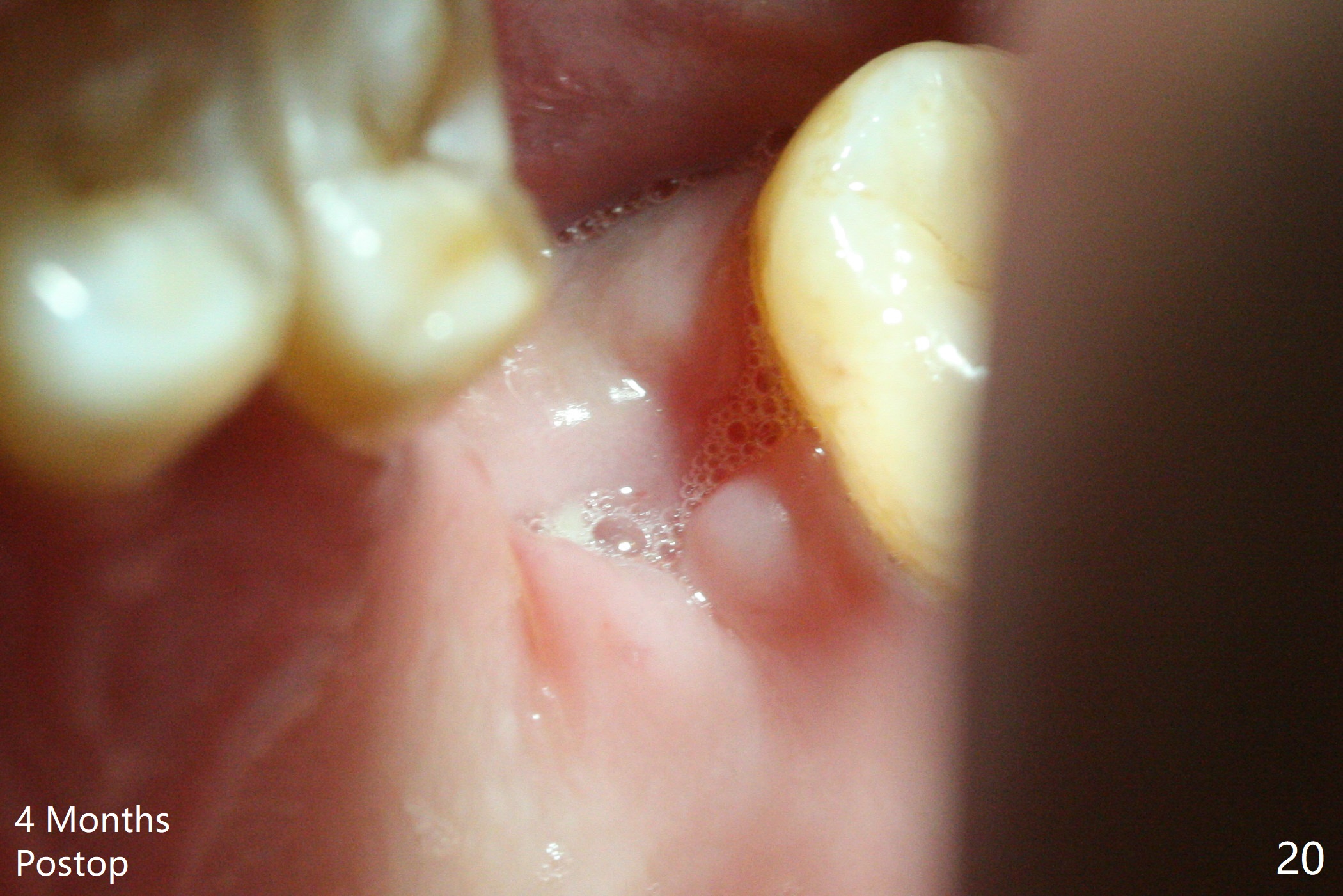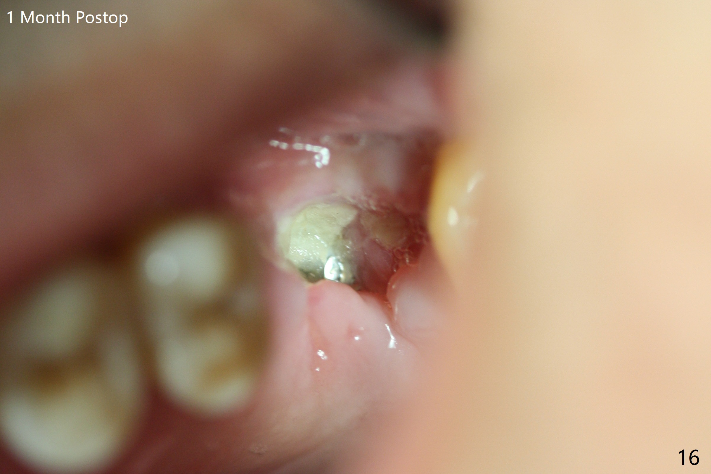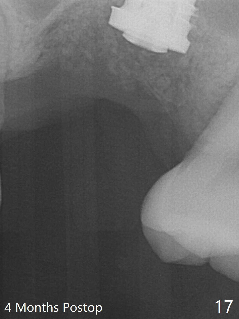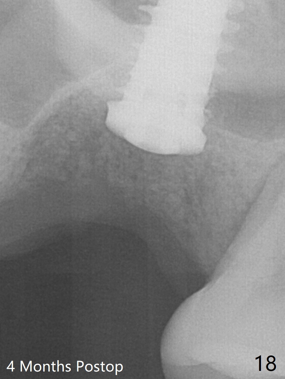 Poor visibility for immediate implant in the molar region is another contributing factor for the dislodgement. The patient returns for follow up 15 days (Fig.15) and 1 month (Fig.16) postop. Bone graft seems to be stable around the implant. The socket heals 4 months postop (Fig.20). The implant seems to have been osteointegrated (Fig.17,18). It will be backed up for ~ 3 mm to improve implant/crown ratio (Fig.19, as compared to Fig.14). If it cannot be done, take impression immediately and make a subgingival provisional before suturing.