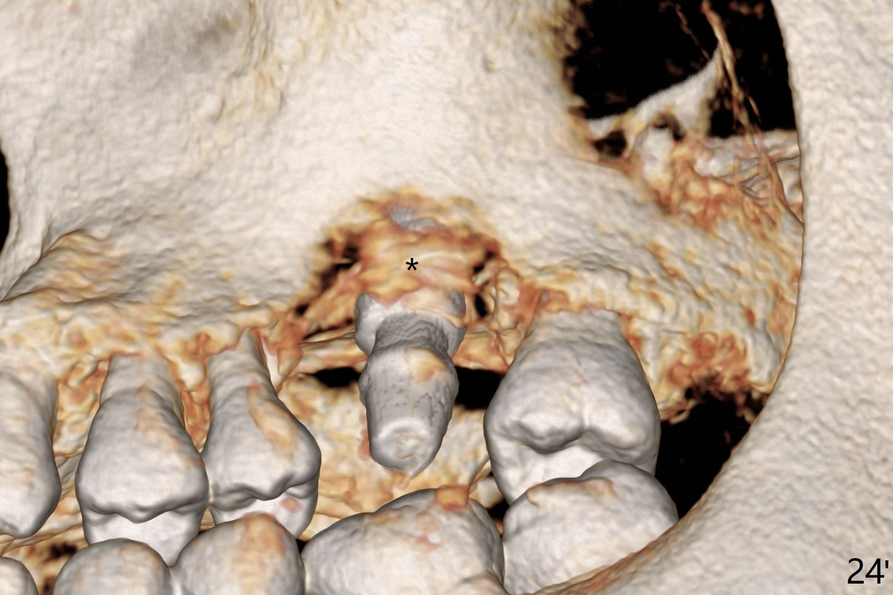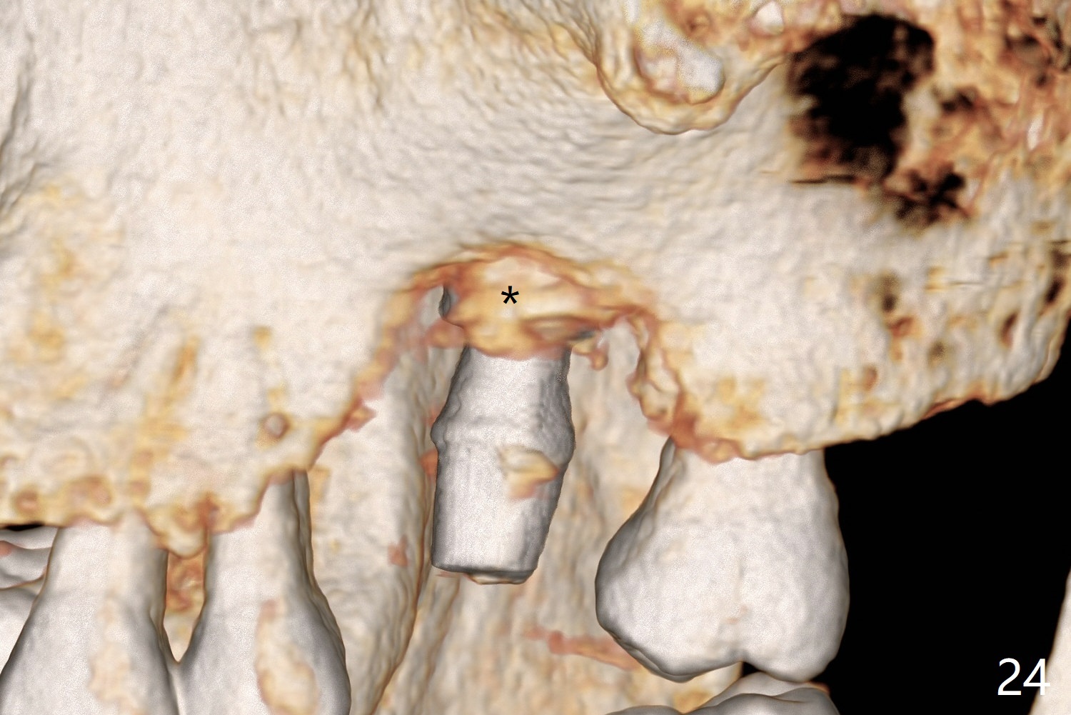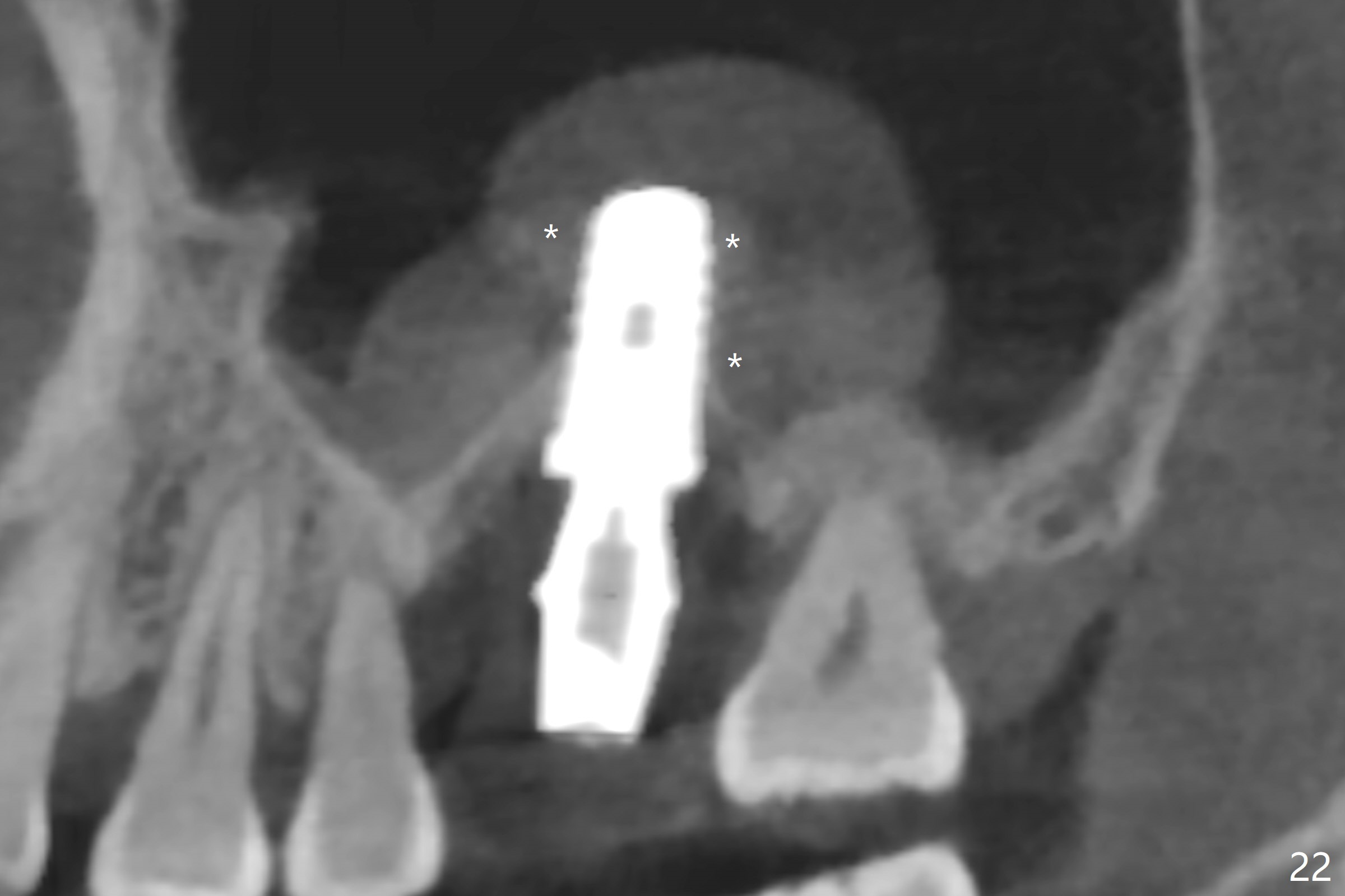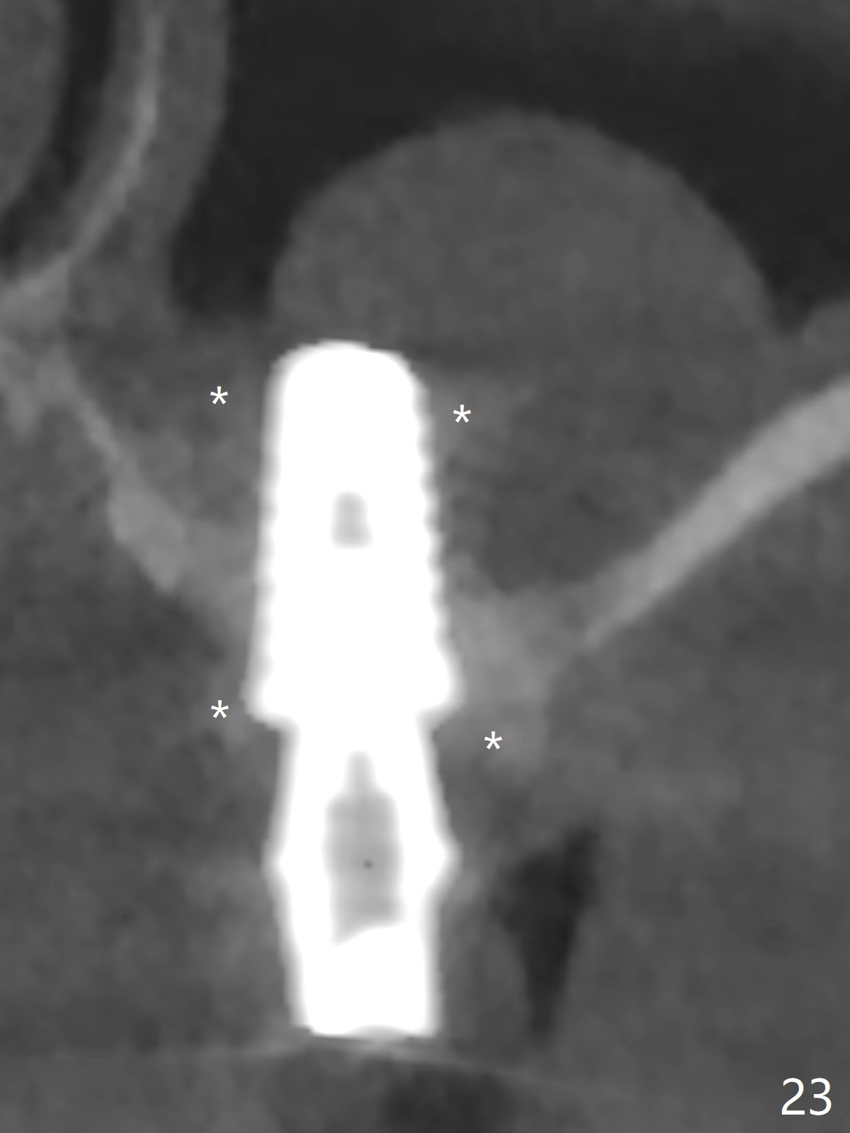 There is a mushroom around the implant nearly 5 months postop/immediately before cementation (Fig.21). The bone density around the implant is low (Fig.22-24' *).