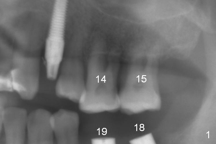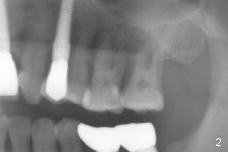 The teeth #14 and 15 of a 42-year-old man are supraerupted when implants are placed at #18 and 19 (Fig.1). Intrusion takes 6 months with 3 mini-implants. Fig.2 is taken 2 years after treatment.