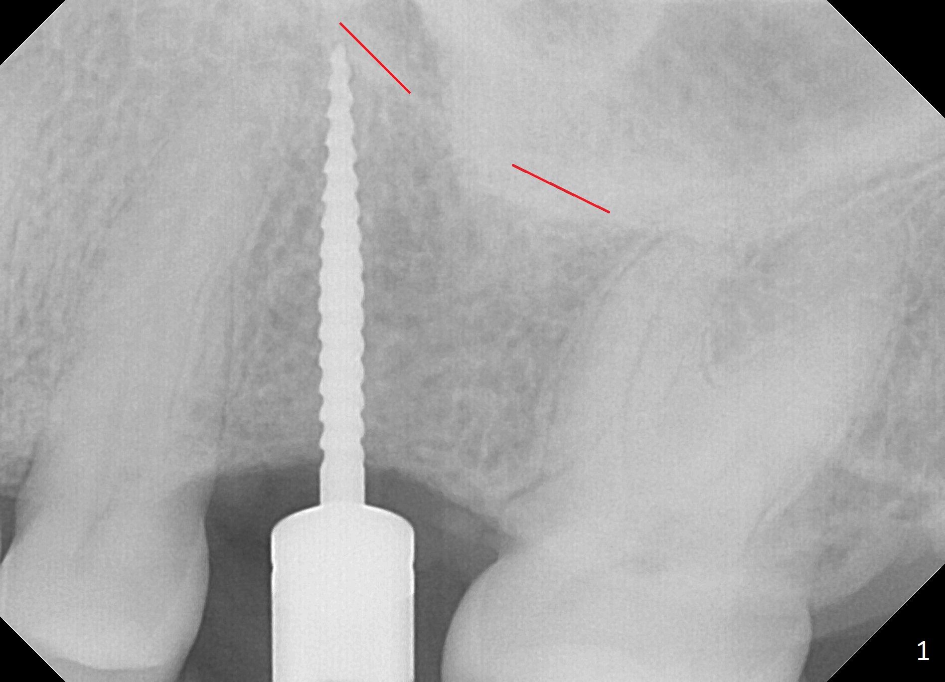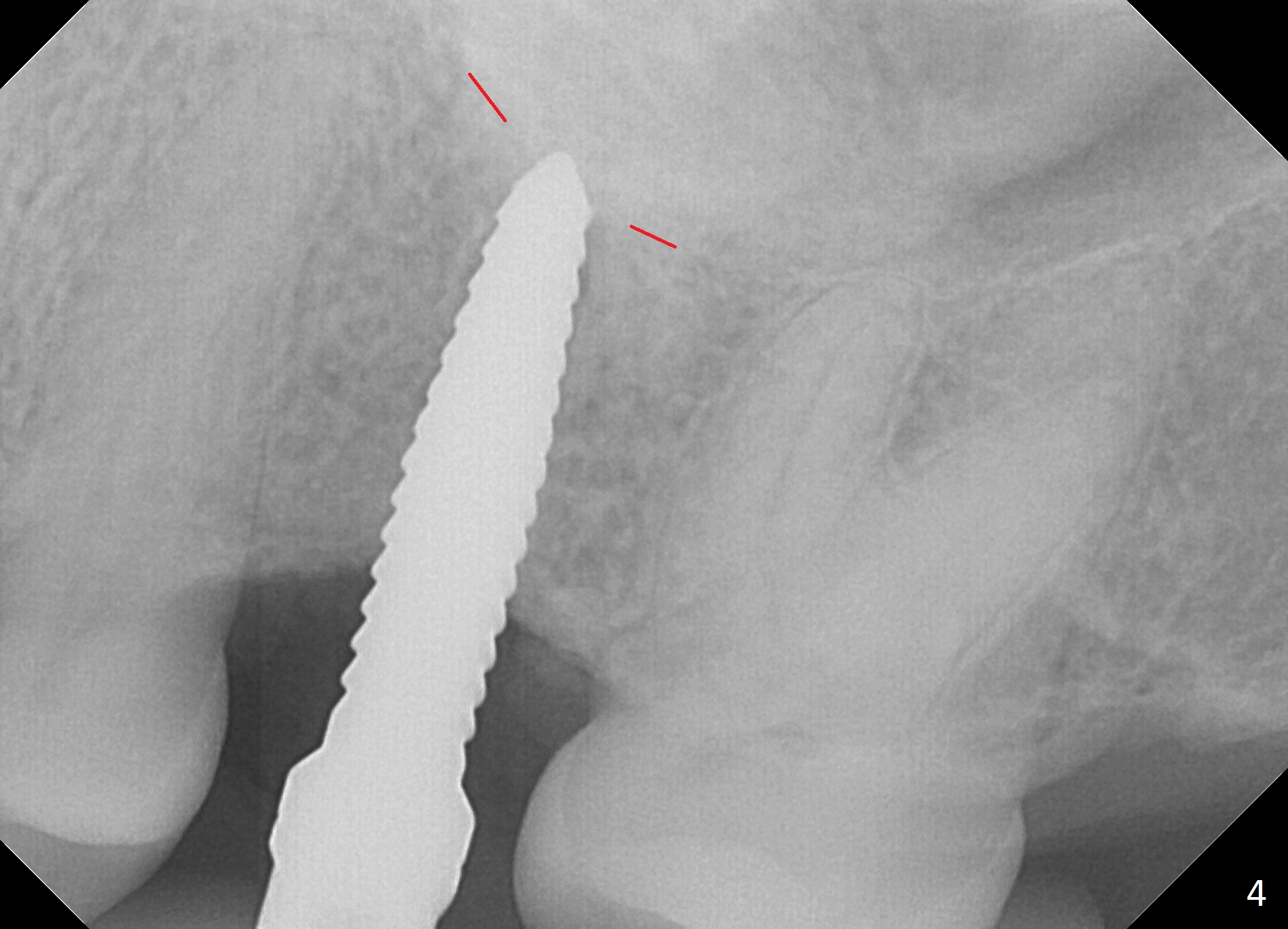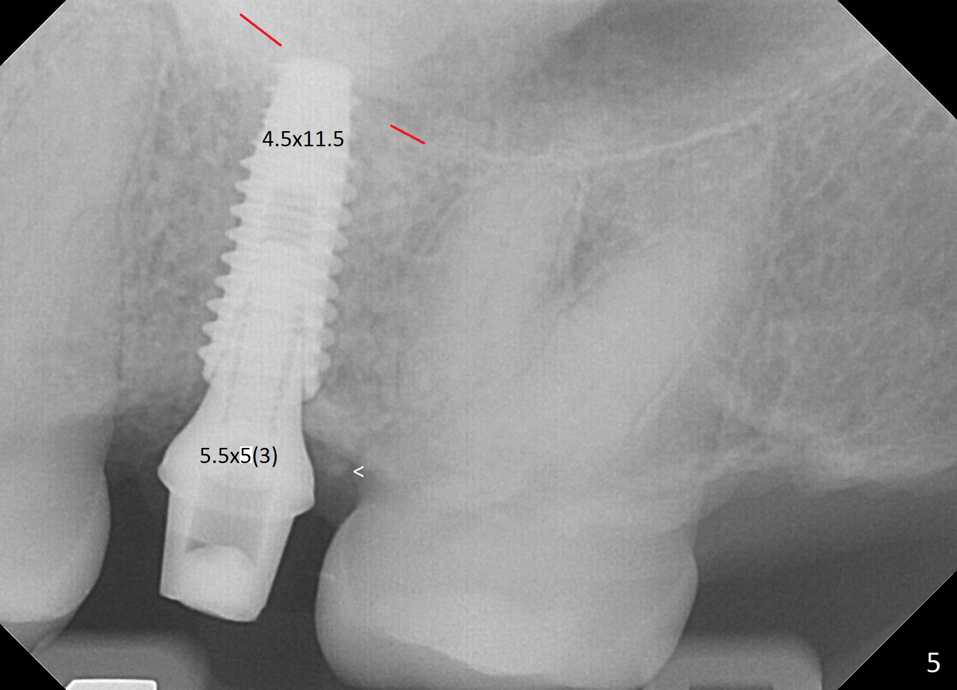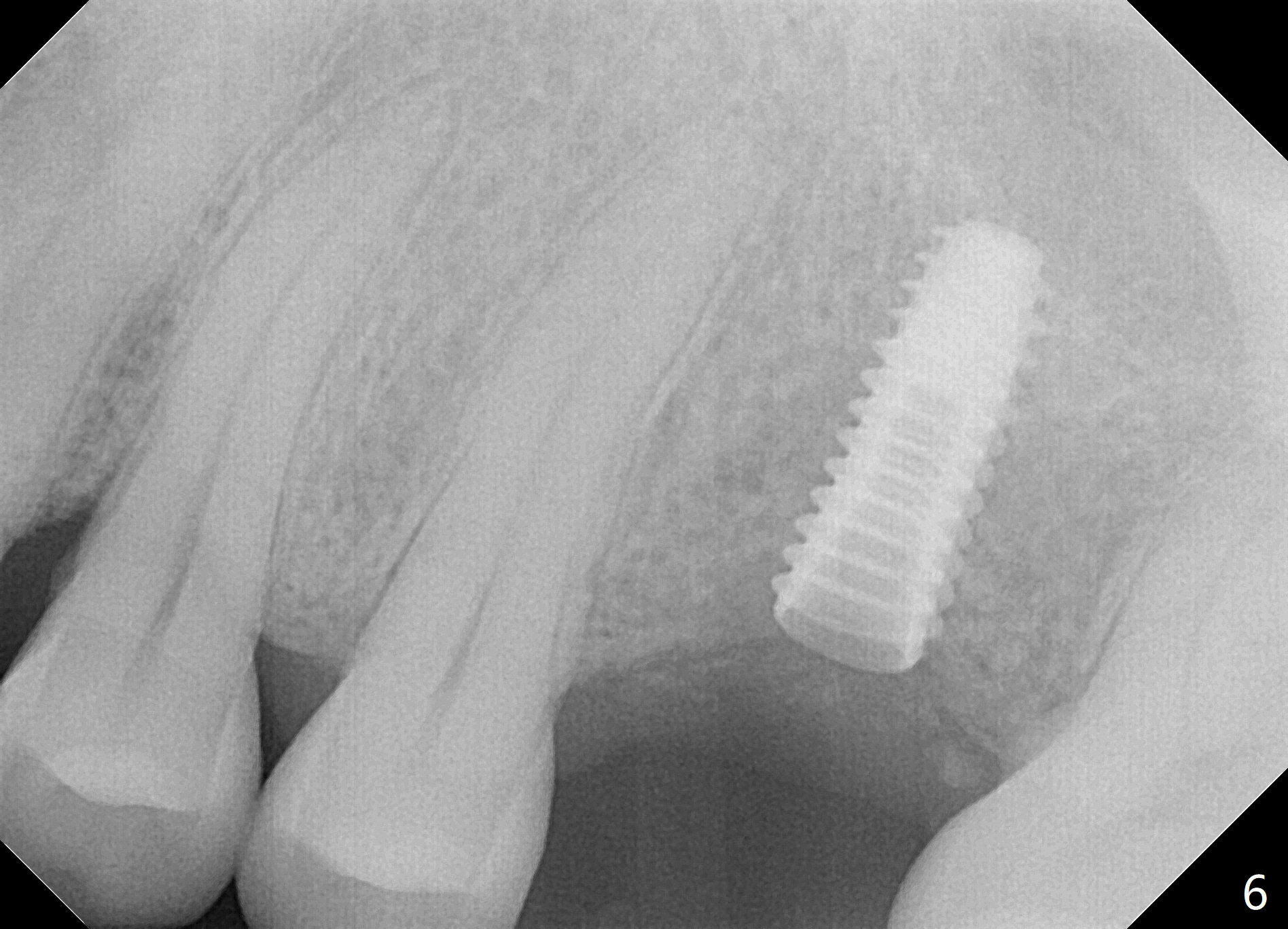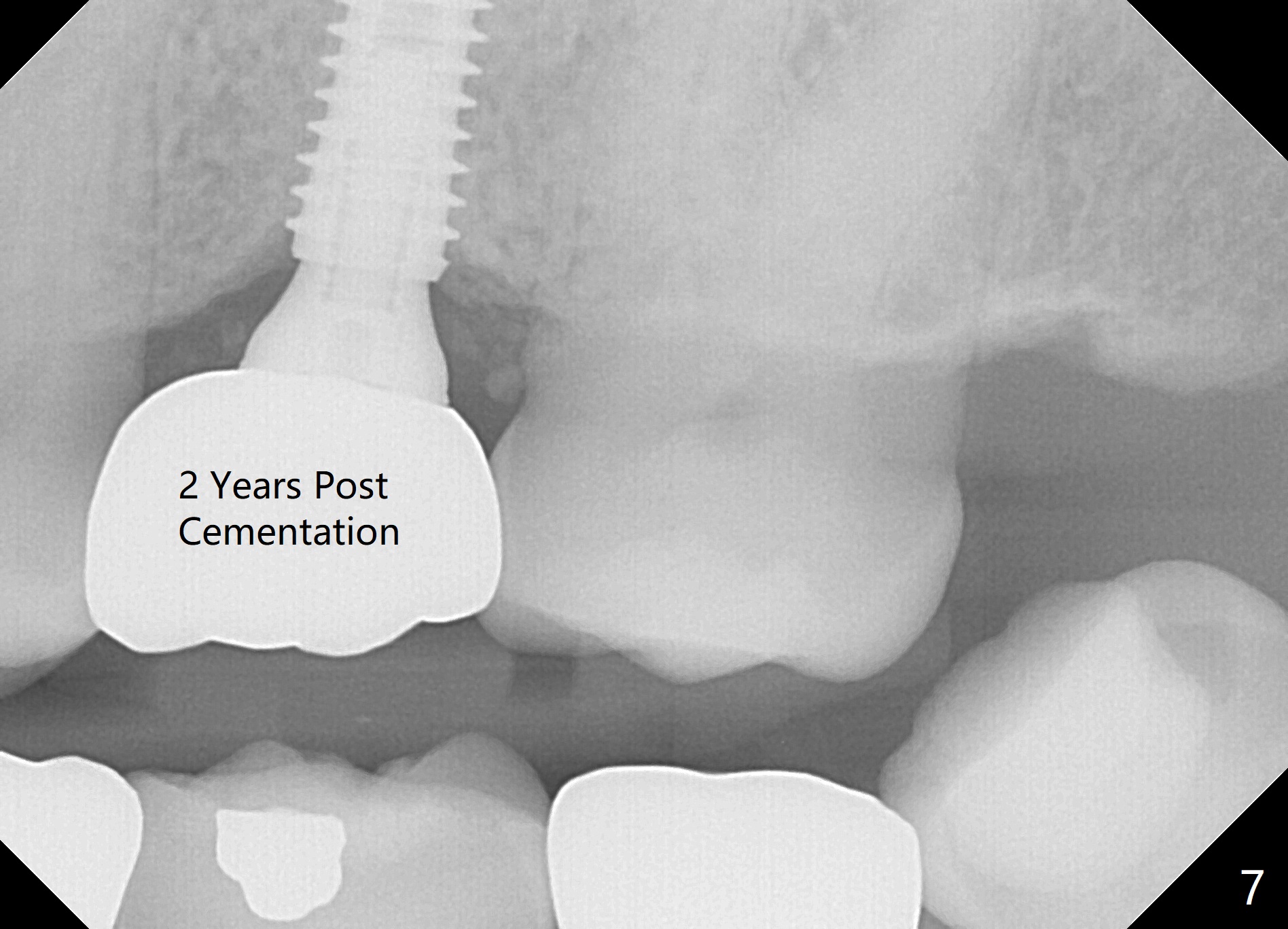 The edentulous area at #14 is moderately atrophic, After incision, the bone is too hard for #15 blade for bone expansion. Osteotomy is initiated with 1.2 mm drill, followed by insertion 1.3/2.3 mm bone expander (Fig.1). Use the same instruments are reused twice to change the trajectory (Fig.2,3). Finally Lindamann bur is utilized to move the osteotomy distally by ~ 2 mm; bone expansion continues until 2.4/3.7 mm expander for 13 mm with 50 Ncm (Fig.4). The last expander 3/4.4 mm barely enters the osteotomy for 6 mm. A 3.7 mm drill has to be used for 12 mm before placement of a 4.5x11.5 mm implant with >35 Ncm (Fig.5). A 5.5x5(3) mm abutment is placed with allograft (<) placed around the implant. Following suturing, periodontal dressing is applied around the implant. The abutment dislodges 3 months postop (Fig.6). Crown is delivered 3 weeks later. The abutment screw is retightened ~ 2 months later. He is a bruxer. The abutment screw is loose again <2 years post cementation (6 months post #18 screw retightenting and occlusal reduction), probably related to distal implant placement (Fig.7).