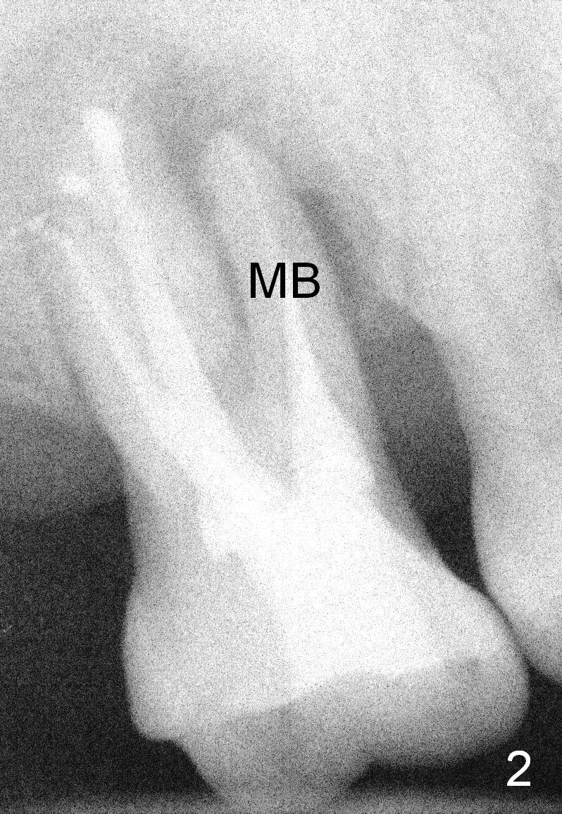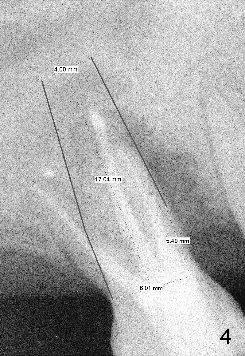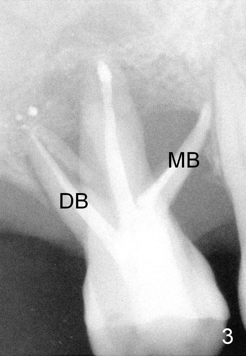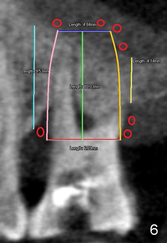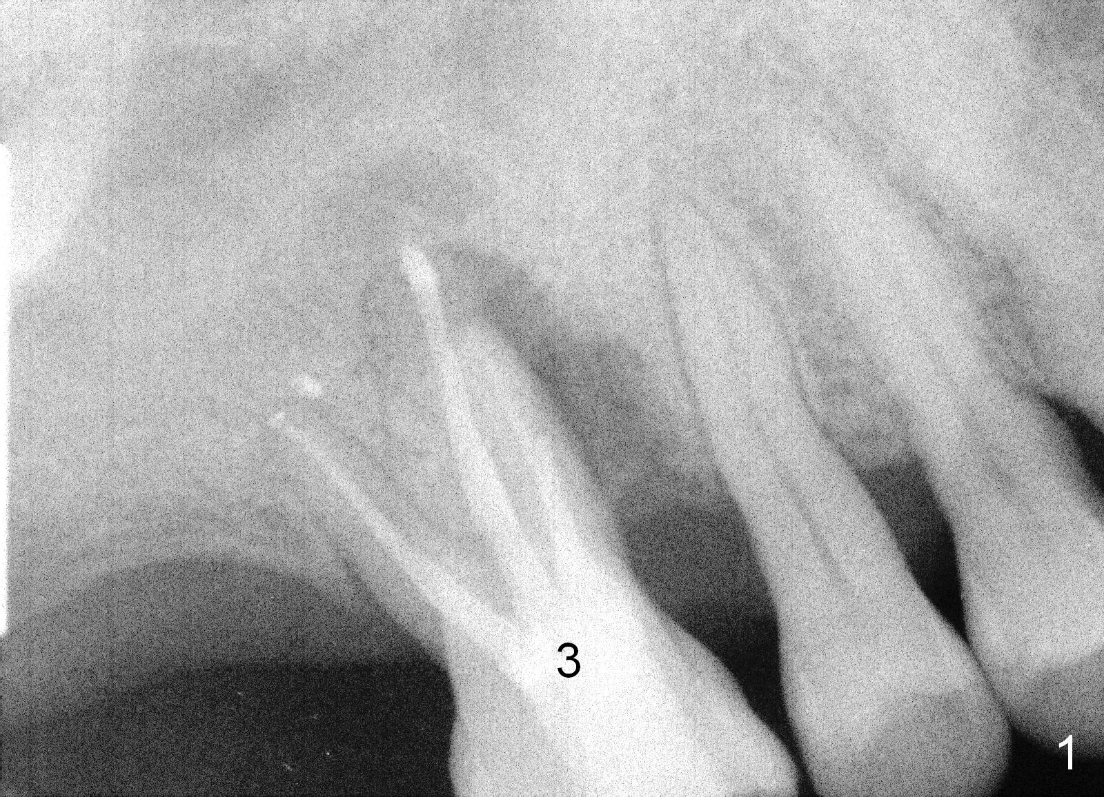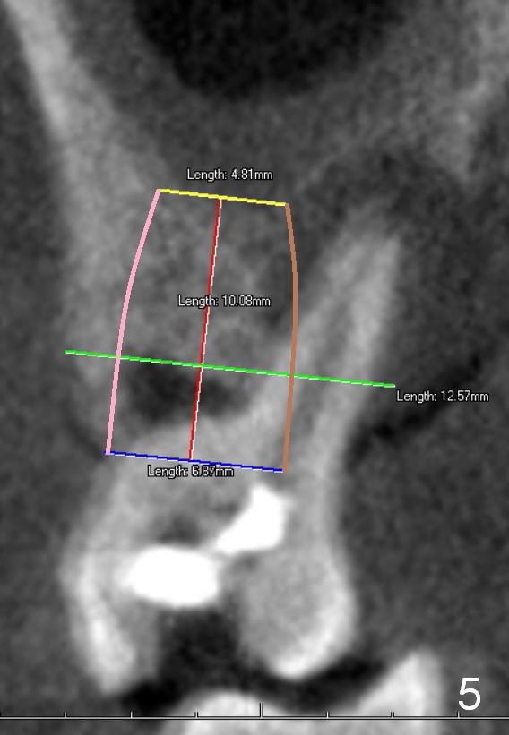Two years post RCT, there is radiolucency around the MB root of the tooth #3 (Fig.1,2). Eleven days later, there is acute infection associated with MB and DB root fracture (Fig.3). According to the X-ray taken 11 days earlier (Fig.1,4), a long tissue-level implant (6x17 mm) is suitable for the site. In accordance with CBCT (coronal (Fig.5) and sagittal (Fig.6) sections) taken prior to RCT, a short bone-level implant (6.9x10 mm) is a more reasonable choice.