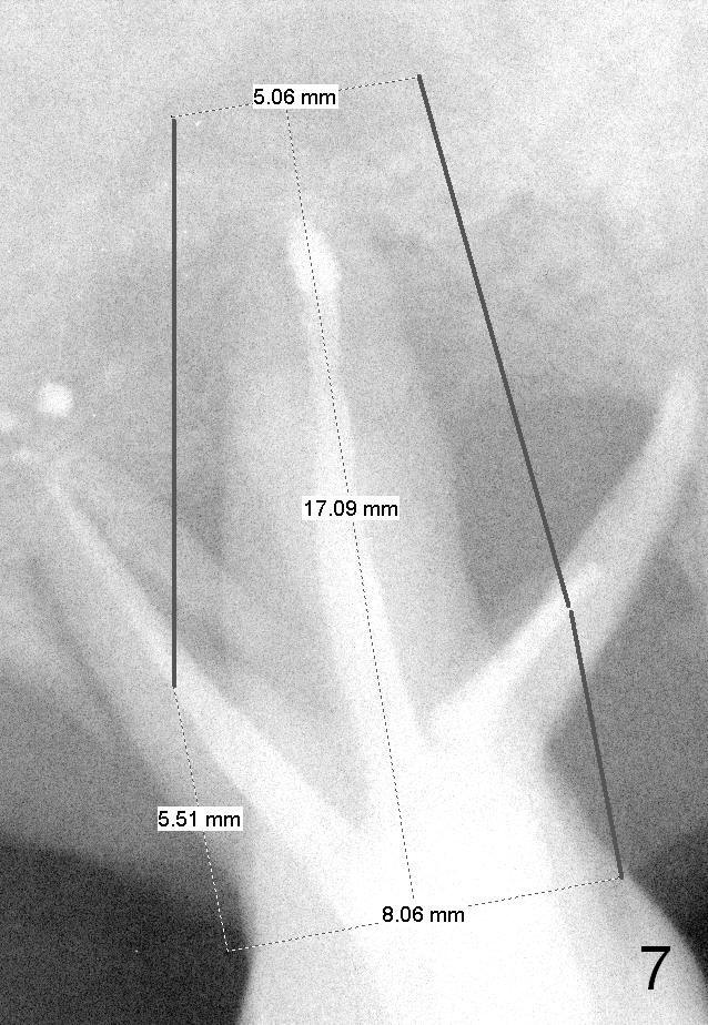 After extraction, the socket will be studied to determine where the bone is and where bony defects are for the site of the initial osteotomy. Start with 2 mm pilot drill or RT2, apparently ~ 6 mm depth, followed by reamers 2.5-3.5 mm and Tatum taps 4.5-7x17 mm (14 mm depth from gingival margin). Use a latch adapt with the torque wrench. Due to severe bone loss, the tap should not be too large (6 mm). If insertion torque is high and bone morphology is favorable, change to DIO taps and take necessary PAs to decide the length of the implant relative to the sinus floor and trajectory. If the depth is 10 mm or less, use SM; 12 mm UF. Based upon the most recent X-ray (Fig.3 with large lesion), the implant should be large and long (Fig.7: 7x17 mm).