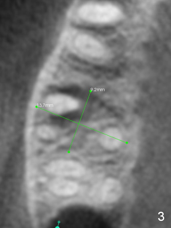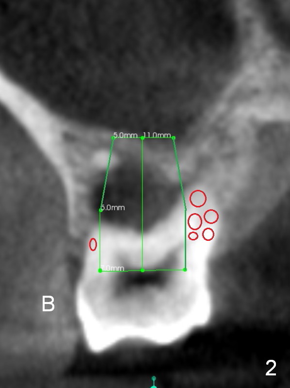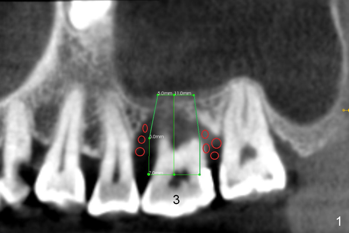 A 52-year-old lady (ZJ) has severe bone loss at #3 (Fig.1 (CT sagittal section)). After extraction, the socket will be treated with Metronidazole. A small amount of apical bone is available for primary stability; the bone density is also low (300-500 Hounsfield Units, Fig.3 (axial section)). Use RT2,3 for creating osteotomy and bone condensation, followed by 4.5-7x14 mm taps (11 mm deep; gingival margin). Prior to bone grafting (Fig.1,2 (coronal section) red circles), apply Endogain against the root surface of the neighboring teeth.