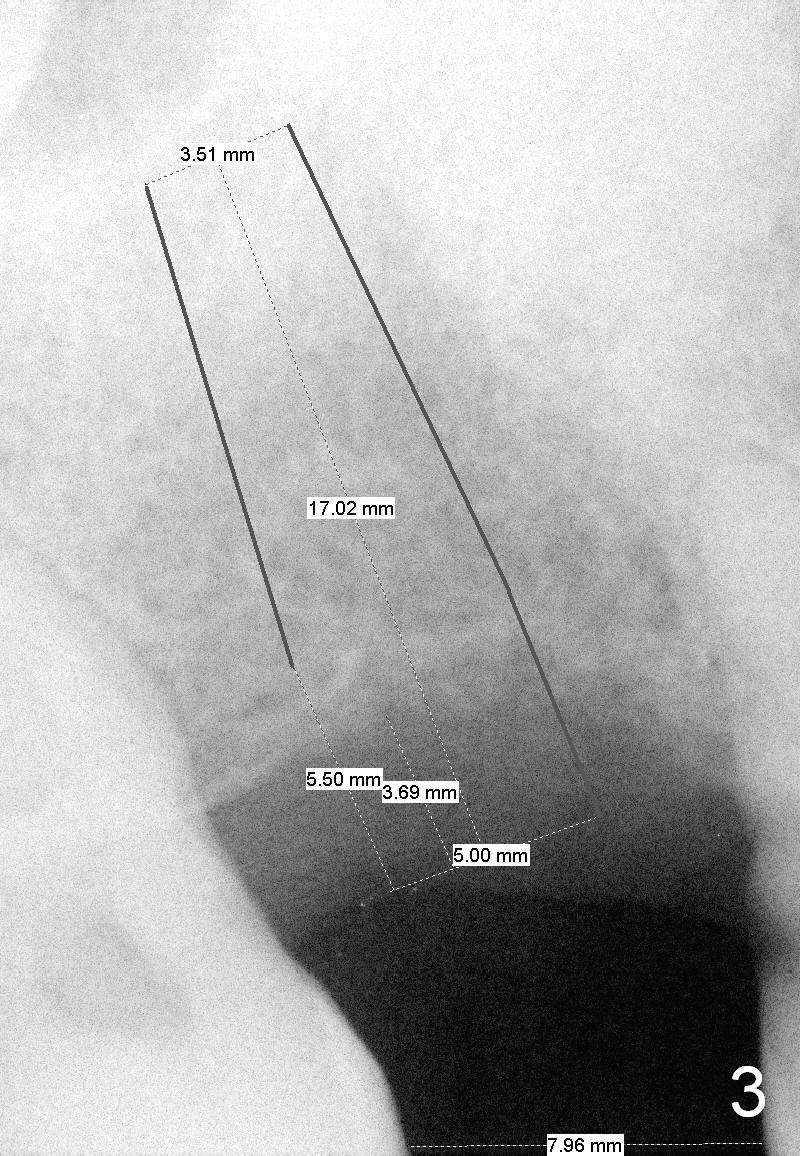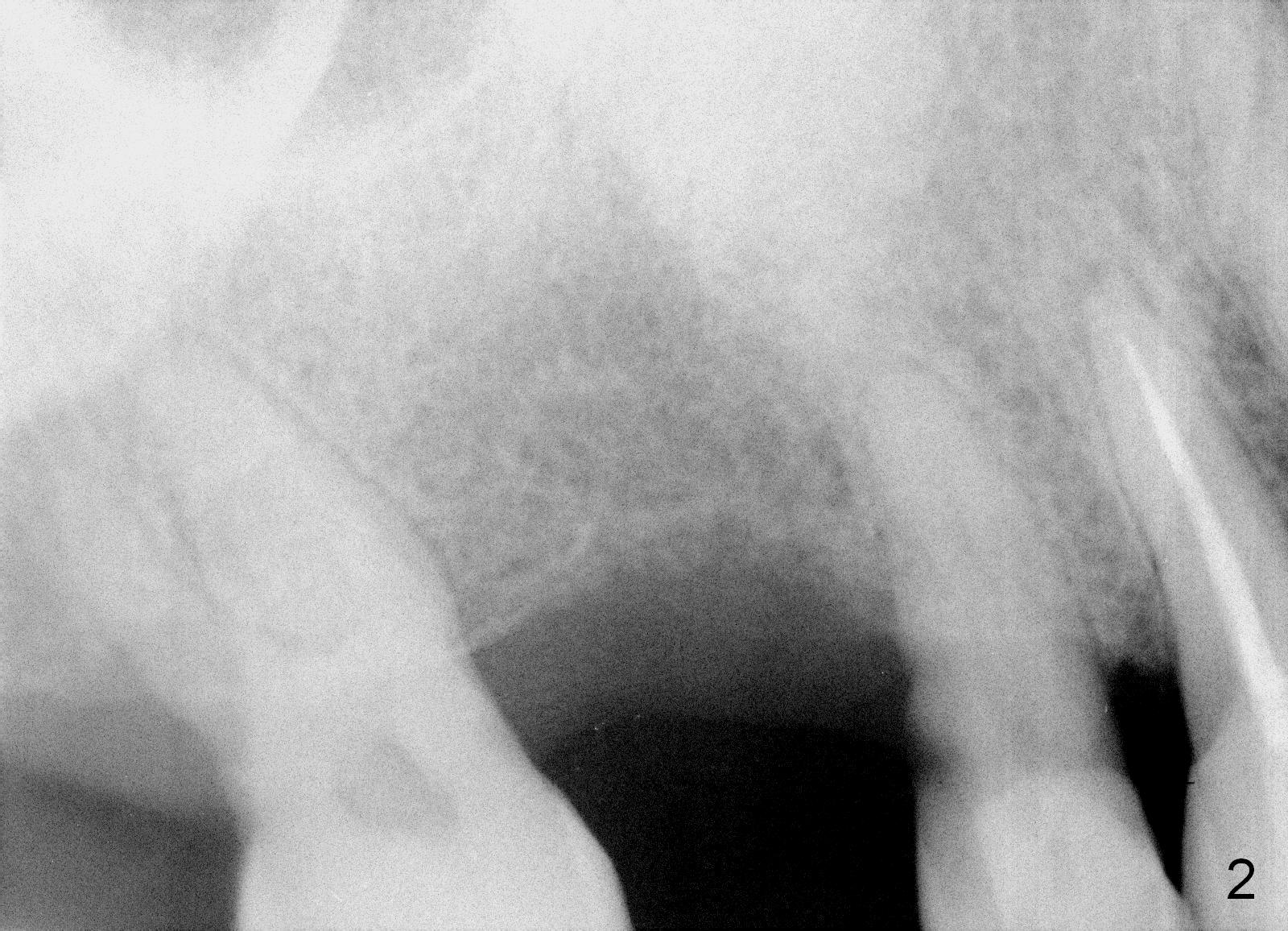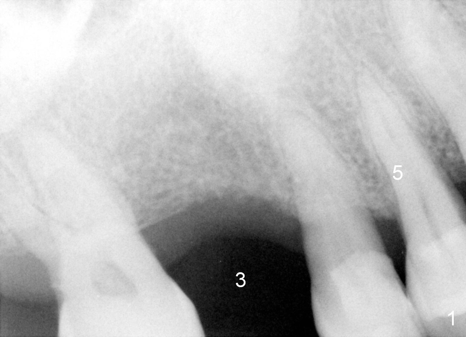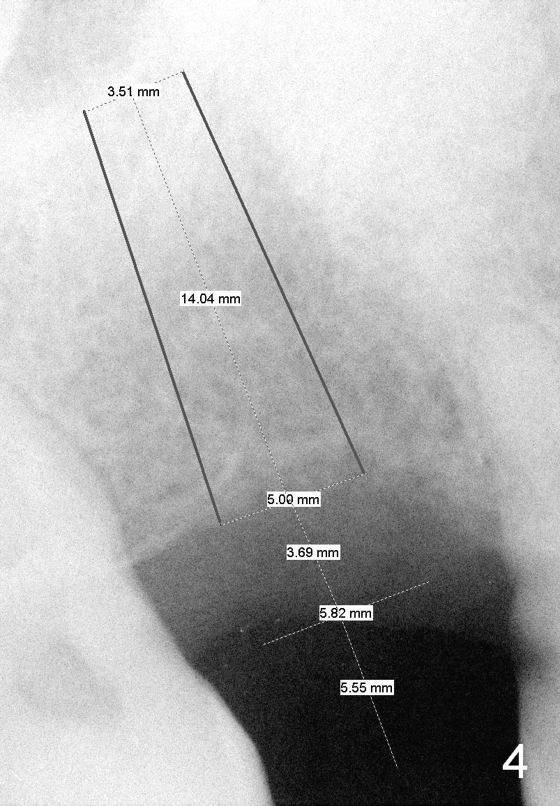 A 63-year-old man has lost the tooth #3 for long time: the first PA taken in our office is 5 years ago (Fig.1) before the tooth #5 received root canal therapy (Fig.2). The mesiodistal space of the edentulous is narrow, 8 mm (Fig.1) as compared to 10-11 mm for normal space.