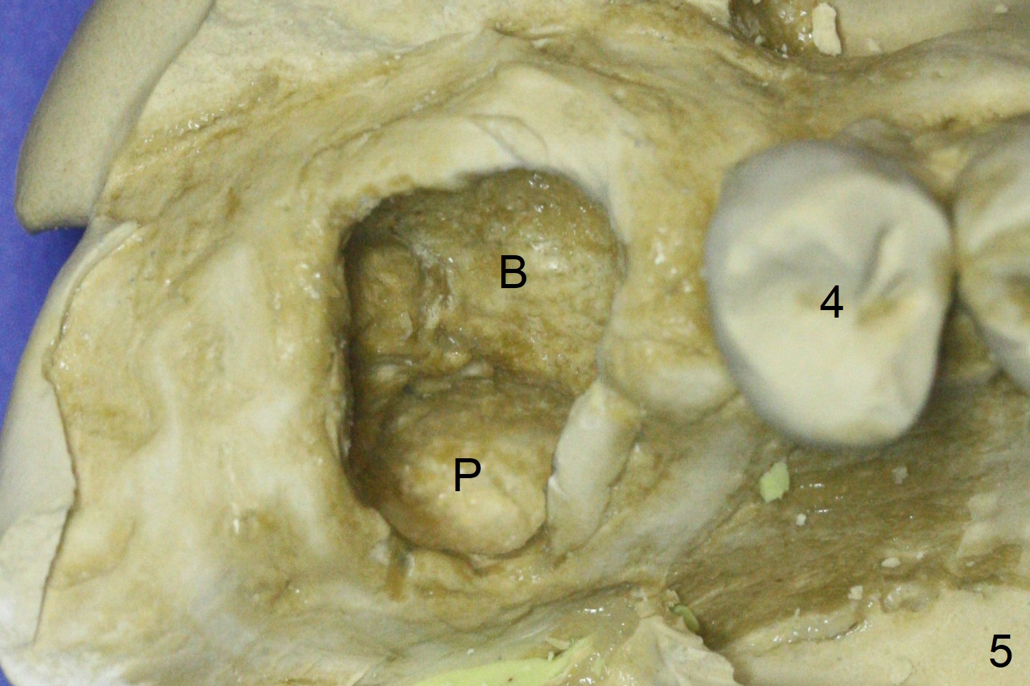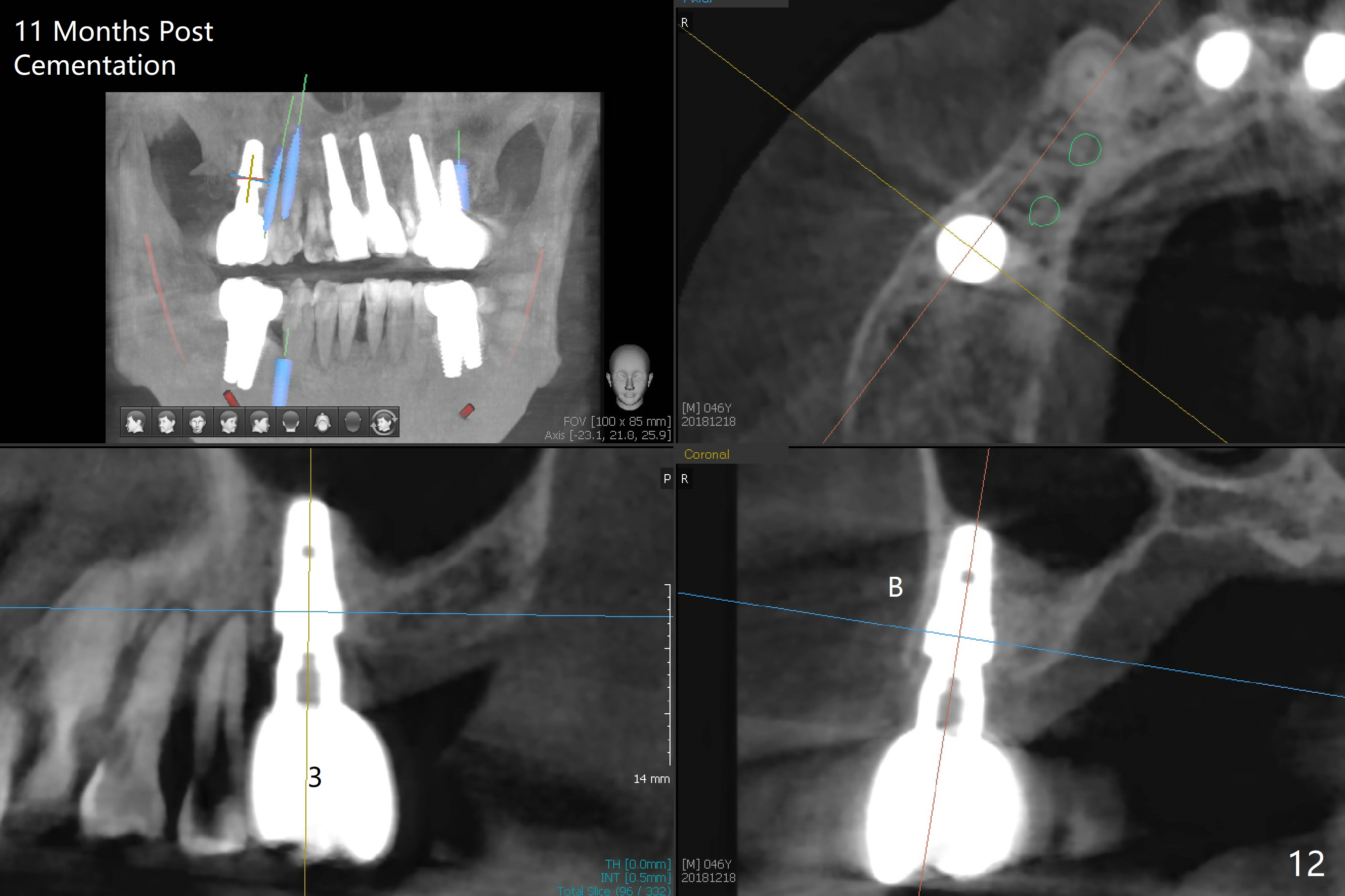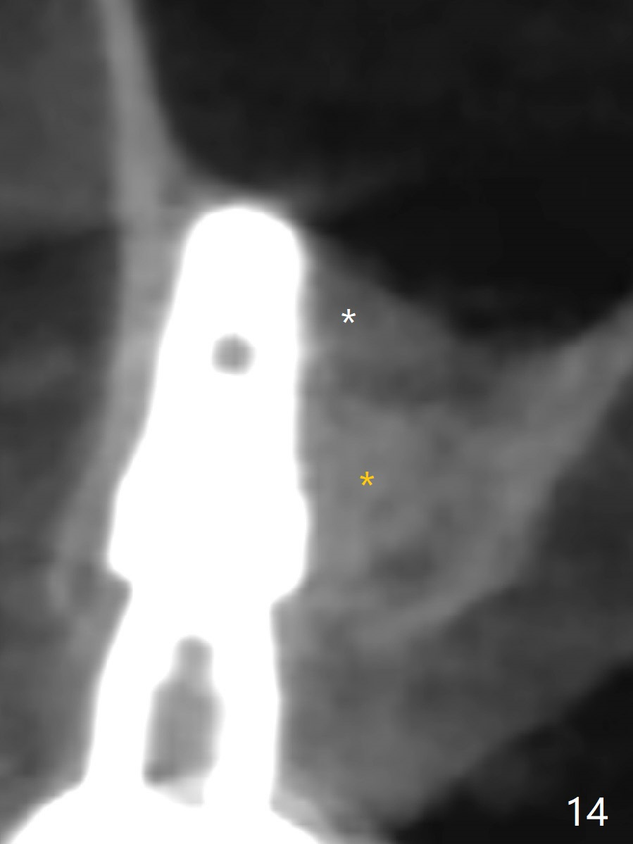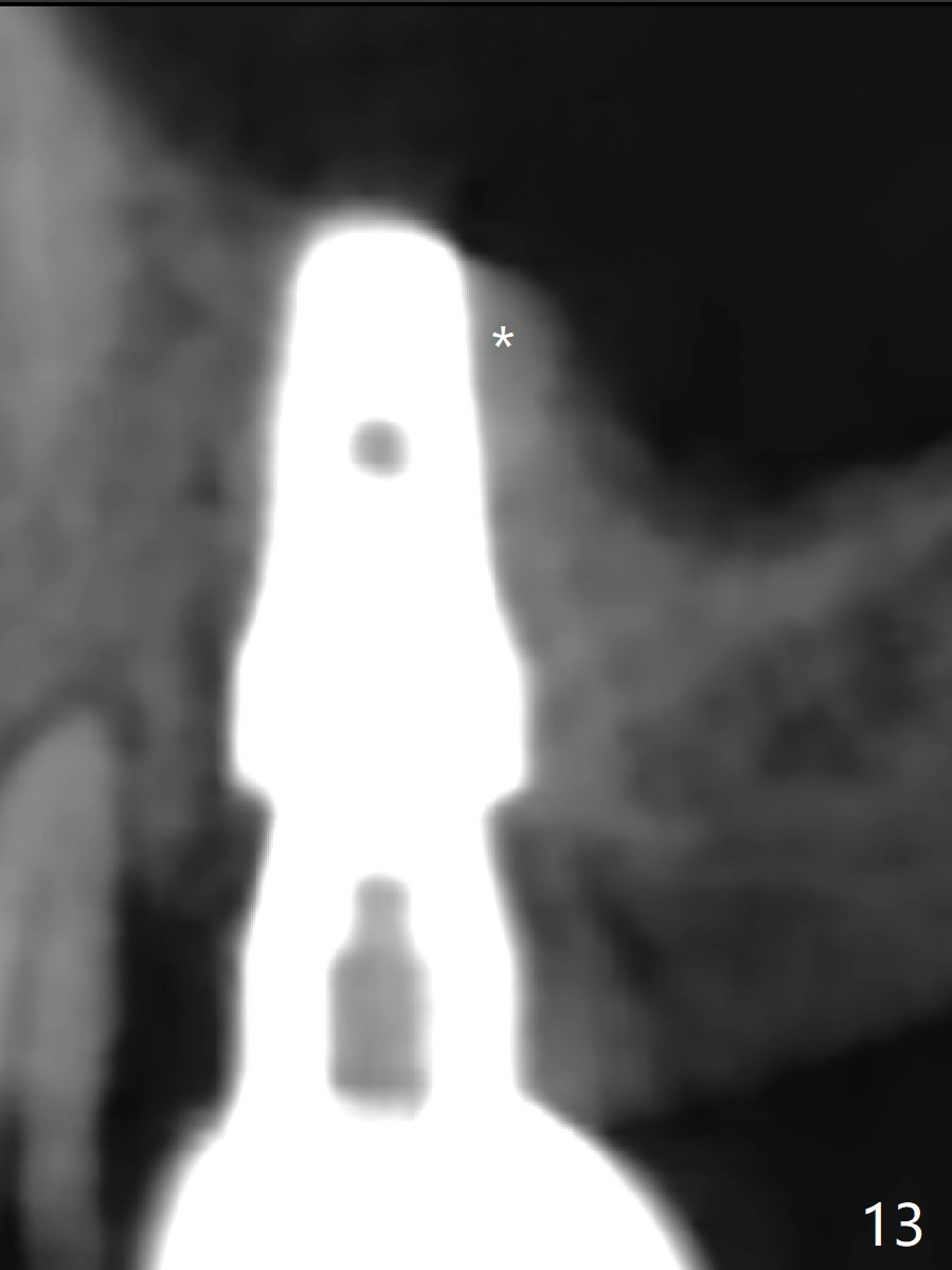 After extraction of the tooth #3 (Fig.1,2), the palatal socket (P) is as wide as the buccal one (B; Fig.3,4 (socket impression)), as compared to the roots), suggesting bone loss is more severe palatally than buccally. There is a circular area in the buccal slope of the palatal socket, in which the bone looks thin (purplish: presumably the sinus membrane underneath, Fig.5,7 (blue circle)). It appears that the palatal slope of the buccal socket (Fig.6, 7 red dashed line) is the most appropriate site for osteotomy (Fig.8). Prior to inserting 5.3 mm tap drill (Fig.9), the mesiopalatal region of the osteotomy (corresponding to the blue circle in Fig.7) perforates without sinus membrane tear. A small piece of Osteogen plug is placed in the perforation before inserting a 5.3x10 mm SM implant (Fig.10,11). Following placement of another piece of Osteogen plug in the palatal socket and of a 4.8x7(6) mm abutment, mineralized cortical and cancellous bone is placed (*). Collagen plug and an immediate provisional are used to close the socket opening. CT taken 11 months post cementation shows that the implant is placed within bony boundary, although buccally (Fig.12 B). Bone graft seems to heal in the sinus (Fig.13 (sagittal section),14 (coronal section) white * (Osteogen plug) and in the socket (brown * (allograft and Osteogen)).