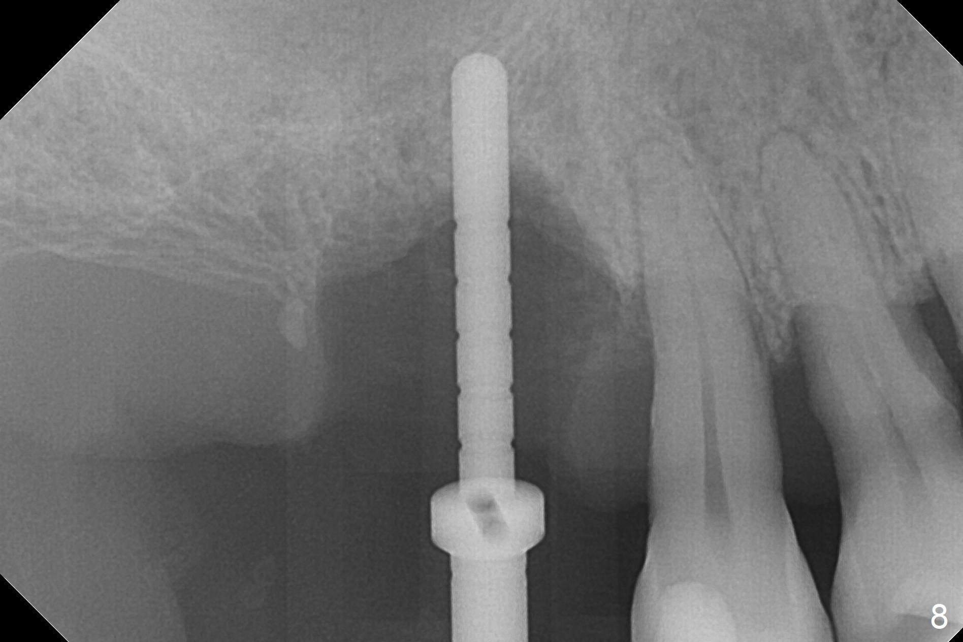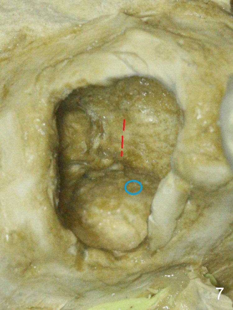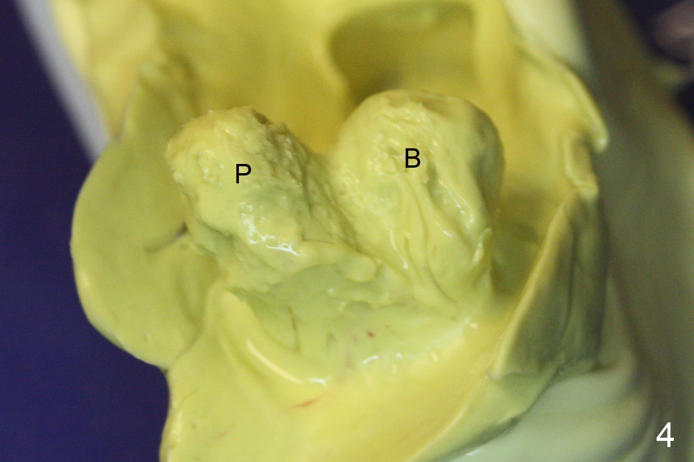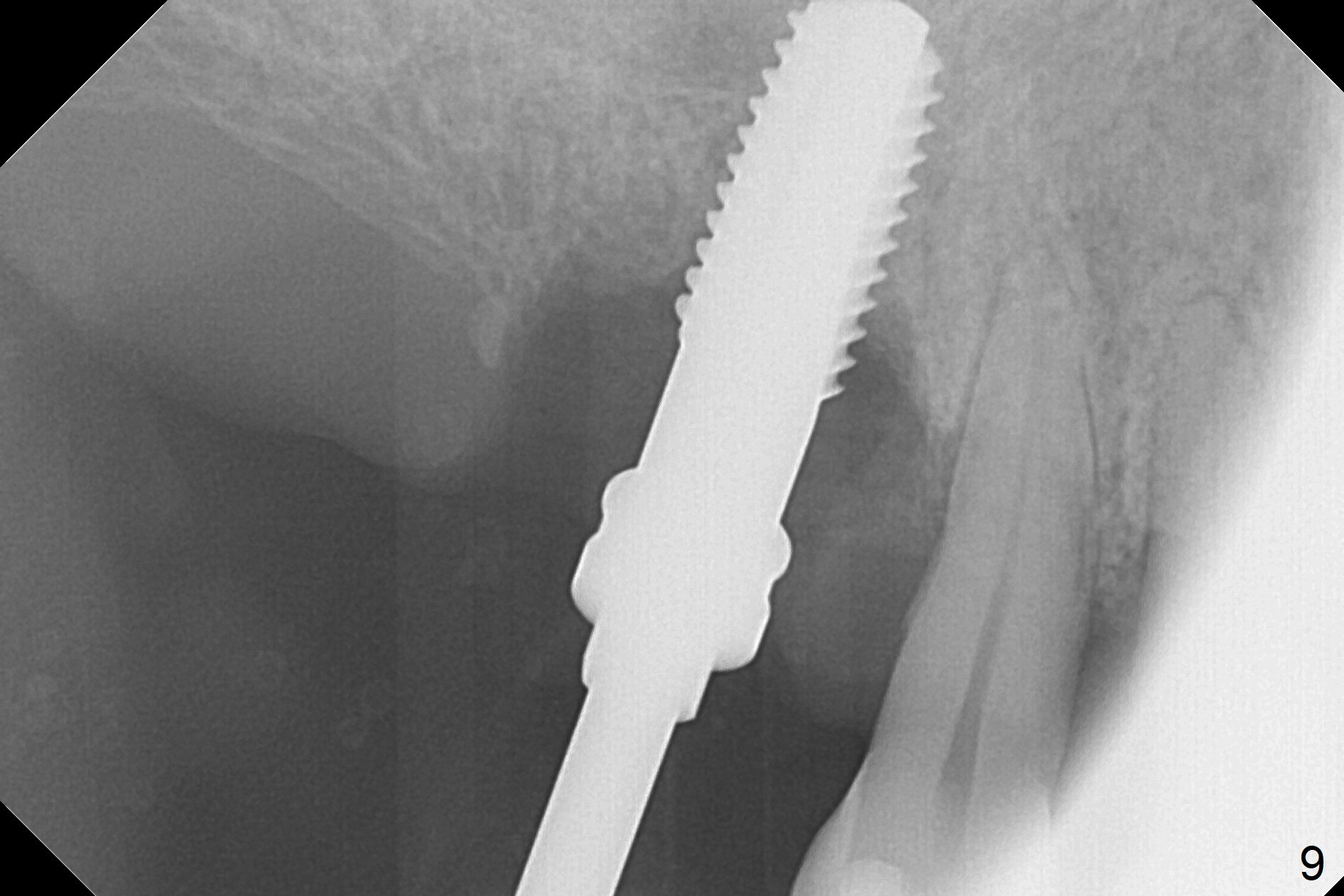 After extraction of the tooth #3 (Fig.1,2), the palatal socket (P) is as wide as the buccal one (B; Fig.3,4 (socket impression)), as compared to the roots), suggesting bone loss is more severe palatally than buccally. There is a circular area in the buccal slope of the palatal socket, in which the bone looks thin (purplish: presumably the sinus membrane underneath, Fig.5,7 (blue circle)). It appears that the palatal slope of the buccal socket (Fig.6, 7 red dashed line) is the most appropriate site for osteotomy (Fig.8). Prior to inserting 5.3 mm tap drill (Fig.9), the mesiopalatal region of the osteotomy (corresponding to the blue circle in Fig.7) perforates without sinus membrane tear. A small piece of Osteogen plug is placed in the perforation before inserting a 5.3x10 mm SM implant (Fig.10,11). Following placement of another piece of Osteogen plug in the palatal socket and of a 4.8x7(6) mm abutment, mineralized cortical and cancellous bone is placed (*). Collagen plug and an immediate provisional are used to close the socket opening. CT taken 11 months post cementation shows that the implant is placed within bony boundary, although buccally (Fig.12 B). Bone graft seems to heal in the sinus (Fig.13 (sagittal section),14 (coronal section) white * (Osteogen plug) and in the socket (brown * (allograft and Osteogen)).