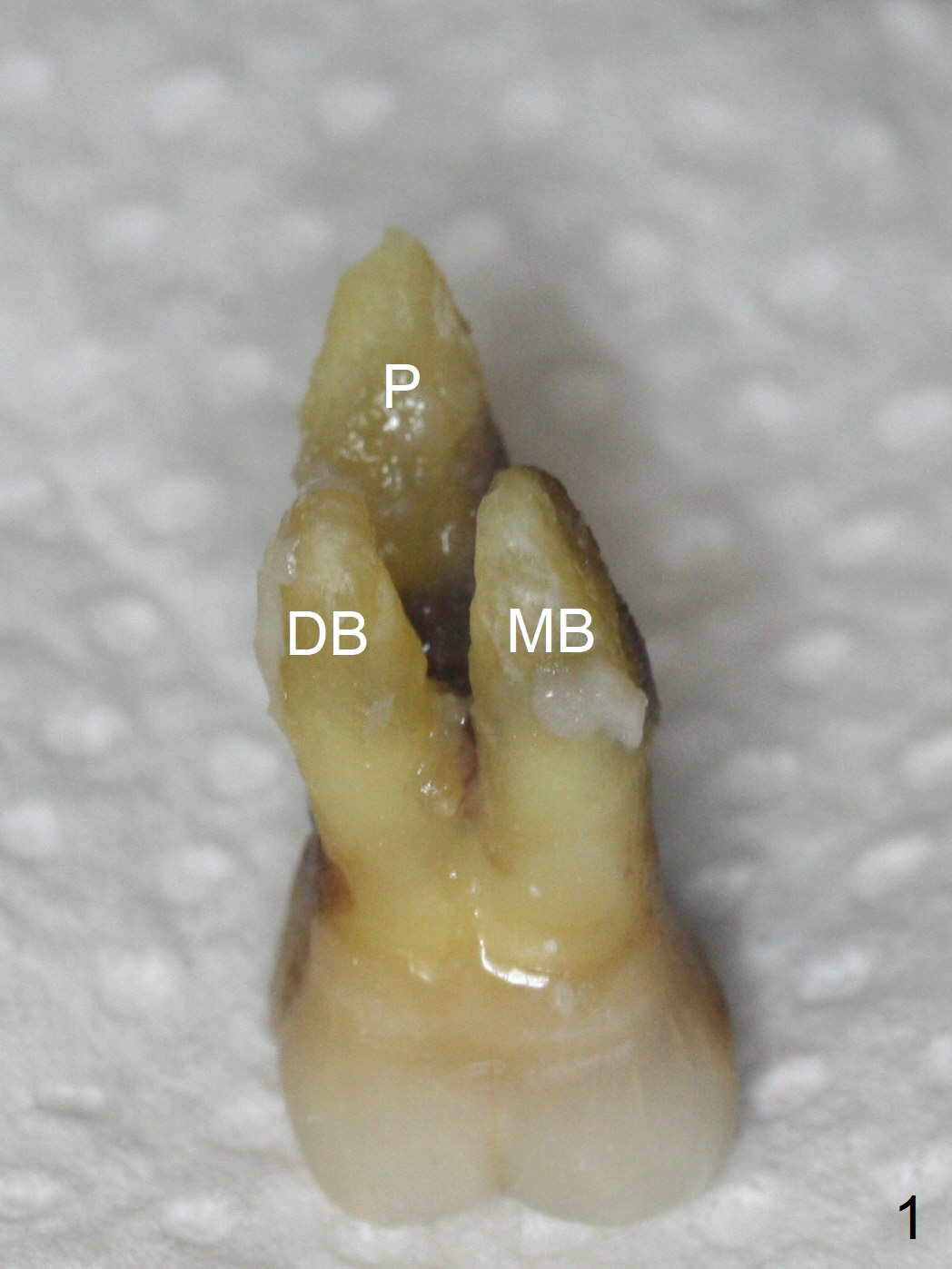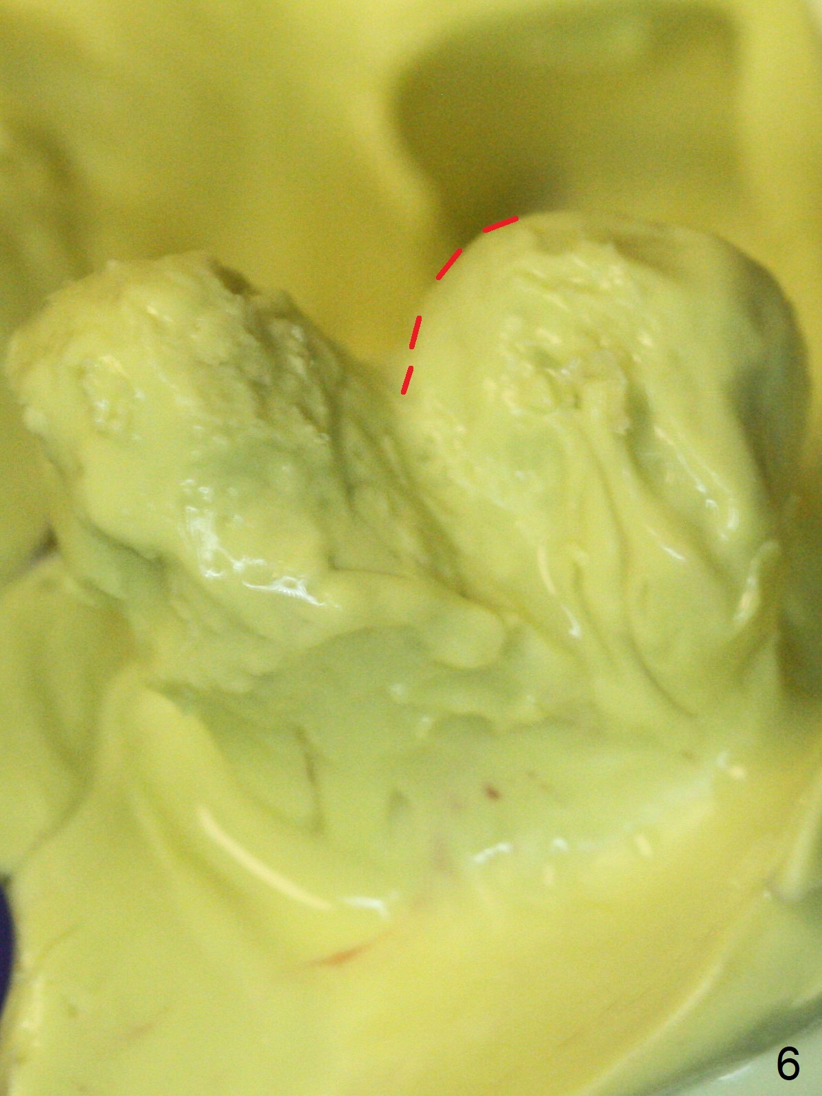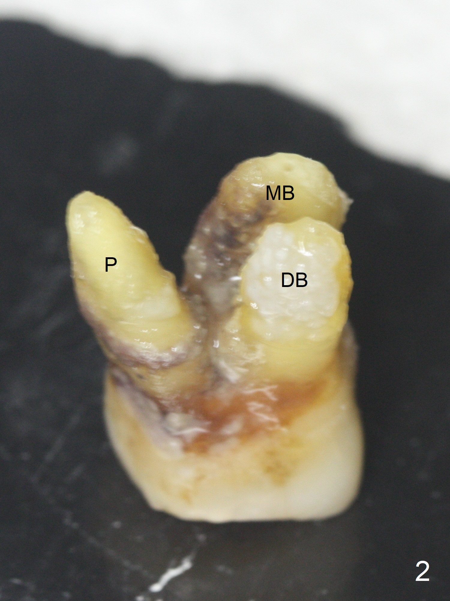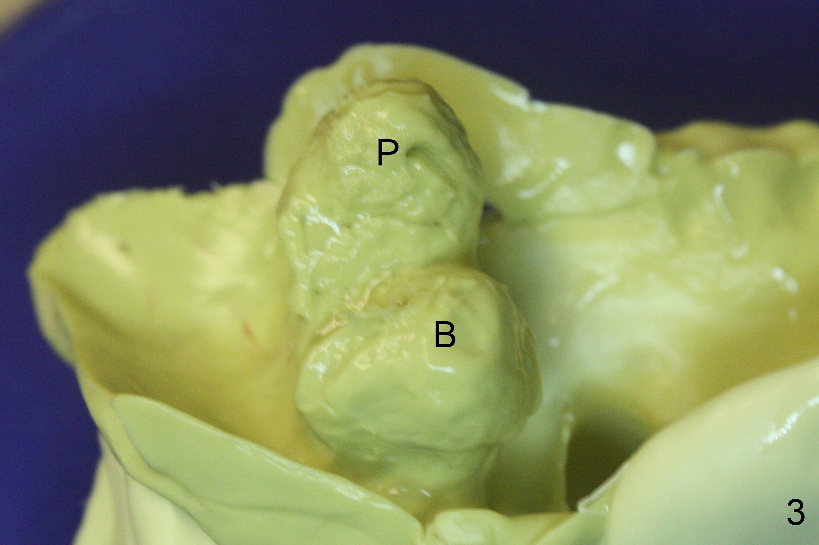 After extraction of the tooth #3 (Fig.1,2), the palatal socket (P) is as wide as the buccal one (B; Fig.3,4 (socket impression)), as compared to the roots), suggesting bone loss is more severe palatally than buccally. There is a circular area in the buccal slope of the palatal socket, in which the bone looks thin (purplish: presumably the sinus membrane underneath, Fig.5,7 (blue circle)). It appears that the palatal slope of the buccal socket (Fig.6, 7 red dashed line) is the most appropriate site for osteotomy (Fig.8). Prior to inserting 5.3 mm tap drill (Fig.9), the mesiopalatal region of the osteotomy (corresponding to the blue circle in Fig.7) perforates without sinus membrane tear. A small piece of Osteogen plug is placed in the perforation before inserting a 5.3x10 mm SM implant (Fig.10,11). Following placement of another piece of Osteogen plug in the palatal socket and of a 4.8x7(6) mm abutment, mineralized cortical and cancellous bone is placed (*). Collagen plug and an immediate provisional are used to close the socket opening. CT taken 11 months post cementation shows that the implant is placed within bony boundary, although buccally (Fig.12 B). Bone graft seems to heal in the sinus (Fig.13 (sagittal section),14 (coronal section) white * (Osteogen plug) and in the socket (brown * (allograft and Osteogen)).