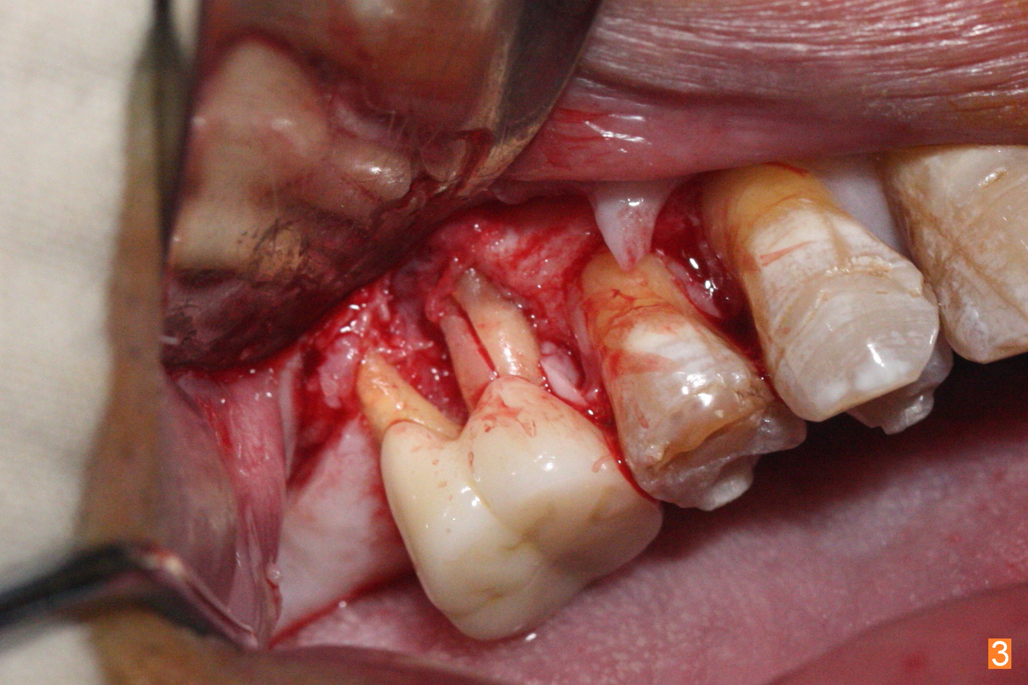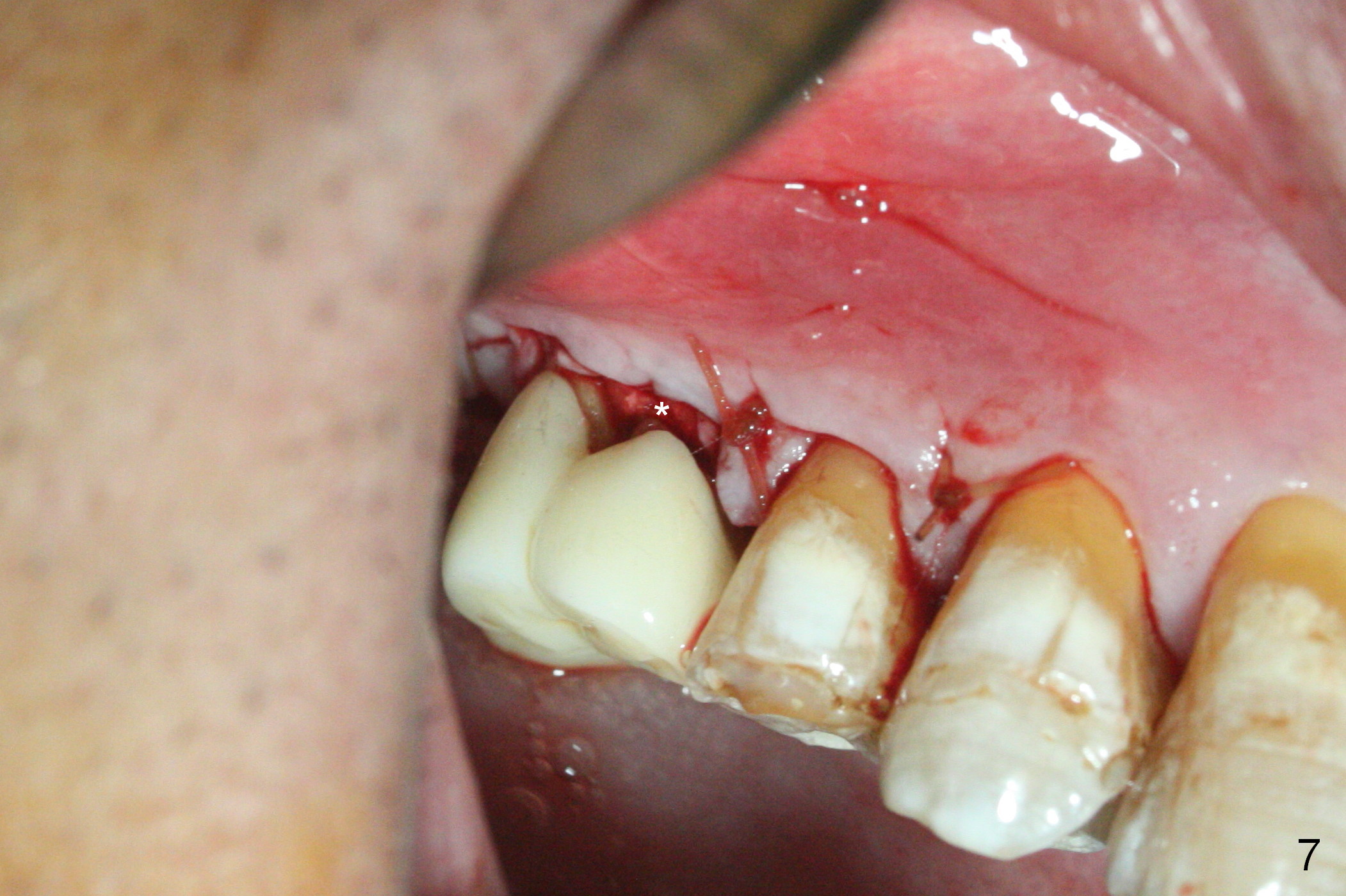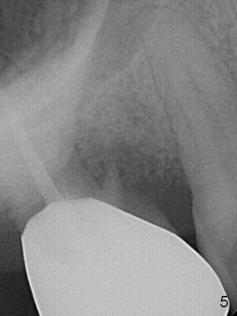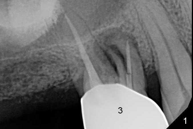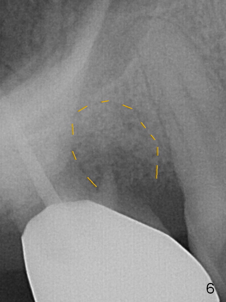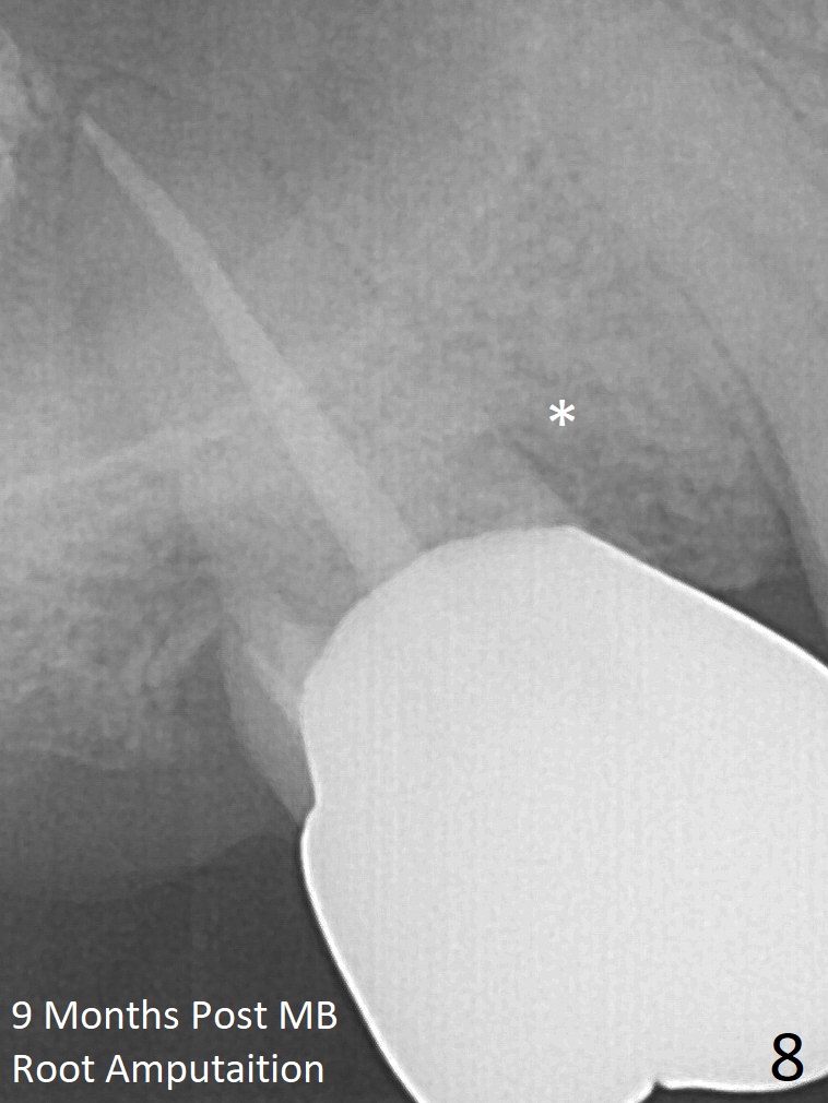 A 56-year-old man has discomfort associated with the tooth #3 one year and a half after root canal therapy (Fig.1: mesiobuccal root vertical fracture). Since an implant is just placed at #19 and another one will be encouraged to be placed at #2 (Fig.2), root amputation may be a valid treatment modality (Fig.3,4). After debridement and Clindamycin topical application, allograft/Osteogen is placed (Fig.5,6 (dashed line)), followed by Osteogen plug (Fig.7 *). Discomfort apparently shifts to the distobuccal root 9 months postop, while the MB defect seems to heal (Fig.8 *). Extraction and implant is expected.