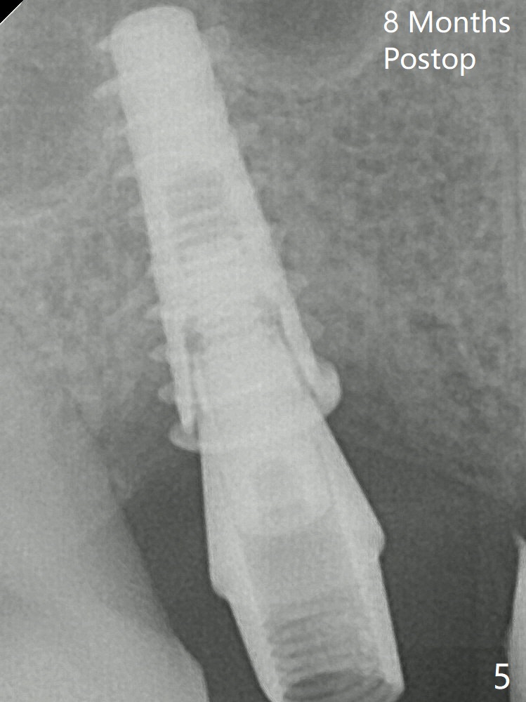 Following the last drill (3.8 mm) for 11 mm, a 4.5x11 mm dummy implant is placed 2 mm subgingival (Fig.2; *: space of the palatal socket). In fact the sinus lift is done by the implant, since the bone plug after Magic Drill is present in the apical portion of the osteotomy when the last drill is finished prior to implant placement. After the dummy implant is removed, the definitive one (the same size) is placed with >50 Ncm, followed by placement of a 4.5x4(3) mm abutment and VeraGraft mixed with autogenous one (Fig.3 *). VeraGraft granules are finer than Vanilla one (.25-1 mm vs. .5-1 mm). There is mild crestal bone loss nearly 8 months postop (Fig.5). An angled abutment (5x15 degree, 3 mm cuff) is used before impression.