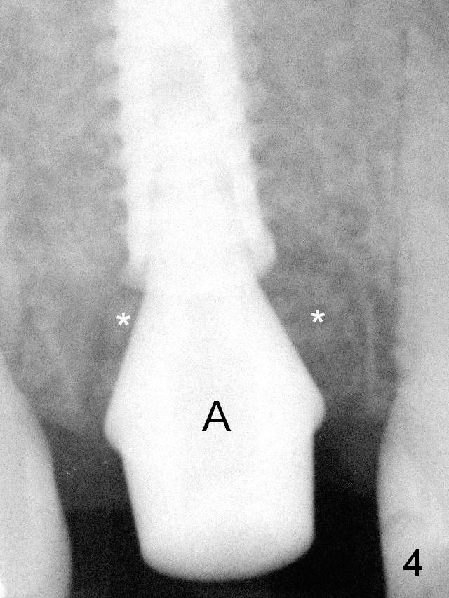The last drill is 4.3 mm, followed by 4.8 mm Magic Expander since the palatal wall of the osteotomy is thin after the last drill. A 5x13 mm IBS implant is placed with ~ 45 Ncm. The apical portion of the 3 sockets is filled with Osteogen plug and the coronal portion with autogenous bone (harvested from MD), mixed with allograft and Osteogen (Fig.4 * as well as collagen plug in the most superficial portion of the sockets). A 6.5x4(4) mm pair abutment (Fig.4 A) is placed to hold an immediate provisional in place.