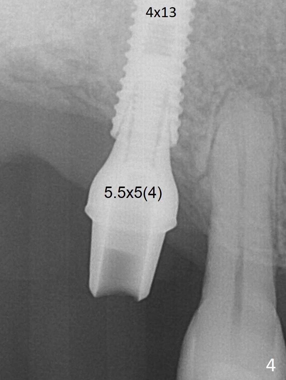 With further seating of the implant, a 5.5x5(4) mm abutment is used (Fig.4), which closes the access. No suture is warranted. An immediate provisional is fabricated for the patient's comfort and psychological effect. In fact, the abutment cuff changes to 5 mm prior to temporarization. There appears no bone loss <4 months postop (Fig.5). The margin is prepped except mesial prior to impression.