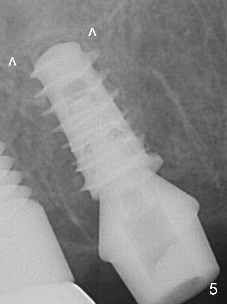 Prior to placement of 5.5x9 mm IBS implant (~ 35 Ncm, Fig.5), a piece of Osteogen plug is inserted into the osteotomy for repair of the perforation. The final implant is also shy of the sinus floor (^). The Osteogen plug is apparently placed underneath the sinus floor so that it should be able to repair hard and soft tissue defects. The remaining sockets are mainly filled with Osteogen plug, while the implant plateau is covered by autogenous bone and Osteogen. A 6.5x4(3) mm abutment is placed for an immediate provisional.